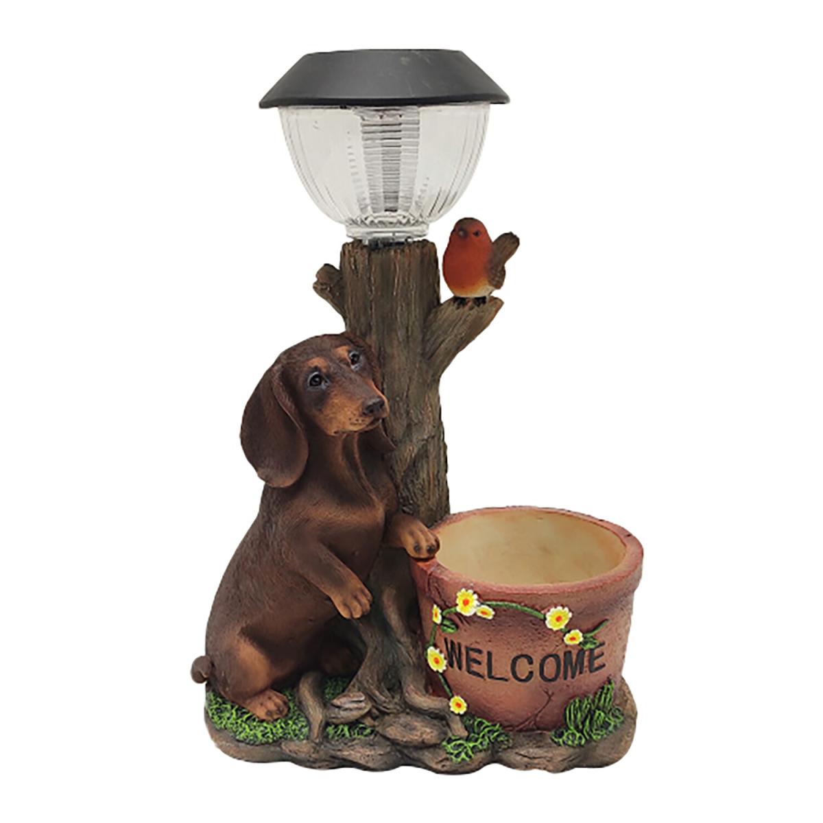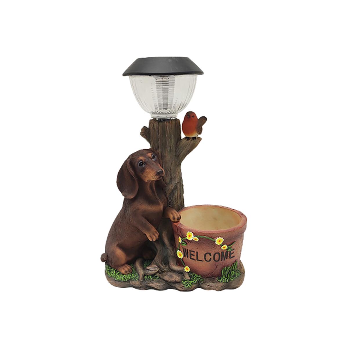 Featuring a cute sausage dog sat next to a tree trunk, the Solar Dachshund Welcome Light is the perfectly adorable way to create an inviting vibe in your garden. The flower pot has the word 'WELCOME' across it, wound with sweet yellow flowers, assuring all that visit your garden that they should feel at home here. At the top of the ornamental light, a solar-powered lantern is set, which will automatically turn on at dusk to keep your garden beautifully welcoming even once the sun has set.
