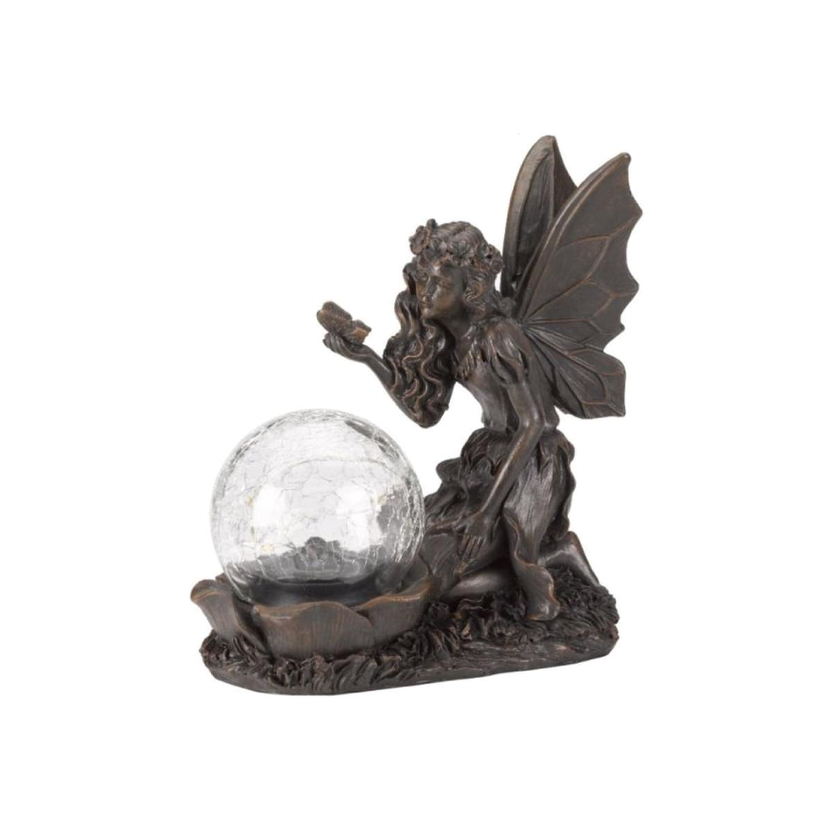 This charming hand painted Gazing Fairy garden ornament with colour changing LED crackle glass ball charges in direct sunlight and will brighten up any outdoor space. Crafted with care from durable polyresin and finished in a vintage bronze look, this stunning Solar Figure will stand up the elements while providing a warm cosy glow all year round. Ideal for patios, lawns and borders. Solar Fairy LED Ornament - Brown/Bronze