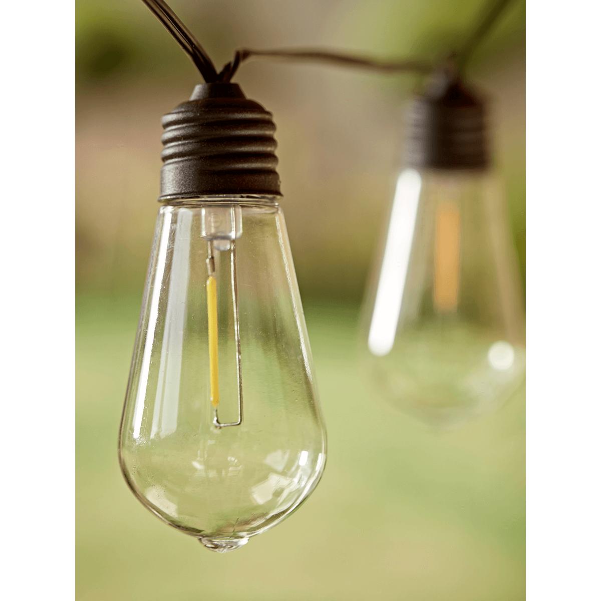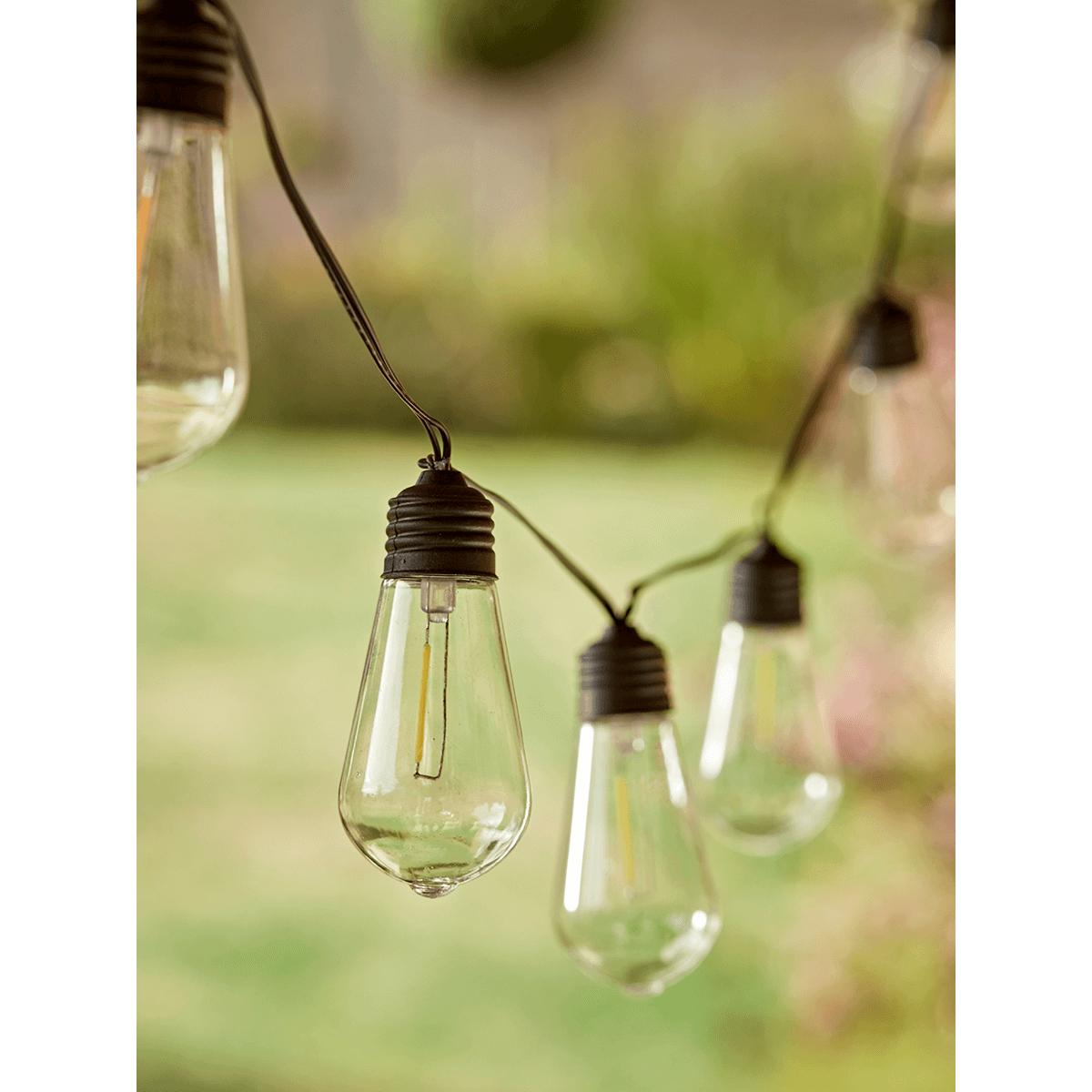 Inspired by vintage Edison-style bulbs for a stylish touch to your outdoor space, our solar-powered festoon lights are perfect for draping along a fence or pergola. Each set is powered by a replaceable solar battery, with a black cable and clear glass drop-shaped bulbs for an elegant finish.