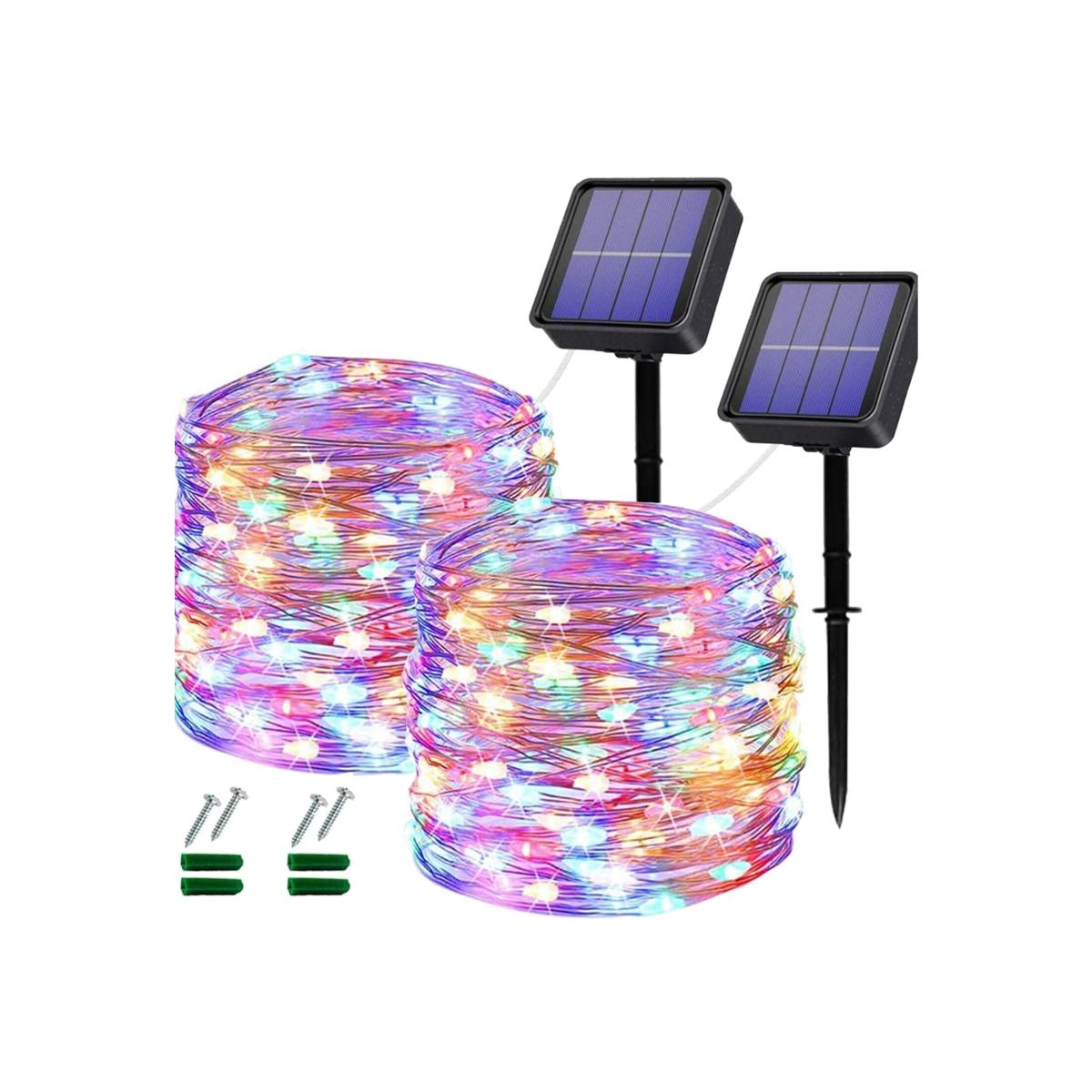 Bring your outdoor space to life with this 2 pack solar powered garden light set. Featuring 240 bright multicolor LEDs across 80 feet, these flexible fairy lights are perfect for decorating trees, patios, fences or gazebos. With 8 lighting modes, waterproof design and auto on off function, they offer long lasting charm for garden parties, weddings or festive Christmas nights. Solar Garden Lights Colorful Outdoor - Multi