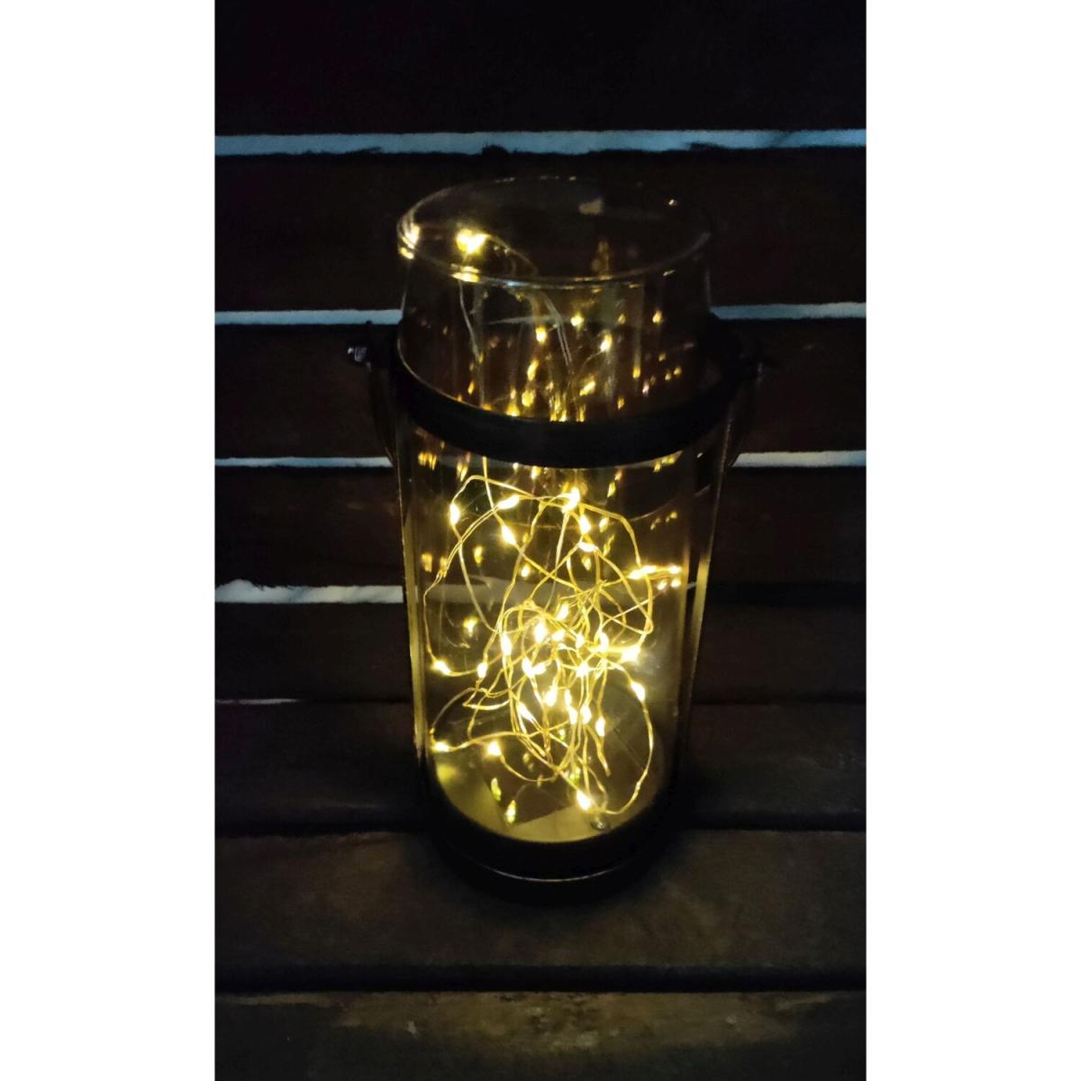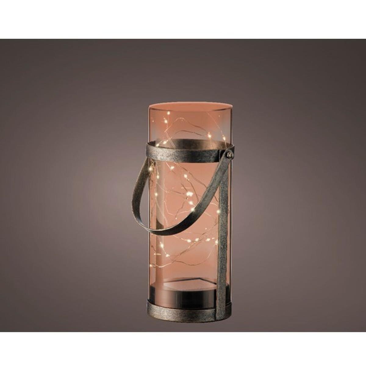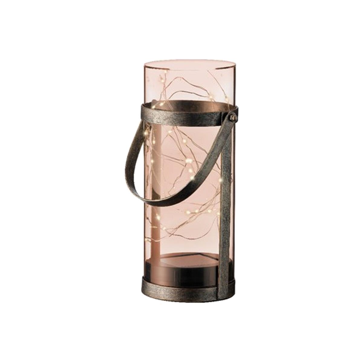 Lumineo amber solar lantern. This elegant amber solar lantern illuminates with a warm white light creating a warm and welcoming atmosphere to your outdoor space. Filled with 30 micro LED wire lights, which will give up to 6 hours of active light once charged with its built in solar panel on the inside base of the lantern. Its solar function once switched on at the base, will automatically light us at dust without the need for batteries or a plug. An eco friendly way of lighting up your garden!The lantern stands at 23.5cm tall, 10.5cm in diameter and features a sturdy metal cage with an integrated handle enabling you to hang the lantern as well as using it as a free standing light. The classy design is perfect for outdoor dining with family and friends, or just a simple decorative garden light.