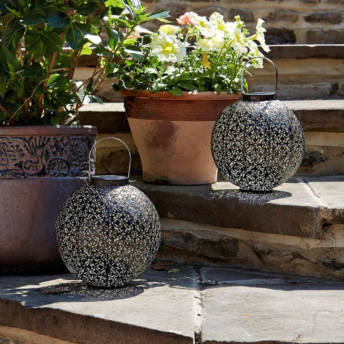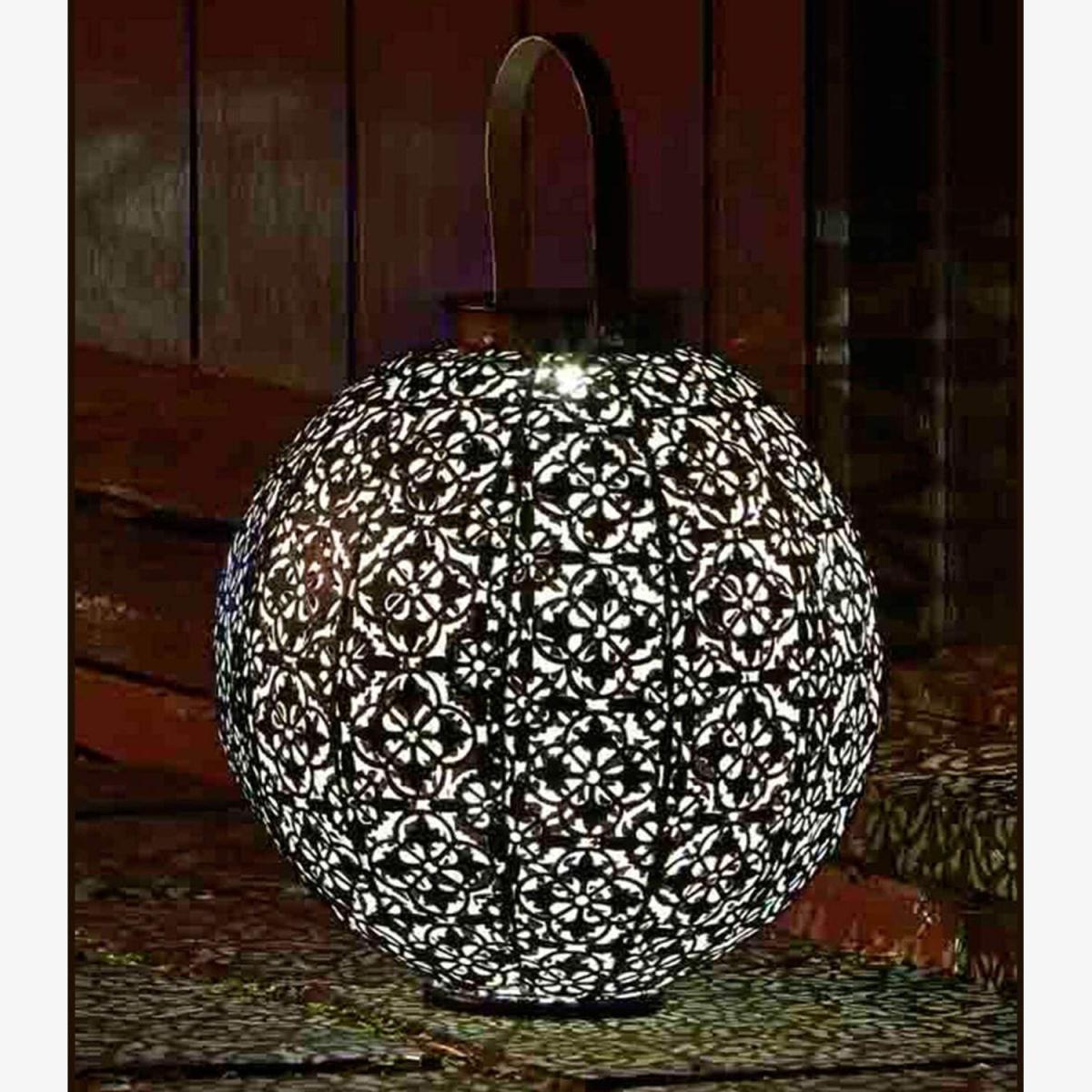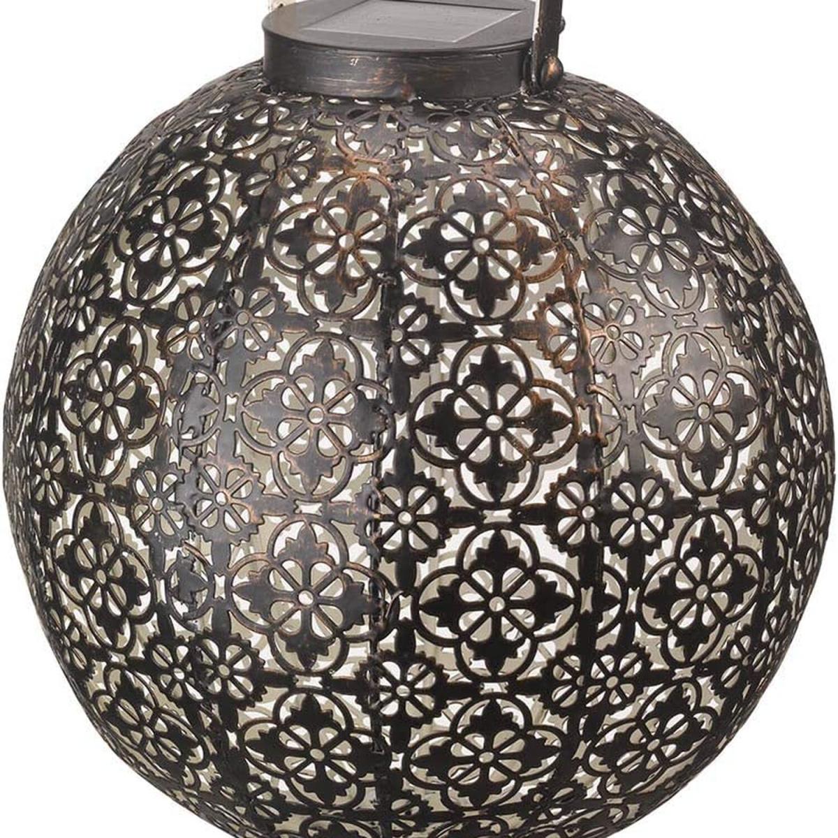 Add some light into your outdoor space with this LED Solar Lantern!This Damasque lantern is a must have for any garden area. Completely solar powered, simply place the panel into direct sunlight to fully charge, and watch as this will illuminate at night, making your light dance across your path. The solar panel is at the top of the lantern and can be removed if you want to charge the solar panel separately. Made from a copper effect metal material which magically transforms at night and creates a gorgeous, warm atmosphere right in your garden. This round LED Light will create amazing patterns on your grass, decking, front door or path once lit due to the silhouette on the lantern. This really is a garden lantern that is much needed.