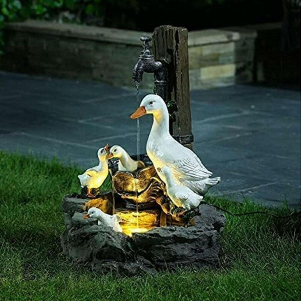 Resin material, no fading, no breaking, waterproof and sun protection. Solar power duck family statue with light, create a a peaceful garden. Retro design, surely make your garden more charming and eye-catching. The features a mother duck and her four little ducks next to the water pump, vivid and cute.
