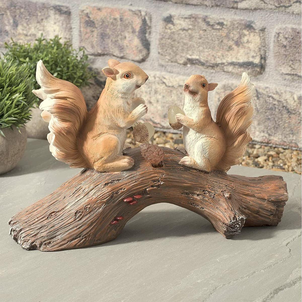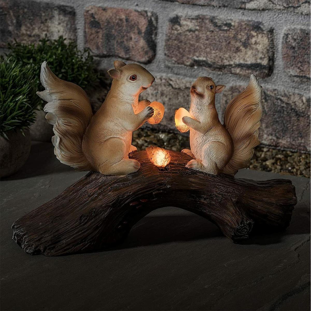 Make your backyard look more inviting in no time. Our squirrel garden ornaments feature 2 happy squirrels on a log, both holding acorns, which give off a warm glow at night. Watch your garden light up in style as soon as it gets dark. Our garden squirrel ornaments house solar-powered warm white LED lights, which automatically turn on and off. This ornament with solar light is ready to beautify your garden for many years. It is made of quality resin, which will withstand constant exposure to the sun, rain, or snow.