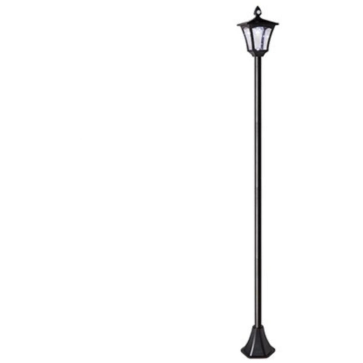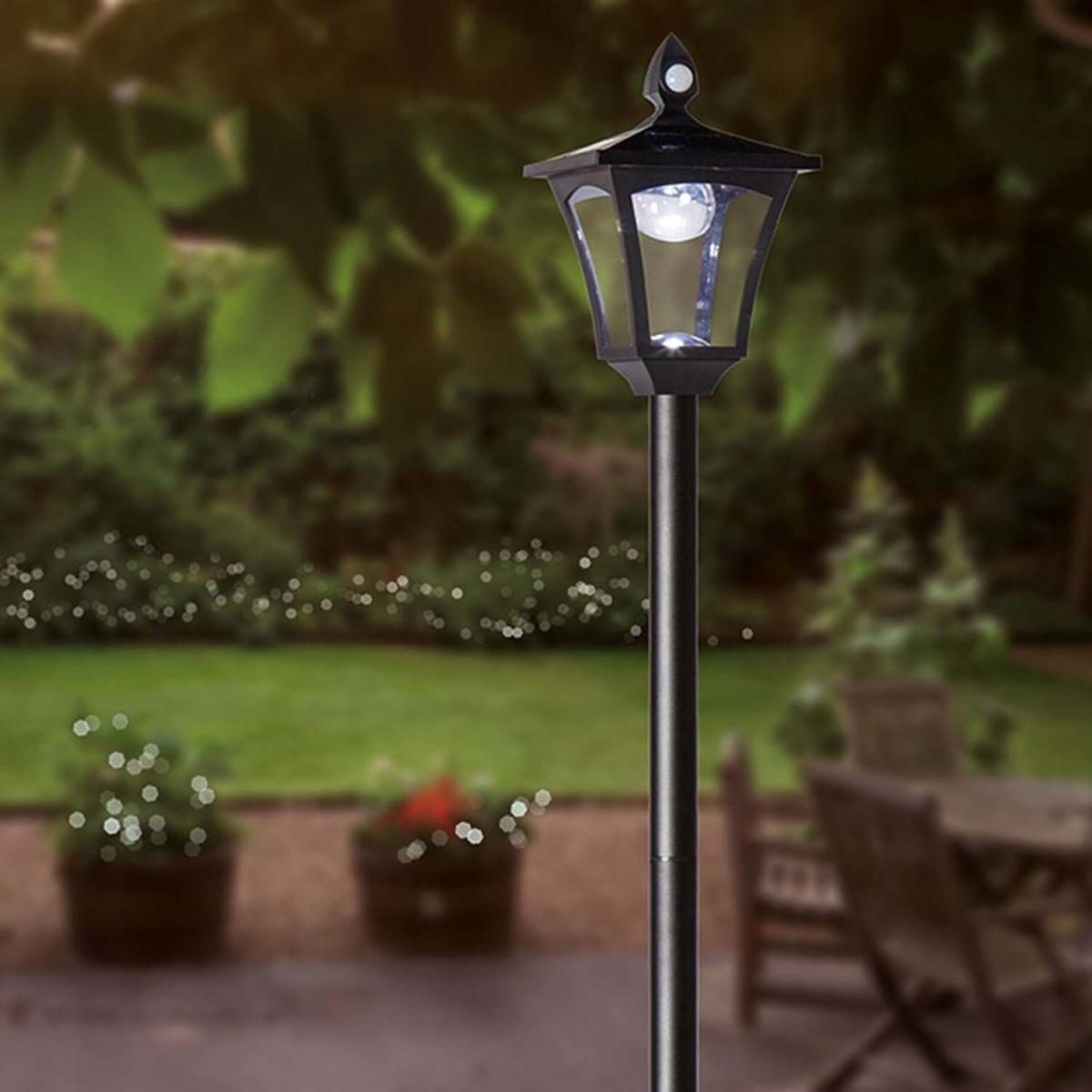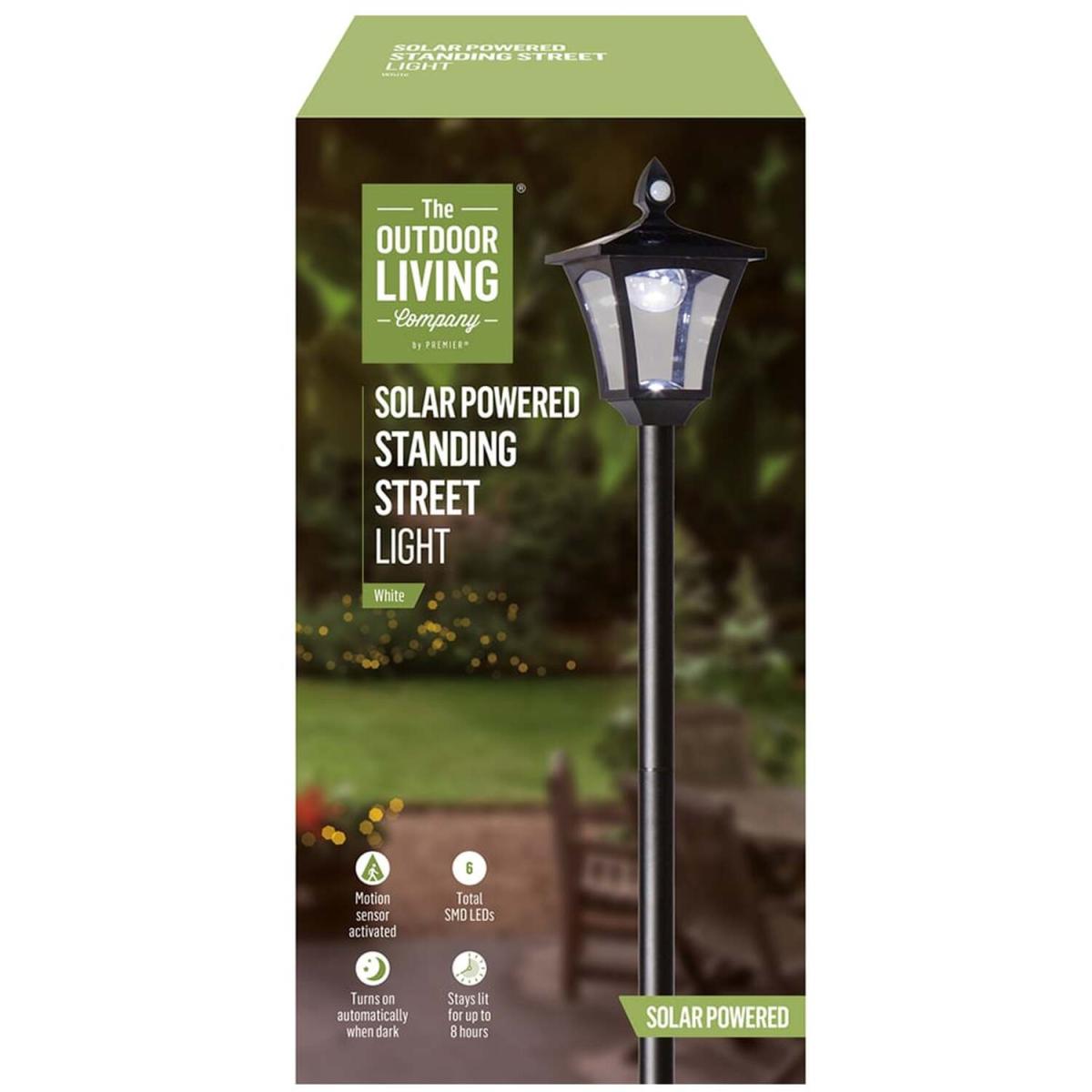 Solar powered standing street light. Create a warm and welcoming atmosphere to your outdoor space with this traditional style lamp post light. This post light creates a subtle light for a garden pathway or simply to relax in the garden with family and friends on a summers evening. This solar-powered standing streetlight features six white LEDs in a black decorative lantern design and provides light and security around your home. It features a timer function, which turns on automatically when dark and stays lit for up to eight hours. Additionally, it features a motion sensor function, which automatically turns on when motion is detected. (Rechargeable battery included.) The street light stands at approximately 2.1. M tall and can be placed anywhere around your garden or patio area. A ground spike is included to secure into the ground if required. The traditional design is perfect for outdoor dining or just a simple decorative garden light. An eco friendly way of lighting up your garden or outdoor space!