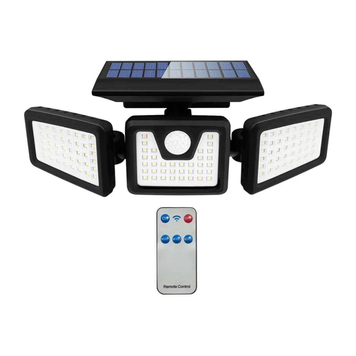Solar outdoor wall lights with motion sensor 3 heads 74 leds ip65 waterproof cordless flood security lighting for yard. Super bright 74 leds equipped with 74 led beads our solar outdoor lights could give 500lm ultra bright illumination 3 heads lights with rotatable design could illuminate up to 270 wide angle waterproof ip65 heatproof and all-weather resistant motion sensor lights with a super sensitive built-in pir motion sensor our outdoor wall lights will automatically turn on and off at night when movement is detected the sensing distance is 5-8m the minimum lighting area is 90m2. Energy-saving the flood security lamp is safe energy-saving and eco-friendly no more pollution and electricity bills the conversion rate of our solar panels is up to 20% 6-8h full charge can last up to 8-12h even in winter the light works well easy installation the solar-powered lights are very easy to install the ideal installation height is 2-4m perfect outdoor lamp for yard garage garden entrance driveway patio entryway etc 2400 mah battery 2w polycrystalline silicon panel. Three lighting modes 1 constant light mode - medium light mode all night 2 constant light + sensing mode - dim light all night and strong light for 20s when sensor detects movement 3 sensing mode - strong light for 20s once movement detected then turn off.