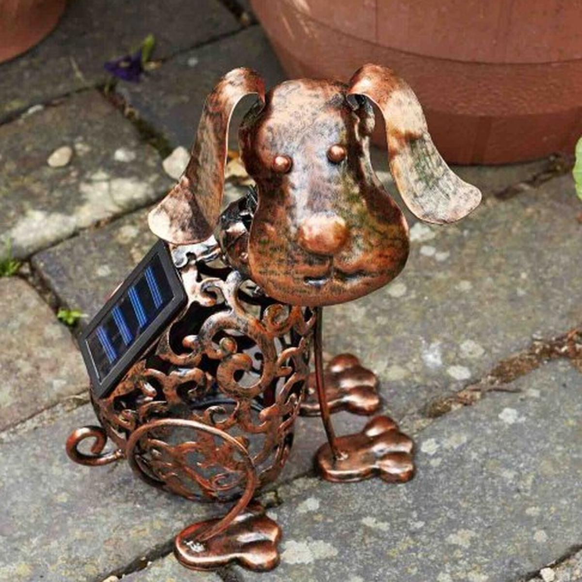The stunning body of this solar powered dog will cast breath taking patterns of light and shadow across the surface it is placed upon. Being handmade by artisans results in no two of these lights being the same, adding a one of a kind charm to this little solar dog. This metal dog silhouette harnesses energy from the sun which makes it both environmentally friendly and free to run. This means that this beautiful ornament can simply be placed in your garden and can begin charging as soon as the panel has daylight falling on it. This light automatically illuminates at dusk, meaning that no input is required as it can simply run off the stored solar power, automatically turning off during the day to begin charging again. The dog light will be sure to turn heads with it's heart-warming construction. The beautiful handmade filigree silhouette will be a perfect companion to live on your garden table tops, lawns or decking. The ornamental design makes it suitable garden decor by day and becomes an elegant light feature by night. It's versatility makes this solar light easy to place wherever you like in your garden. Always ensure that you place this solar powered dog silhouette in direct sunlight during the day to enjoy the benefits of its minimum operating time of over six hours when fully charged.