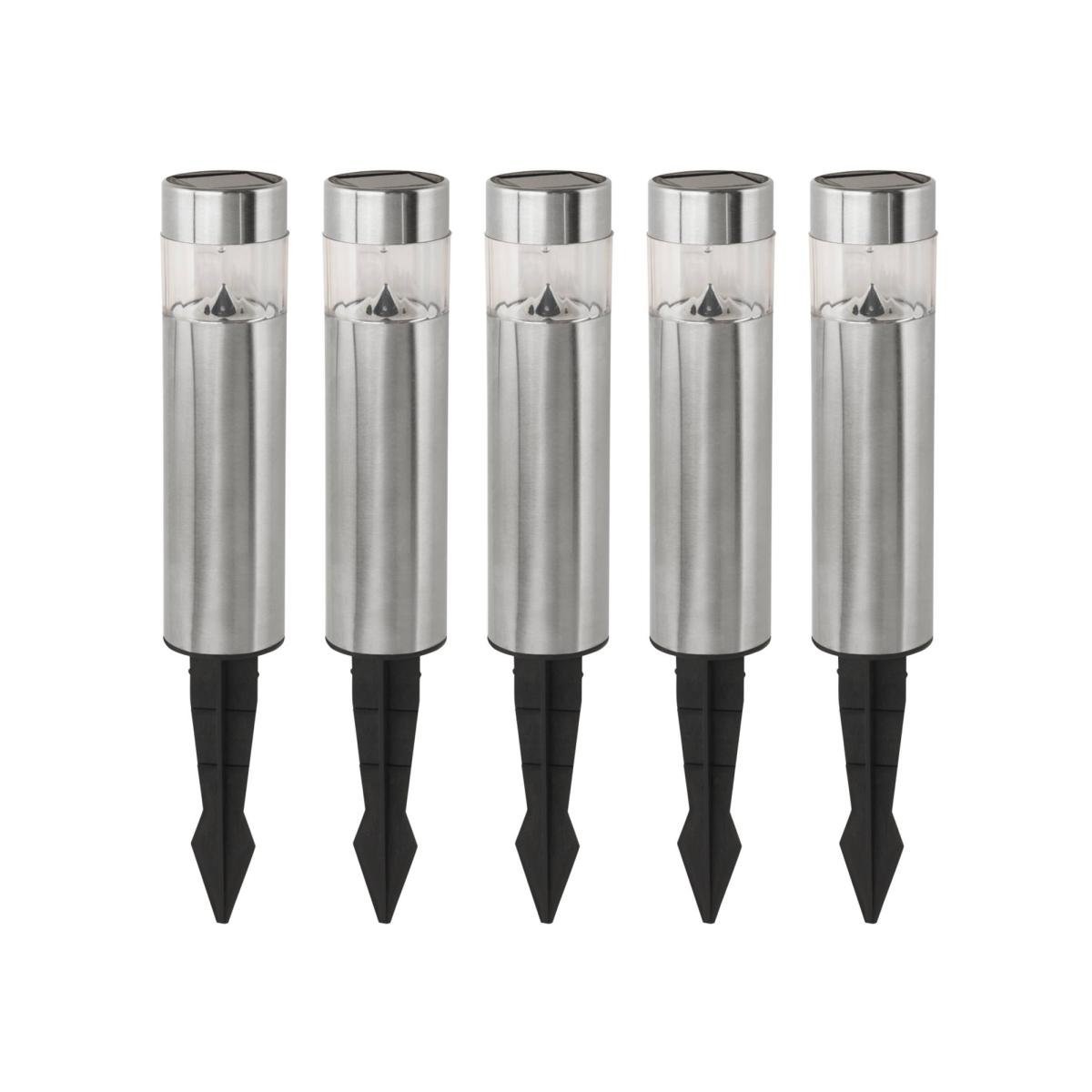 This set of 5 solar luminaires is made of stainless steel and transparent plastic and will illuminate your outdoor areas with a warm-white light.