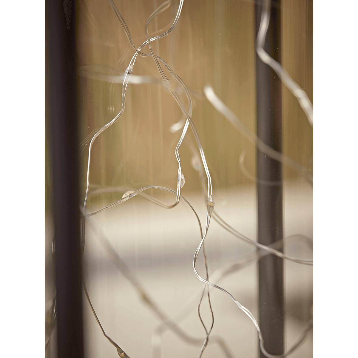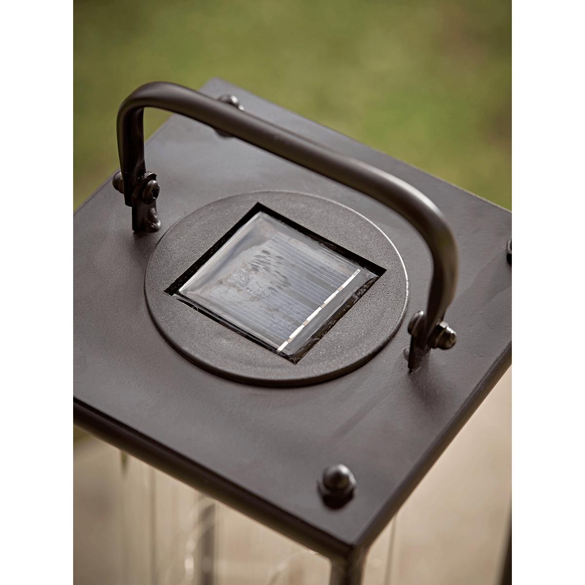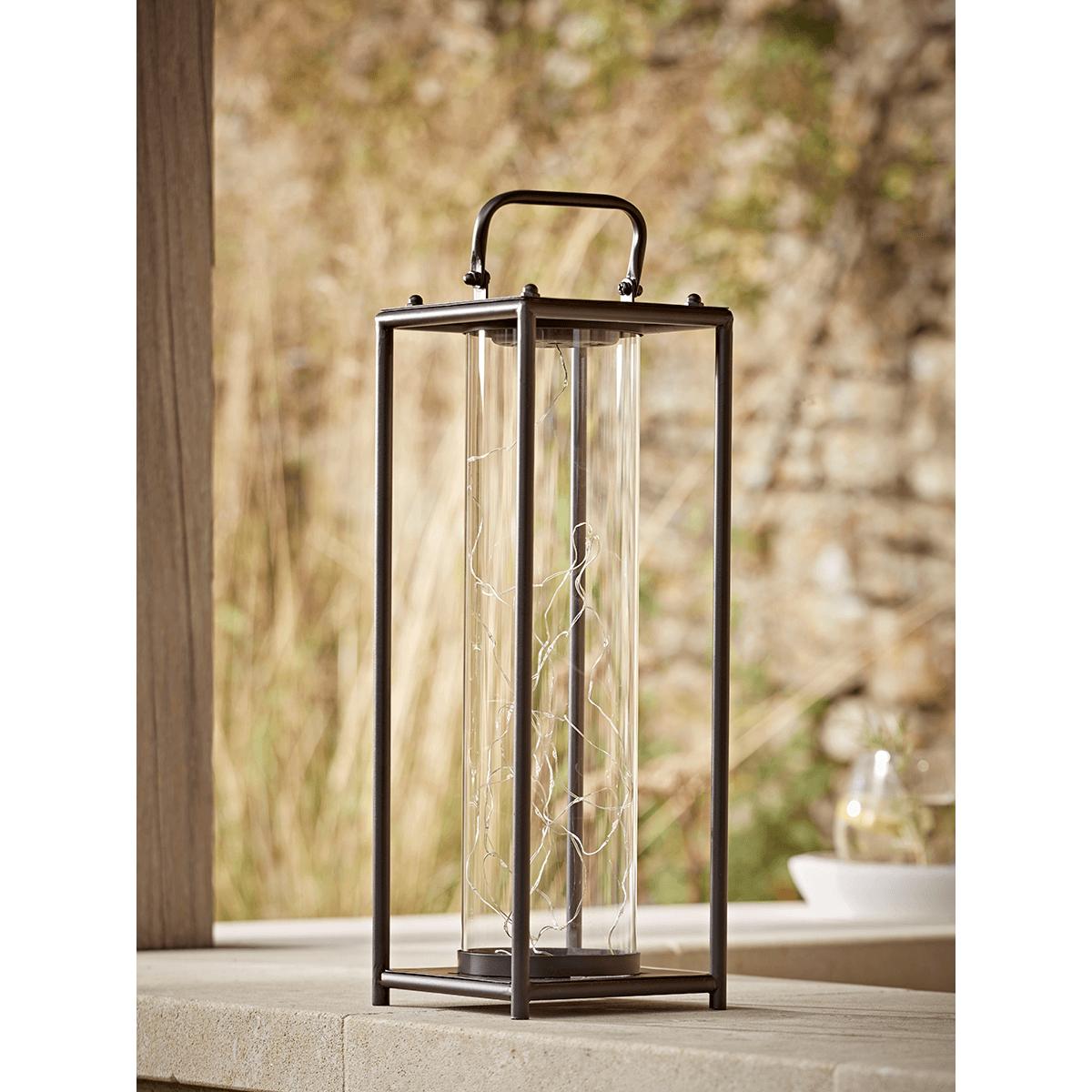 Sleek and elegant in design, our large lantern has a slender black metal frame and handle for easy mobility. Contained within is a clear glass cylinder filled with warm white wire lights, which are powered with a solar battery.