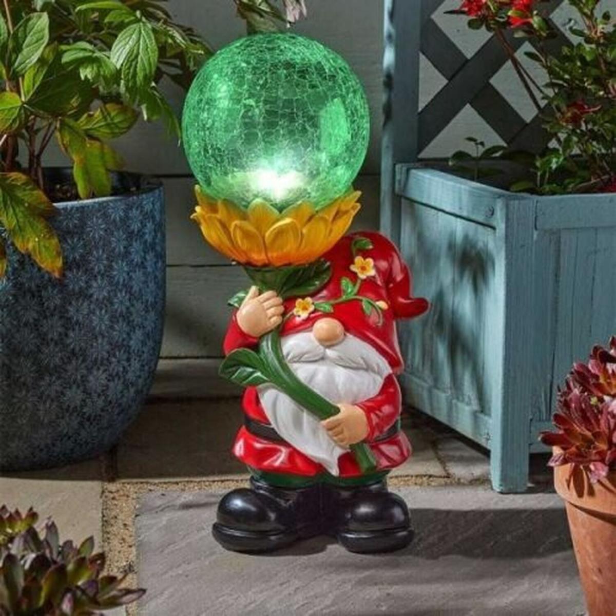 You would be gonkers to miss out on this delightful summer-inspired solar gonk garden light. Standing at 45cm tall and fully equipped with a charming sunflower and summery attire, this sun worshipping gonk is made from waterproof resin and beautifully decorated to depict a warming summers day. This joyful gonk comes with a solar crackle effect dome light which houses one bright white LED bulb with a clever colour-changing functions in either static or slow fade. Sit back in your garden with a cold drink and watch your beautiful gonk solar light cycle through 4 different colours including bright white, red, blue, and green. The integrated solar panel charges throughout the day using the suns energy, and the clever light sensors automatically illuminate the LEDs at dusk. Simply pop him in your garden and add a bright and colourful glow to your summer.