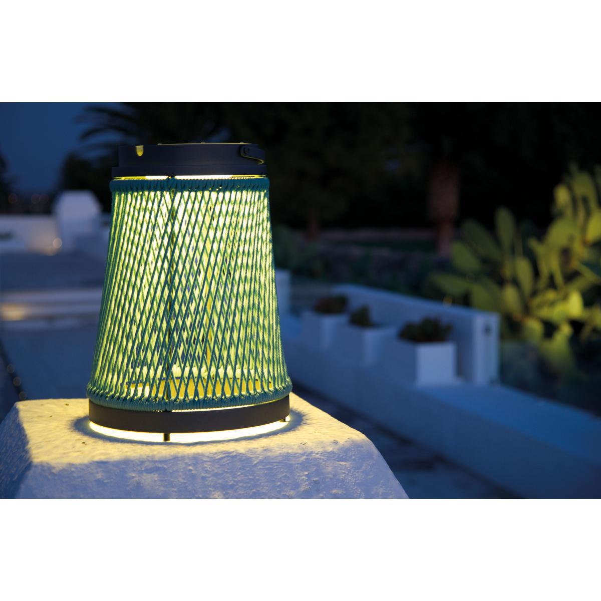 A solar lantern with a summer and contemporary look. The Solare lamp consists of a welcoming and colourful braided synthetic cord and an aluminium structure. Designed for indoors and outdoors, this wireless portable lamp goes with you everywhere, from the lounge to the terrace. The handle lets you carry it easily and hang it if required. The LED unit charges two different ways: either in the sun, on via a port (charging cable included). To make charging easier, the solar unit is detachable. The brightness is adjustable via a watertight remote (included). The Solare lamp is available in different shapes and materials including teak and synthetic cord offered in different colours. Battery life: 10 hours at 600 lumen (100%) / 35 hours at 250 lumen (30%).