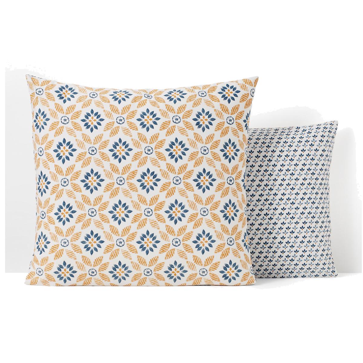 The Soleme pillowcase. A very beautiful sunny print for a pillowcase that will brighten up your room. The cotton percale offers a pleasant feeling of freshness and lightness. Its tight weave makes it particularly soft for premium comfort. A matte and smooth material that will soften over time. Product Details • 100% cotton • Percale • 200 thread count: The higher the thread count, the higher the quality of the weave • Printed 1 side with rosettes, 1 side with small patterns • Sack shape. Care Advice • Machine washable at 60°C • By washing your laundry at 40°C instead of 60°C, you limit energy consumption. Sizes • 63 x 63cm: Square • 50 x 70cm: Rectangular Complete your set and bring a personal touch by mixing your Soleme bed linen with a fitted sheet from our range of plain percale bed linen. • OEKO-TEX® Standard 100. Standard 100 certification by OEKO-TEX® tests textile products for harmful substances via an independent, international label.