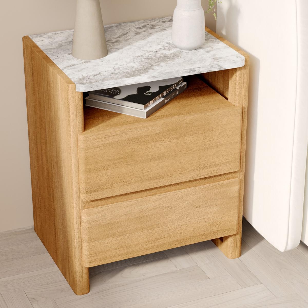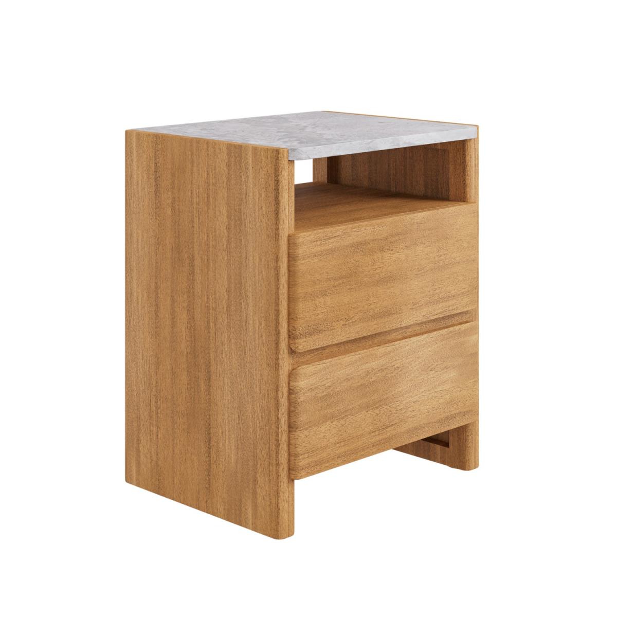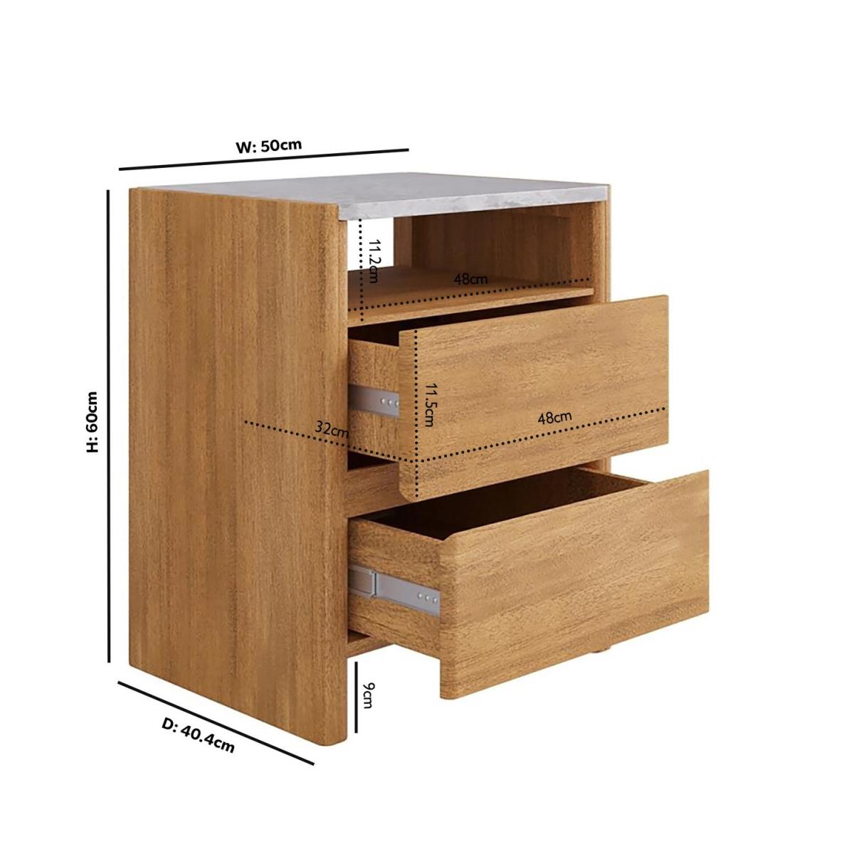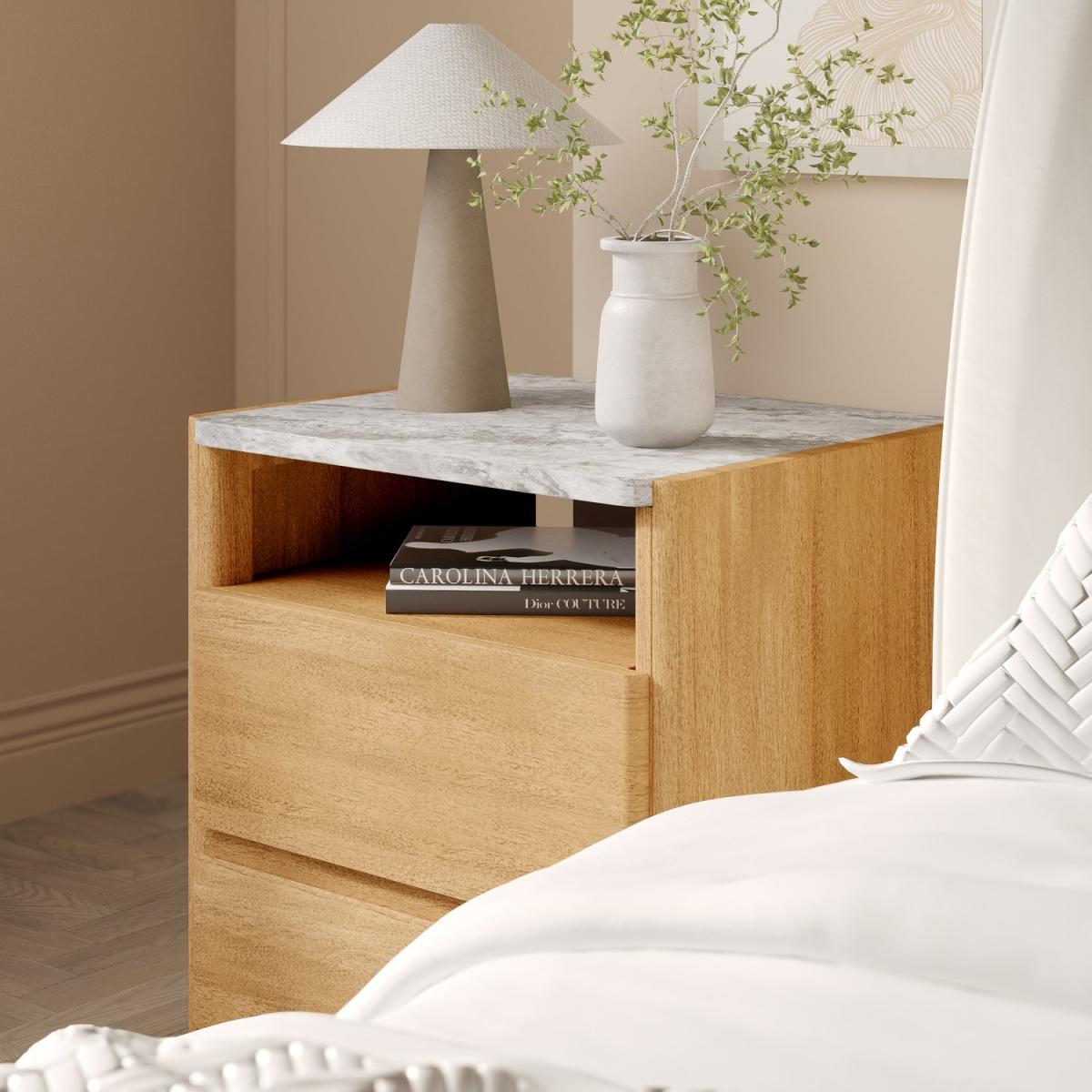 Features You'll Love Solid Wood Construction Crafted from solid acacia wood, combining exceptional build quality with a warm and natural feel to enhance your bedroom décor. Real Marble Top The real marble top, with its stunning natural vein pattern, perfectly complements the wood grain for a bedside table packed with character and charm. It's All In The Detail With recessed handles and softly curved edges, Asher merges modern design features with the natural beauty of acacia wood and real marble. Spacious Storage Two spacious drawers, along with the open shelf, offer the perfect storage solution for your bedroom essentials and glide smoothly using metal runners. The rich natural wood paired with a cool marble top creates a stunning contrast of colours, adding texture and sophistication to your space. With its soft edges and handleless drawer fronts, this bedside table offers a sleek, contemporary look that complements any bedroom decor. Bedside arrives pre-assembled for your convenience. Two smooth-gliding drawers with metal runners and a convenient open-top shelf provide ample storage for your essentials. Made from solid acacia wood and a sturdy marble top, ensuring durability and long-lasting quality combined with natural beauty. Give your bedroom a stylish and premium upgrade with the Asher Bedside Table. Crafted from solid acacia wood, it brings natural warmth and durability, while the real marble top adds a touch of elegance, making it a standout piece in any bedroom. With two spacious drawers and an open-top shelf, you’ll have plenty of room to keep your essentials organised and within reach. Whether you’re storing books, night-time essentials, or decorative pieces, this bedside table blends style and functionality with ease. Due to Asher’s natural materials, each piece will feature unique grains and veining that may differ slightly from the images seen online. This ensures your furniture will be truly one of a kind.