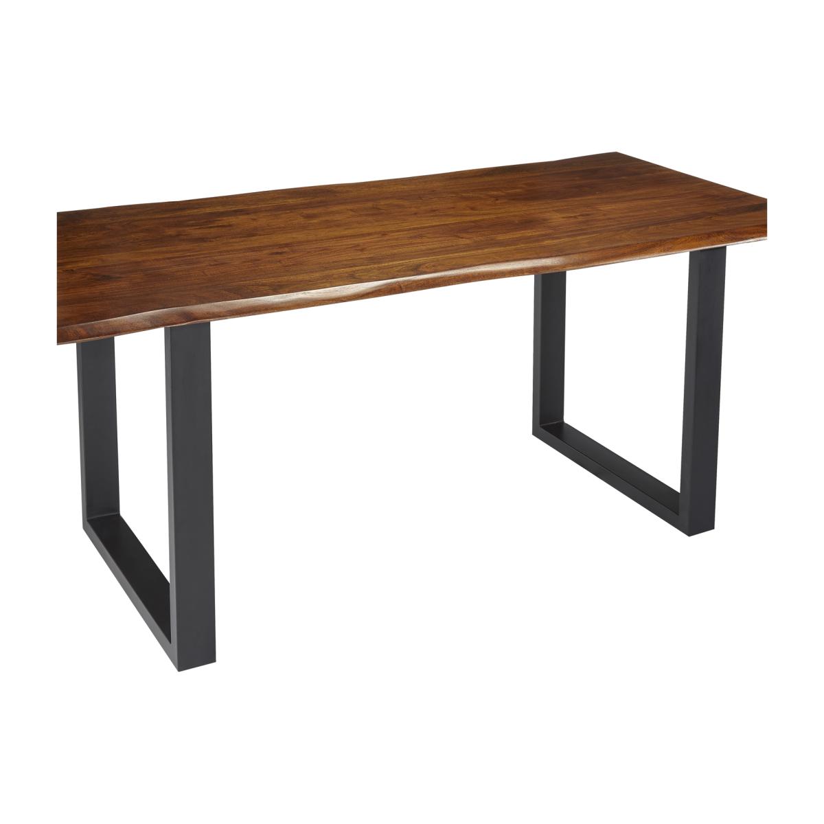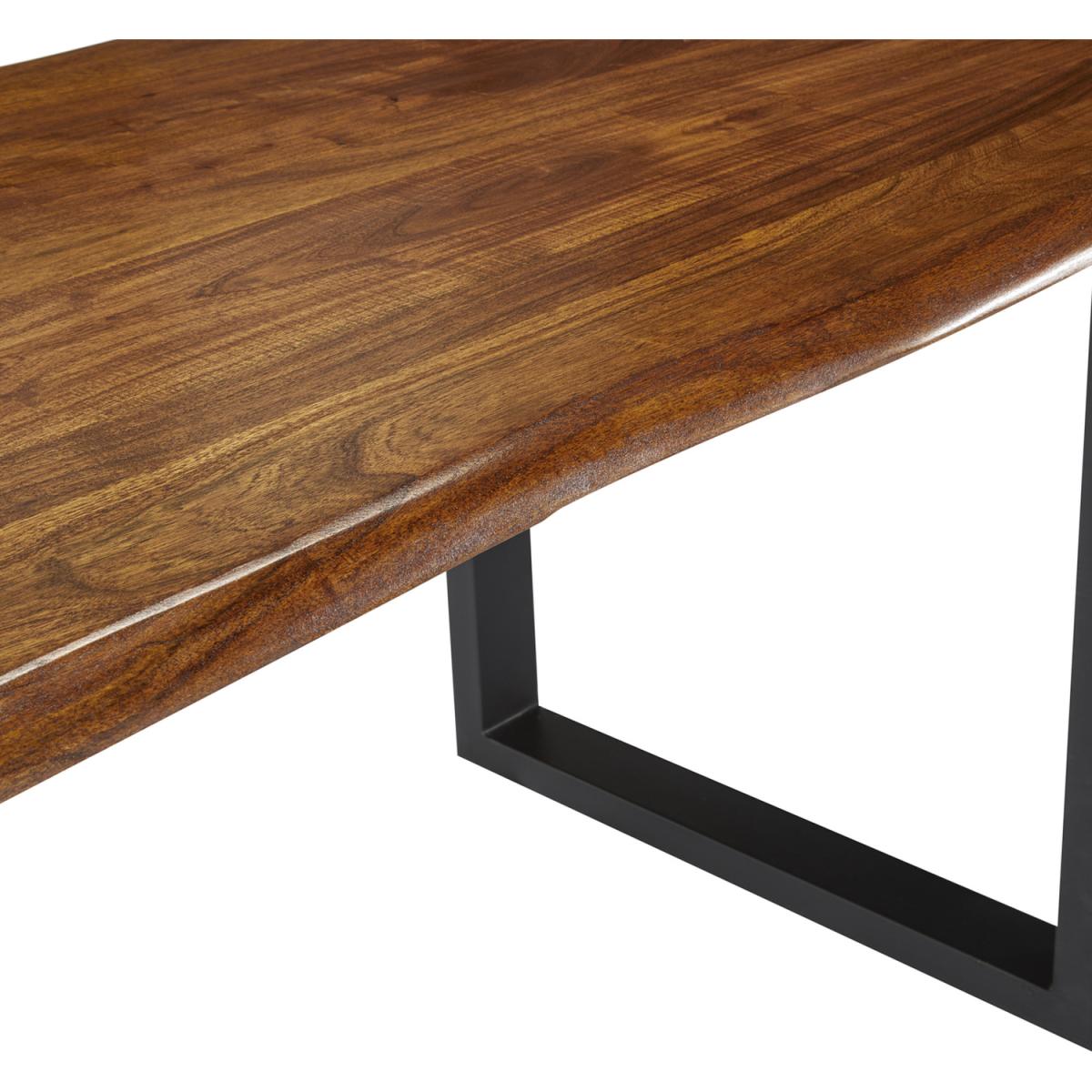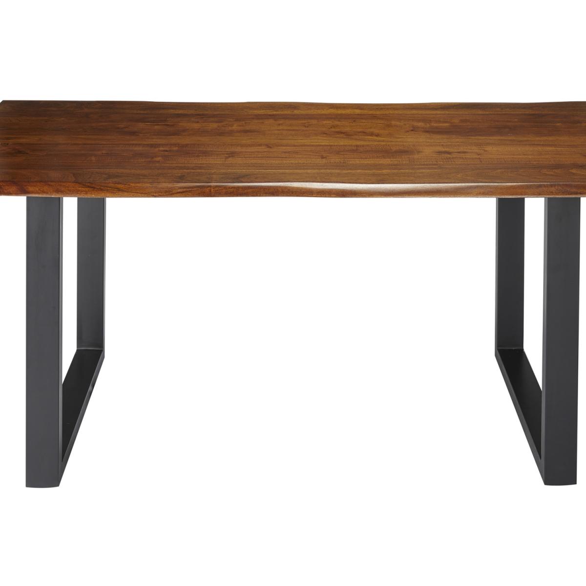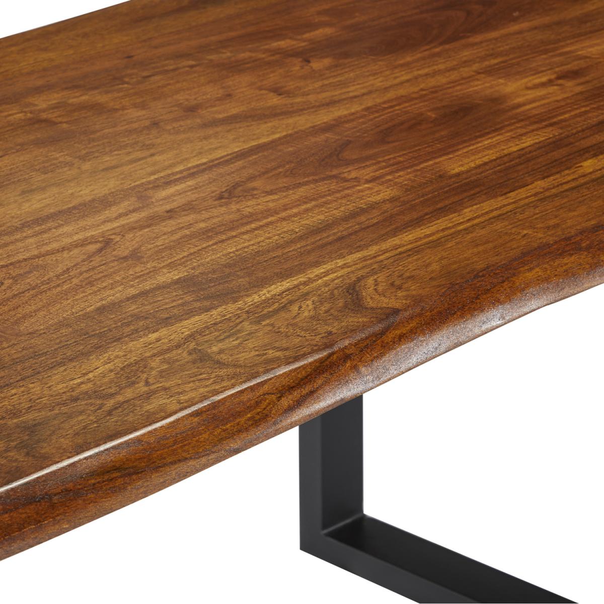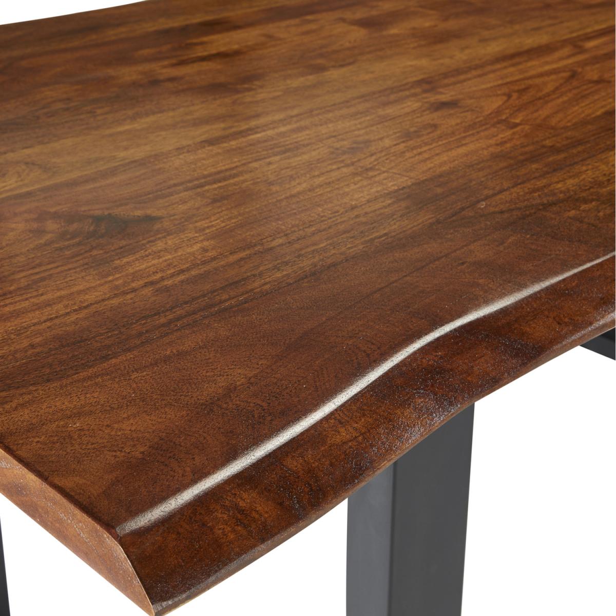 Live edge solid Acacia wood dining table with black metal frame. This stunning dining table is made from 100% solid wood (no veneer) finished in a dark stain and wax with a clear lacquer topcoat for extra protection, the legs are steel and have been powder coated black. This item will be delivered part assembled with only the legs to be attached and it is ready to use.