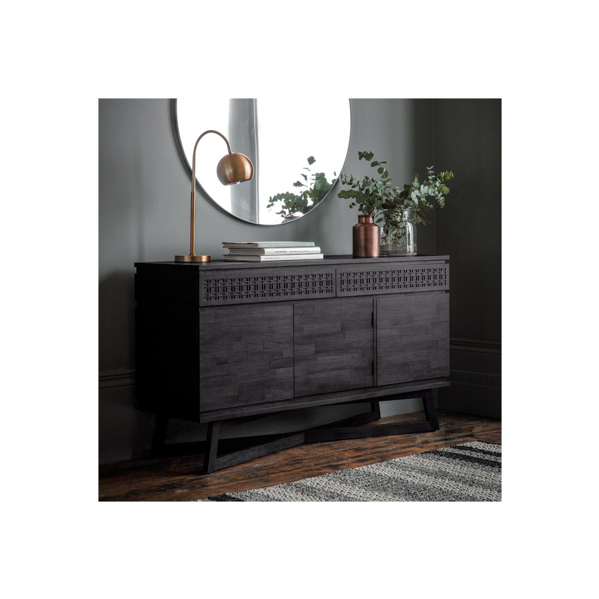 The beautiful Boho Boutique Sideboard is made from solid wood with a dark rich varnish with traditional carved detailing. It also has modern crossed legged base to give it that contemporary look.