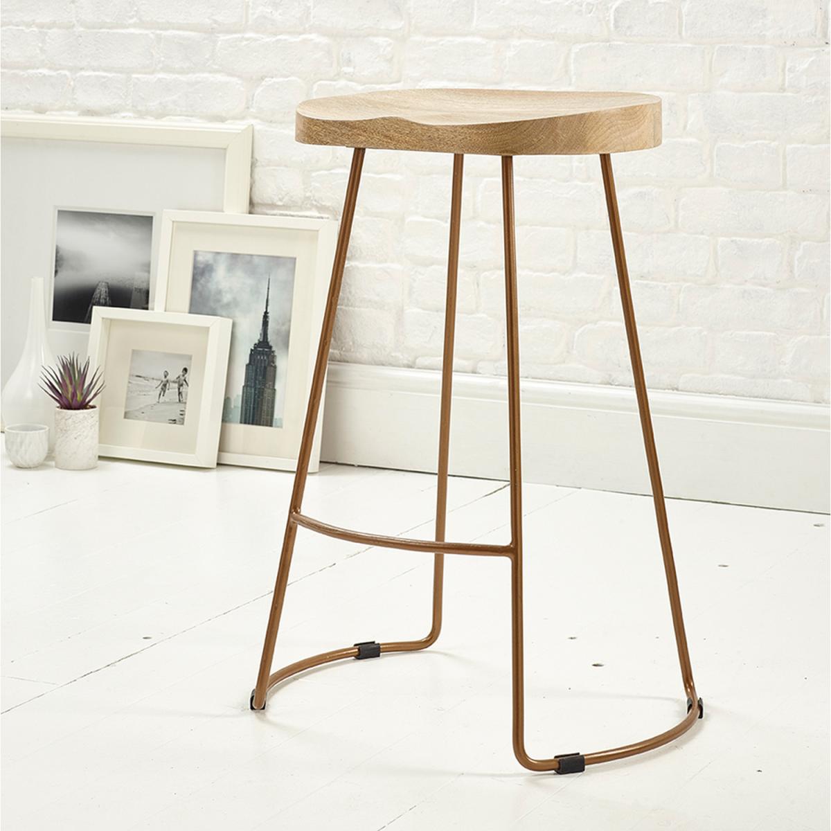 I’m particularly fond of this gold-legged breakfast stool for its clean lines and the warm contrast between the solid wood seat and metal frame. It works brilliantly in Scandi-inspired kitchens or pared-back industrial spaces, where the metallic accents lift neutral palettes without overwhelming them. For a cohesive look, pair it with a light oak island or a marble-topped bar and introduce a textural seat pad in a muted tone. Its slim frame makes it easy to tuck away when not in use, and the integrated footrest ensures practicality for everyday seating.