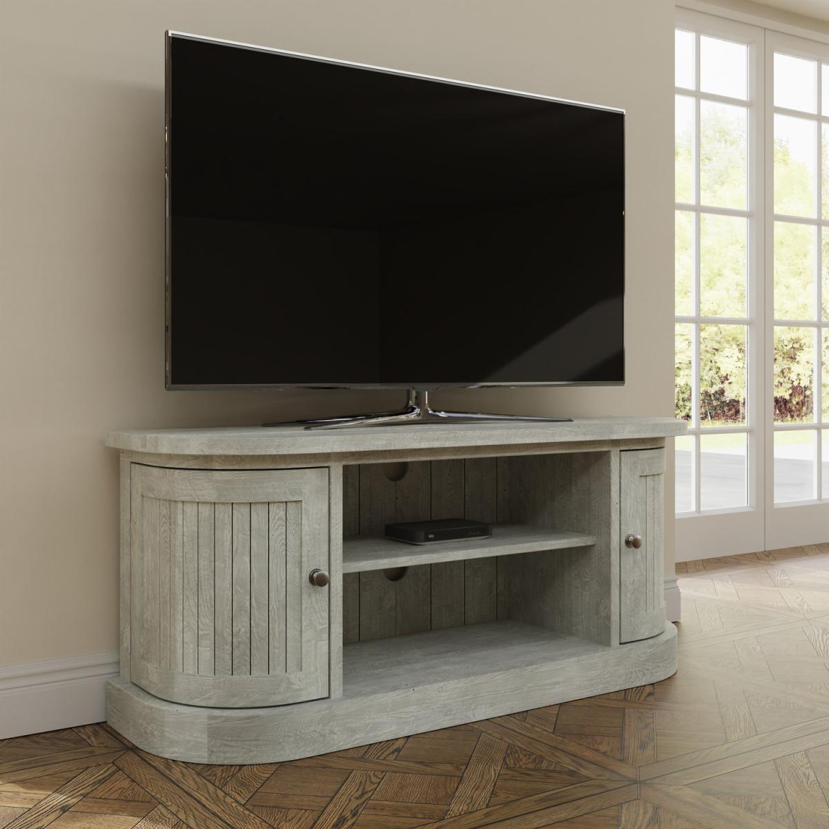 Introducing our exquisite Large 2 Door TV Unit, crafted from Lime Washed Reclaimed Pine. This stunning piece combines functionality with rustic beauty, making it a perfect addition to your living room or entertainment area. Handmade and hand finished, each TV unit is a unique work of art, showcasing the natural variations and character of the wood. With two large doors and internal storage, this TV unit provides ample space to neatly organize your media devices, accessories, and more. Additionally, the two open plan shelves offer convenient storage for displaying your favourite decor pieces or media collections. The Pewter Style Metal Handles add a touch of sophistication, while the elegant curved appearance adds a sense of grace and style to your space. Delivered pre-assembled, this TV unit is ready to enhance your viewing experience with its charm and practicality.