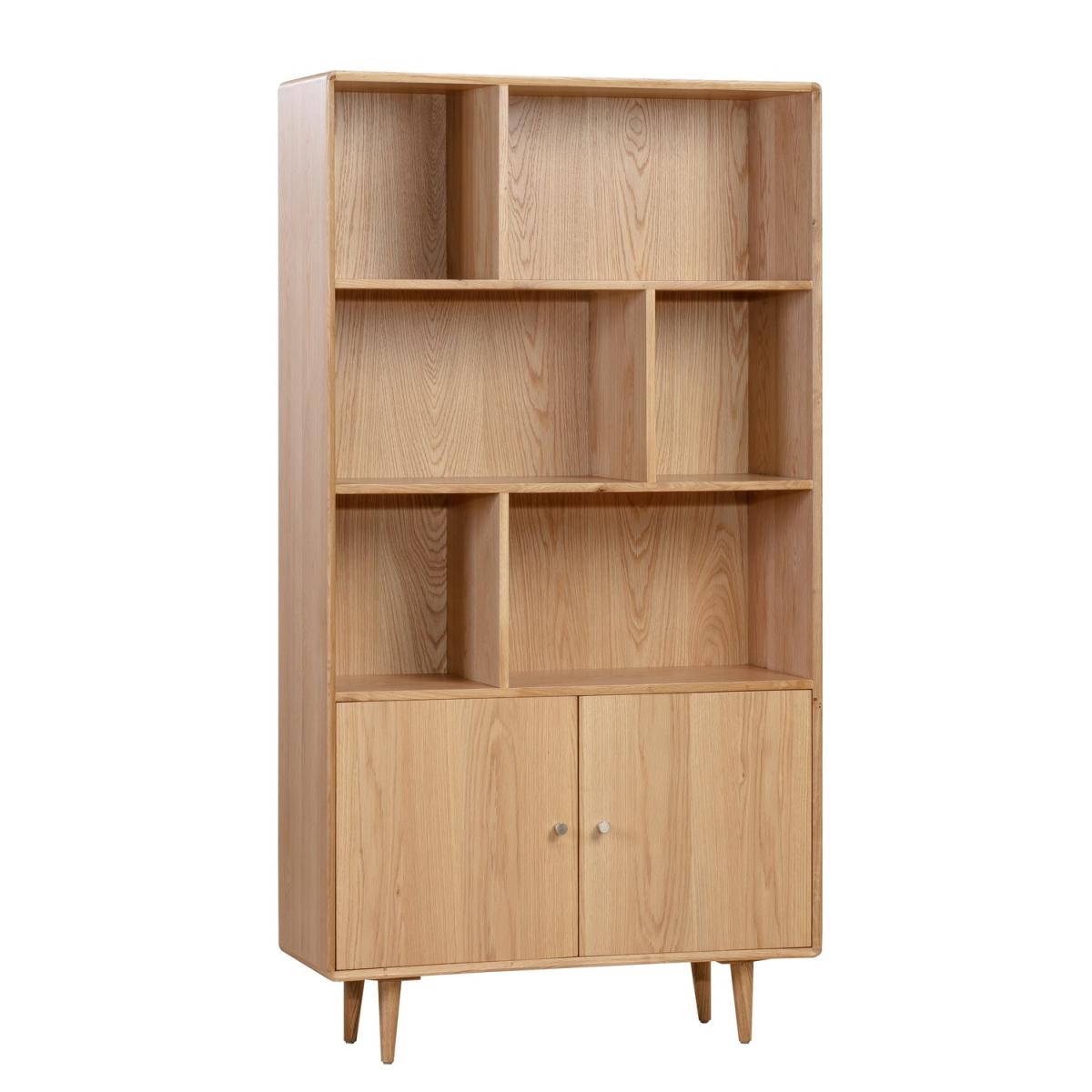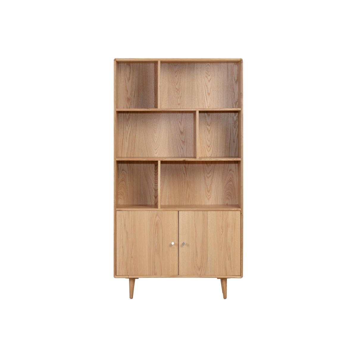 Crafted from solid oak, oak veneer and MDF Clean lines Rounded edges offer a Scandi finish A choice of handles included Fixed shelving, perfect for housing your books and decorative items Assembly required