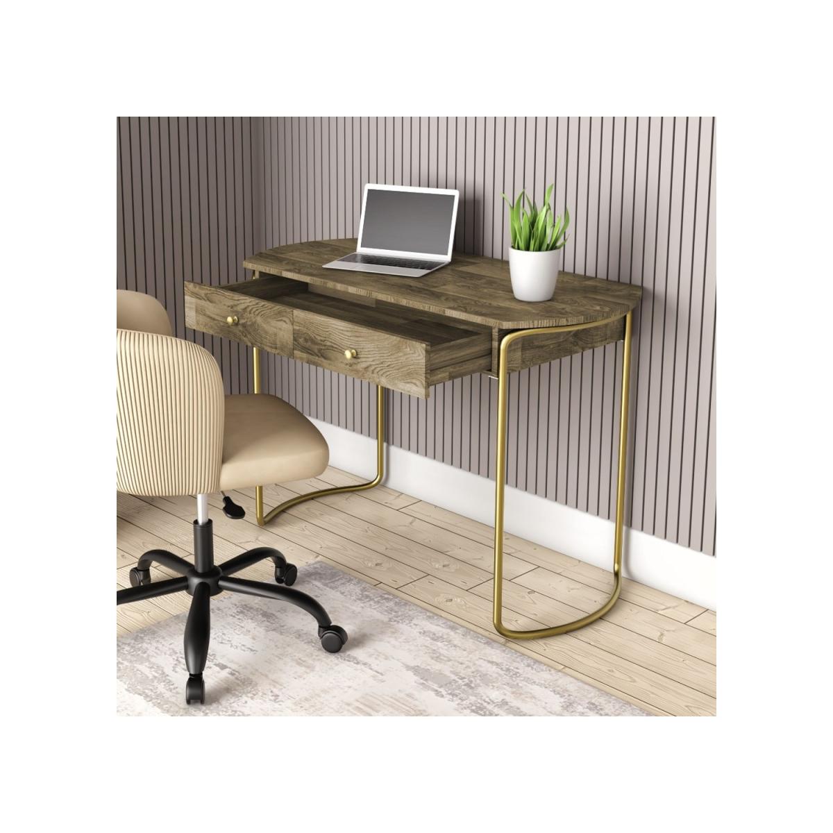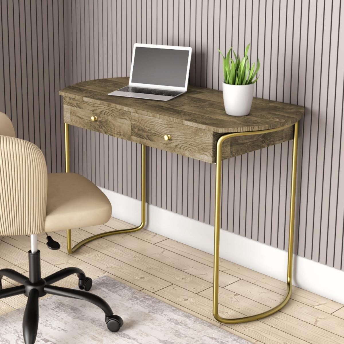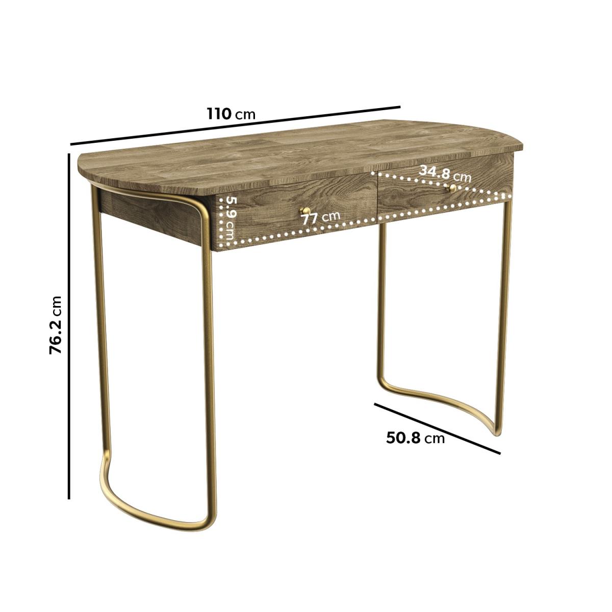 Features we love Modern curved office desk to enhance any home office. Made of solid acacia wood and beautifully lacquered. The gold handles and legs are a striking contrast. One wide drawer provides ample space for essentials. Super easy to assemble only the legs to attach All about me. Update your office space with this gorgeous Piper desk. Rest a laptop or display a modern desk lamp and it’ll look as stylish as ever. There’re no sharp corners to catch on either thanks to its curved shape. Also available in a walnut wood finish. Need to know. Dimensions. W110 x D50.8 x H76.2 cm Inner drawer dimensions. W77 x D34.8 x H11.5 cm Number of drawers. 1 Weight. 19.74kg Colour. Brown and; gold Finish. Lacquered powder coated frame/legs/handles Material. Solid acacia wood and metal (legs/handles) Assembly required. Yes (just the legs).