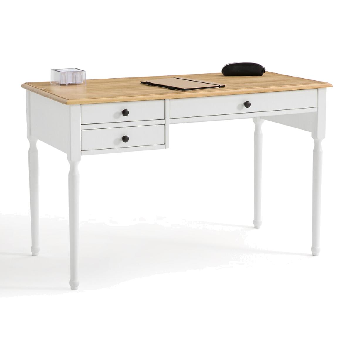 Solid pine desk. With its 3 storage drawers, this desk is as practical as it is aesthetic. Product Details • 3 drawers • Metal button handles • Top in lightly brushed solid pine, oak stained, clear NC varnish finish • Legs and structure in NC lacquered solid pine, NC lacquered pine and MDF drawers, MDF bottomDimensions. Overall • Width: 120cm • Height: 76cm • Depth: 60cm. Usable space • Large drawer under the tray: L66.7 x H6.3 x D37.6cm • Small side drawers: L32.9 x H6.3 x D37.6cm. Delivery: • Assembly required. Available for home delivery. Note! Please check that all access points are large enough to accommodate your delivery (doors, stairs, lifts). • WOOD FROM SUSTAINABLY MANAGED FORESTS. FSC® certified wood comes from forests that are environmentally, socially and economically well managed. Dimensions and weight of parcel1 parcel • L130.8 x H13.7 x D72.4cm. 28.5kg.