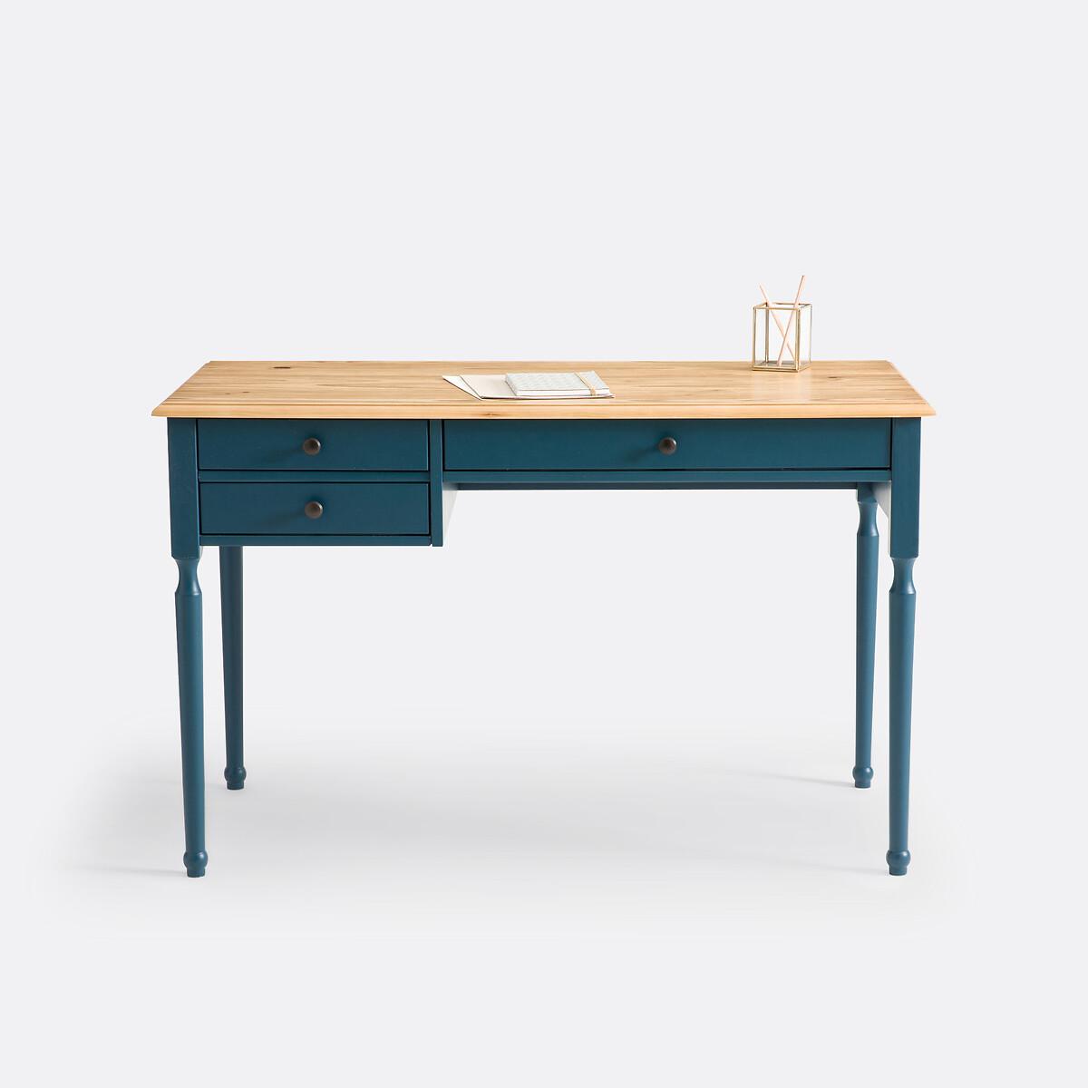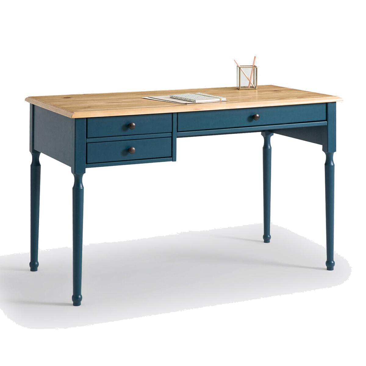 Solid pine desk. With its 3 storage drawers, this desk is as practical as it is aesthetic. Product Details • 3 drawers • Metal button handles • Lightly brushed solid pine table top, oak stained, clear nitrocellulose varnish finish • Legs and frame in nitrocellulose lacquered solid pine, drawers in nitrocellulose lacquered pine and MDF, base in MDFDimensions. Overall • Width: 120cm • Height: 76cm • Depth: 60cm. Usable space • Large drawer under the tray: L66.7 x H6.3 x D37.6cm • Small side drawers: L32.9 x H6.3 x D37.6cm. Delivery: • Assembly required. Available for home delivery. Note! Please check that all access points are large enough to accommodate your delivery (doors, stairs, lifts). • WOOD FROM SUSTAINABLY MANAGED FORESTS. FSC® certified wood comes from forests that are environmentally, socially and economically well managed. Dimensions and weight of parcel1 parcel • L130.8 x H13.7 x D72.4cm. 28.5kg.