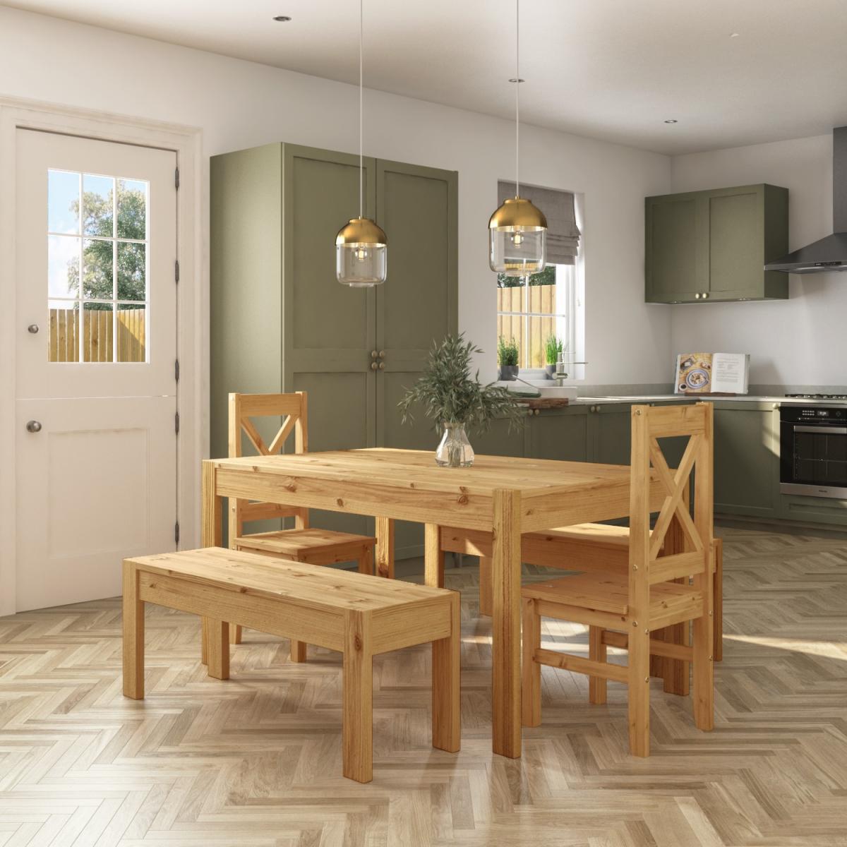 This bundle includes : Solid Pine Dining Table - Rectangular - Seats 6 - Emerson2 x Emerson Wooden Dining Benches in Solid Pine 2 x Solid Pine Cross Back Dining Chairs - Emerson Features We Love Comes with dining table, two dining chairs and two benches Charming country dining set with contemporary twist Highly durable construction, made from solid pine Dining set for 6 diners, perfect for family meals Family friendly waxed finish for style that lasts Dining Table Information Dimensions:H76 x W152 x D92 cm Packaging dimensions (box 1):H6.5 x W157.5 x D95 cm Packaging dimensions (box 2): H11 x W156.5 x D20 cm Colour: Natural Finish: Waxed tabletop Material: Solid pine Assembly required: Yes Dining Bench Information Dimensions:W120 x D38 x H46 cm Package dimensions : W126 x D42.5 x H8 cm Product weight: 10.5kg Colour: Natural Finish: Friendly waxed Material: Solid pine Assembly required: Yes Dining Chair Information Number of chairs: 2 Each chair dimensions:W41.8 x D47 x H100 cm Package dimensions: W105 x D45 x H10 cm Maximum load weight: 80kg Colour: Natural Finish: Waxed Material: Solid pine Assembly required: Yes