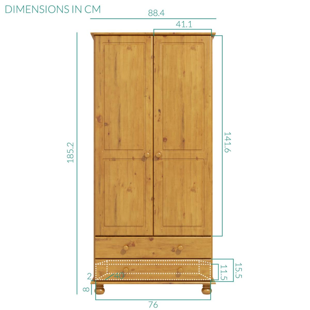DIMENSIONS. H185.2 X W88.4 X D56.5 CM FEATURES. Classic and; versatile design. Double door opening housing an internal hanging rail2 Drawers with easy glide wooden drawer runners. Traditional bun feet and; round handles. Durable solid pine features. Rich warm pine finish. Self-assembly required. Hamilton bedroom collection. CLASSIC STYLING The Hamilton collection has a classic design offering great versatility. Pieces in the collection feature traditional bun feet and solid round handles. With a rich pine finish pieces from the Hamilton collection are sure to suit any bedroom. BEST OF BOTH This wardrobe is ideal for hanging storage and folded storage with 2 wide drawers at the base. The double doors conceal a full width internal hanging rail perfect for easy-crease items and wardrobe staples. The drawers come in ideal for folded items bulkier items or even accessories. QUALITY BUILD Made from solid pine with supportive bun feet the Hamilton wardrobe stands strong lasting the test of time. Wooden drawer runners ensure no sticking and a smooth opening every time. With a rich pine finish the wardrobe has a warm homely appearance. This wardrobe requires self-assembly which can be managed by one person but we would recommend two..