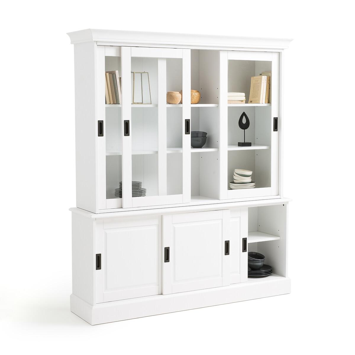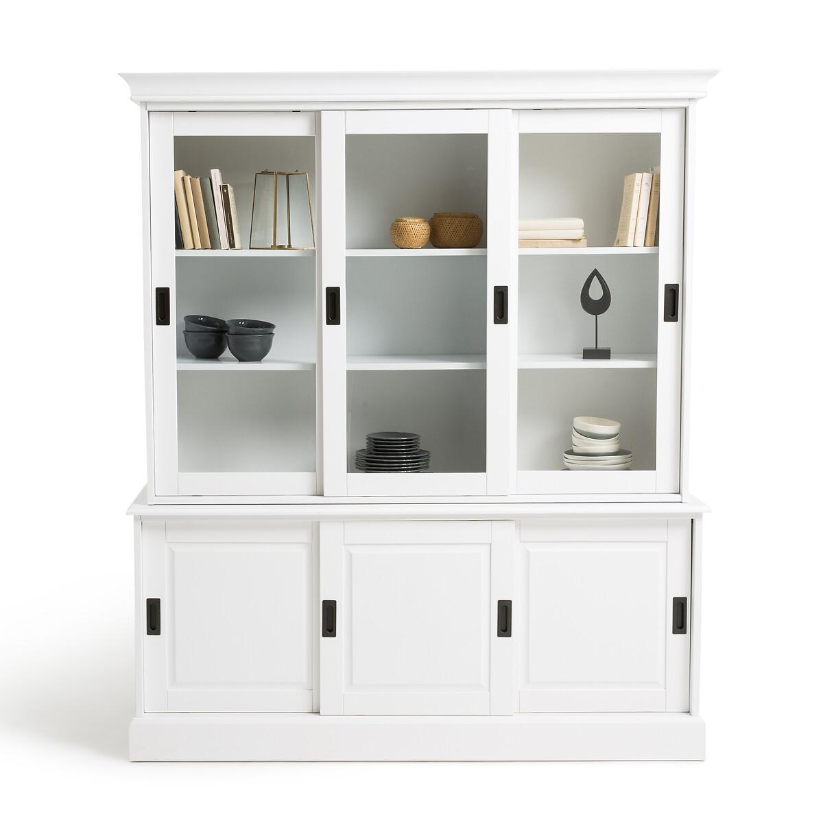 6-Door Sideboard Unit. Practical, sturdy and elegant, the solid pine sideboard/dresser is practical for storing table linens, books, decorative items and tableware ! Product Details • 2 items to place one on top of the other • Top section: 3 sliding glass cupboard doors, 2 height-adjustable shelves • Lower section: 3 sliding cupboard doors, 1 adjustable shelf • Solid pine and MDF with a painted white satin finish and nitrocellulose varnish • Plywood back • Metal door knobs with a black/grey finish • Assembly: 2 hours approximately, 2 people (minimum)Dimensions. Total: • Width: 163cm • Height: 191cm • Depth: 40.5cmDelivery:. This product will be delivered to be assembled at your home, by appointment.. Note! Please check that all access points are large enough to accommodate your delivery (doors, stairs, lifts). • WOOD FROM MORE SUSTAINABLY MANAGED FORESTS AND CONTROLLED SOURCES. FSC® Mix wood contains at least 70% FSC® certified and/or recycled wood, the remainder being FSC® controlled wood. Dimensions and weight of parcel3 parcels • 170.5 x 61.5 x 16.7cm - 39.7kg • 170.5 x 47 x 21.2cm - 34.4kg • 114.5 x 58 x 11.2cm - 22.5kg
