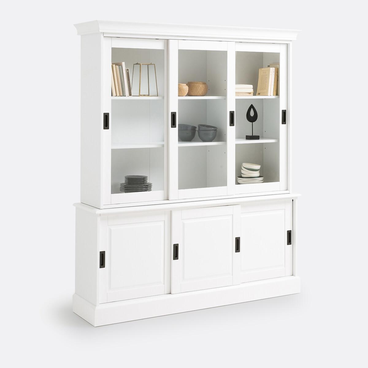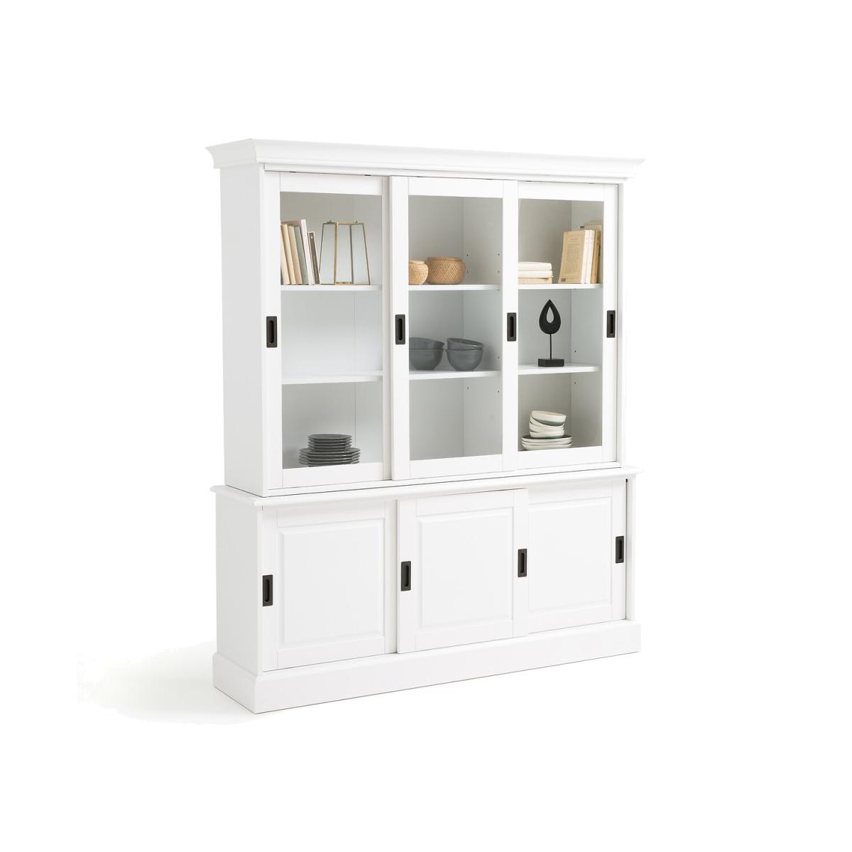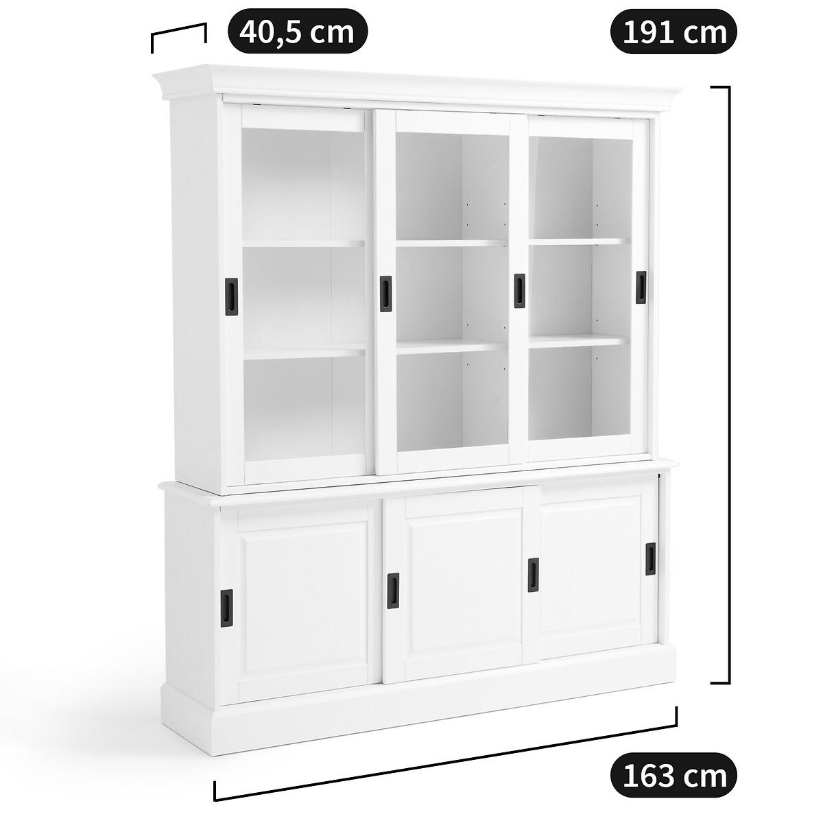 6-Door Sideboard Unit. Practical, sturdy and elegant, the solid pine sideboard/dresser is practical for storing table linens, books, decorative items and tableware ! Product Details • 2 items to place one on top of the other • Top section: 3 sliding glass cupboard doors, 2 height-adjustable shelves • Lower section: 3 sliding cupboard doors, 1 adjustable shelf • Solid pine and MDF with a painted white satin finish and nitrocellulose varnish • Plywood back • Metal door knobs with a black/grey finish • Assembly: 2 hours approximately, 2 people (minimum)Dimensions. Total: • Width: 163cm • Height: 191cm • Depth: 40.5cmDelivery:. This product will be delivered to be assembled at your home, by appointment.. Note! Please check that all access points are large enough to accommodate your delivery (doors, stairs, lifts). • WOOD FROM MORE SUSTAINABLY MANAGED FORESTS AND CONTROLLED SOURCES. FSC® Mix wood contains at least 70% FSC® certified and/or recycled wood, the remainder being FSC® controlled wood. Dimensions and weight of parcel3 parcels • 170.5 x 61.5 x 16.7cm - 39.7kg • 170.5 x 47 x 21.2cm - 34.4kg • 114.5 x 58 x 11.2cm - 22.5kg