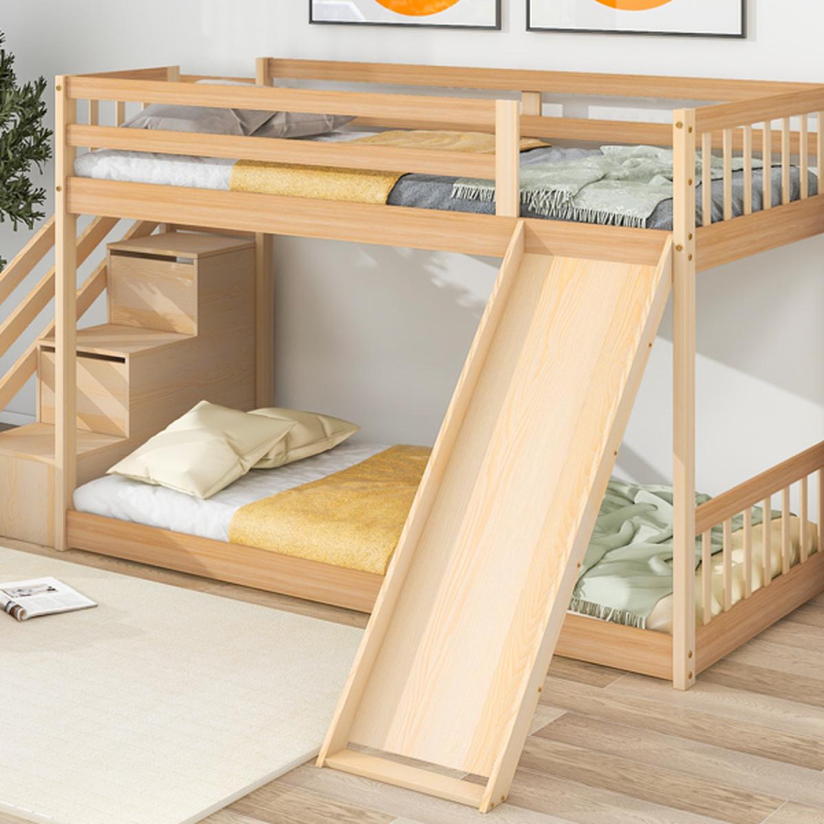 This modern bunk bed combines safety, fun, and practicality for children's bedrooms. Crafted from durable pine wood and MDF, its sturdy frame features a full-length guardrail on the upper bunk and secure stairs with built-in storage drawers for toys or books. The added slide brings playful excitement, while the robust design ensures stability during play or rest. Easy to assemble with included tools and clear instructions, it includes a lower bunk headboard and eco-friendly finishes for peace of mind. Gentle cleaning with a cloth and ventilation upon delivery maintains its fresh look. Compatible with standard UK single mattresses, this bunk bed is a safe, space-saving solution for joyful childhood memories. PLEASE NOTE:This product consists of 3 parcels and all 3 parcels may not arrive on the same day.