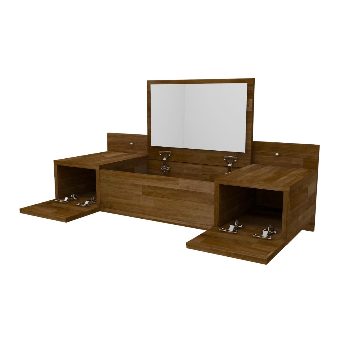 The handmade makeup vanity table offers modern style and sophistication with an 18 mm thick pine wood construction, varnished wood finish, and wall-mounted design. The product includes an integrated floral mirror, an upper storage shelf, and two cabinets for closed storage, all with smooth oval door edges and concealed metal hinges. Plus, the wood varnished finish makes it water-resistant Easy to assemble with a power drill and screwdriver, and wall mounting hardware included. MATERIAL Manufactured from natural solid pine wood. The product photos are real. There may be a difference in the tone of colour originating from the natural wood we use in our products. Please consider this condition when ordering. ADDITIONAL INFORMATION It is completely handmade. Health-friendly wood preservatives are used. The accessories shown in the photos are not for sale. The trees and natural woods we use in our products are obtained from completely dried, planned felling (of old trees). No process of cutting down trees is carried out that would harm nature. CLEANING You can clean your wooden furniture with a damp cloth. Avoid prolonged contacwithof your product with copious amounts of water. ASSEMBLY The product will be delivered to the customer in the original package as disassembled. It is designed to be assembled by the customer using a power drill and screwdriver. Assembly instructions and installation hardware are included in the package. For fast and error-free installation, product parts are numbered with stickers by the assembly guide. RETURN POLICYMade-to-order items are excluded from our standard Cooling Off and Change of Mind policies.