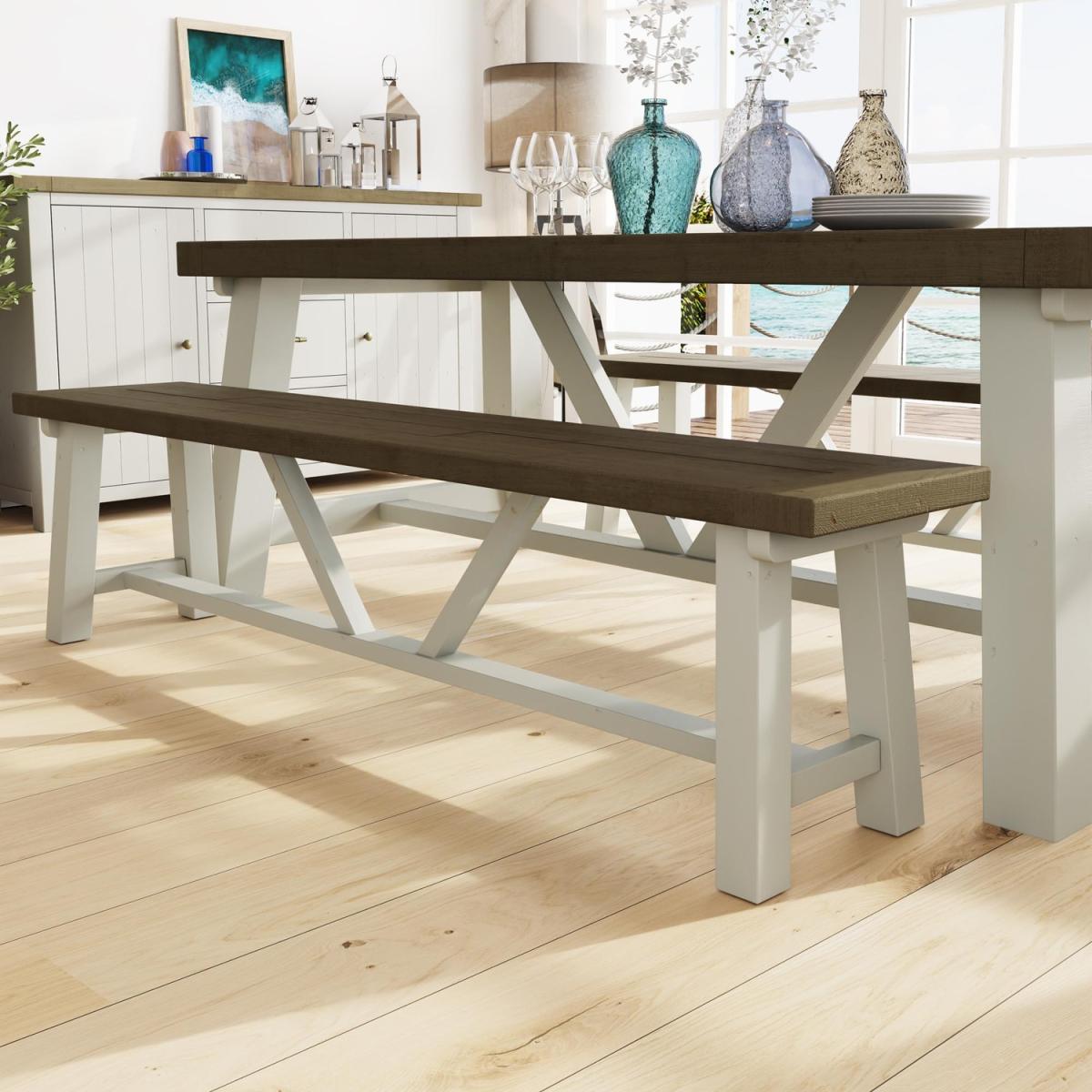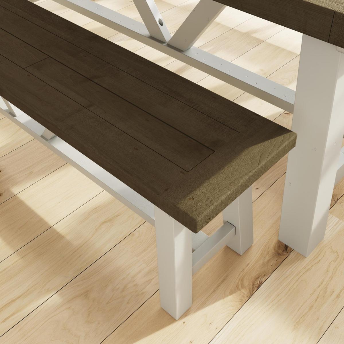 Introducing the Luxury Solid Reclaimed Pine 1.8. M Dining Bench, a versatile and stylish seating option designed to complement your dining area. Crafted with care and made from solid reclaimed pine, this dining bench offers a touch of rustic charm and environmental consciousness to your home. Designed to pair perfectly with the matching dining tables from the Luxury collection, this bench creates a cohesive and visually appealing dining set. The two-tone colors of the bench, with a driftwood top and truffle body, add depth and character to your dining space. The driftwood top brings a natural and organic feel, while the truffle body adds a touch of elegance and sophistication.