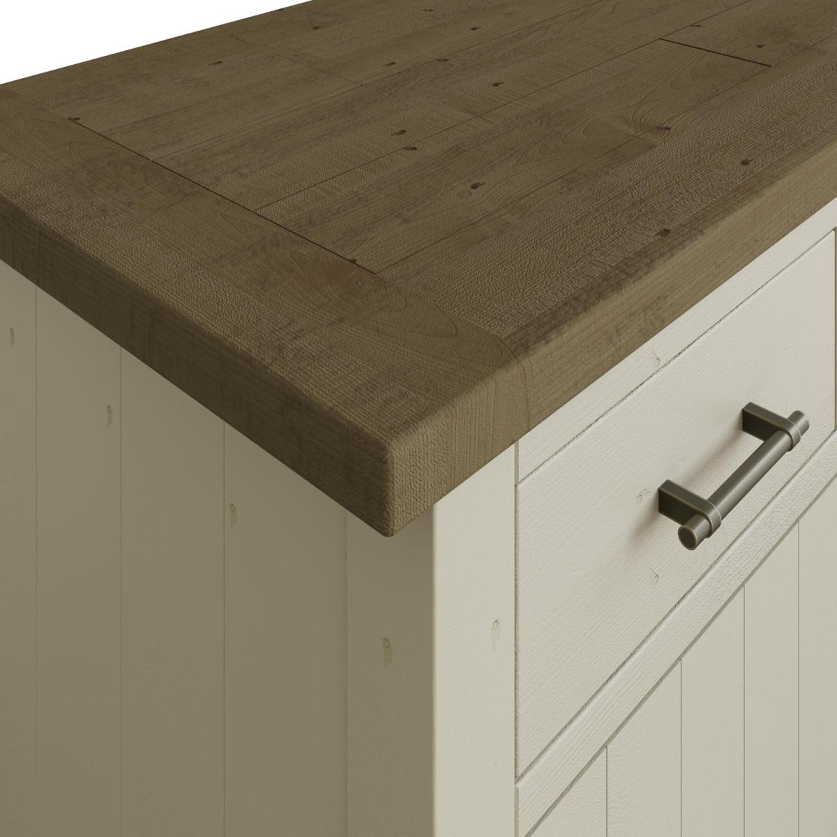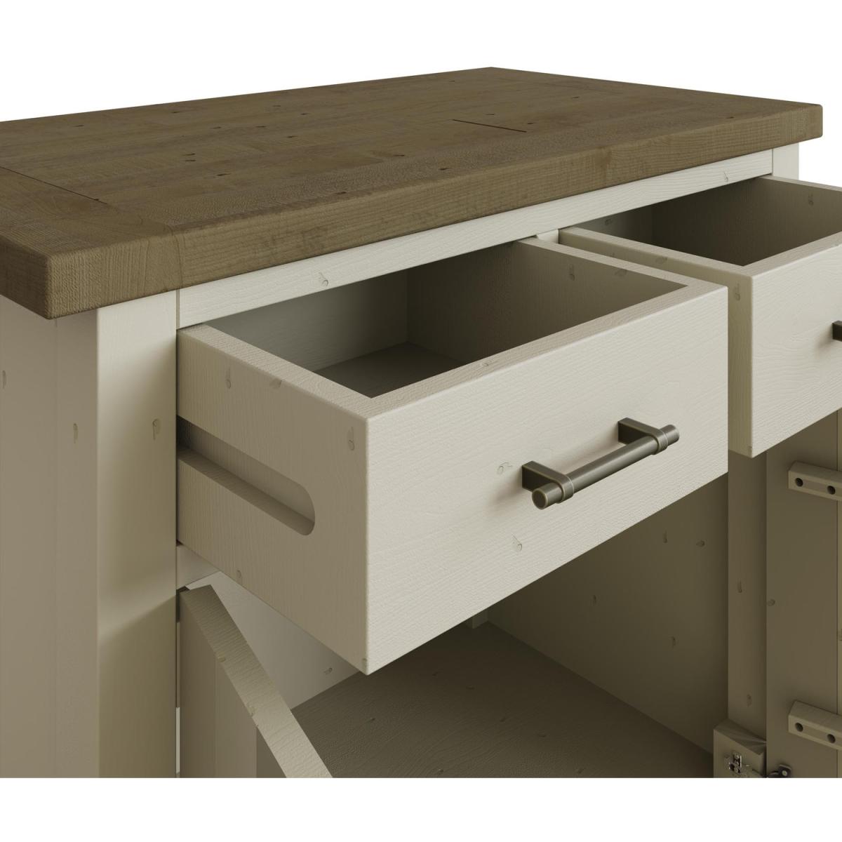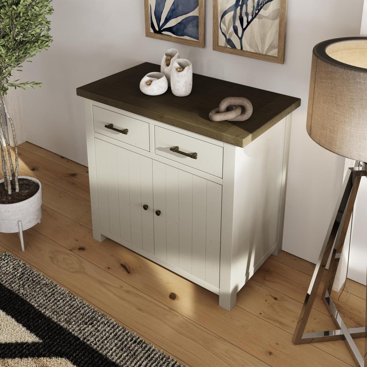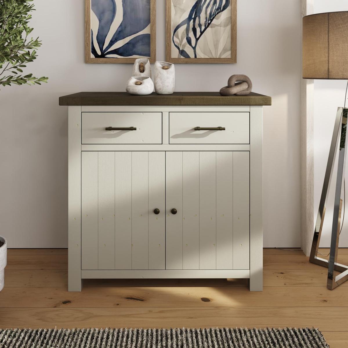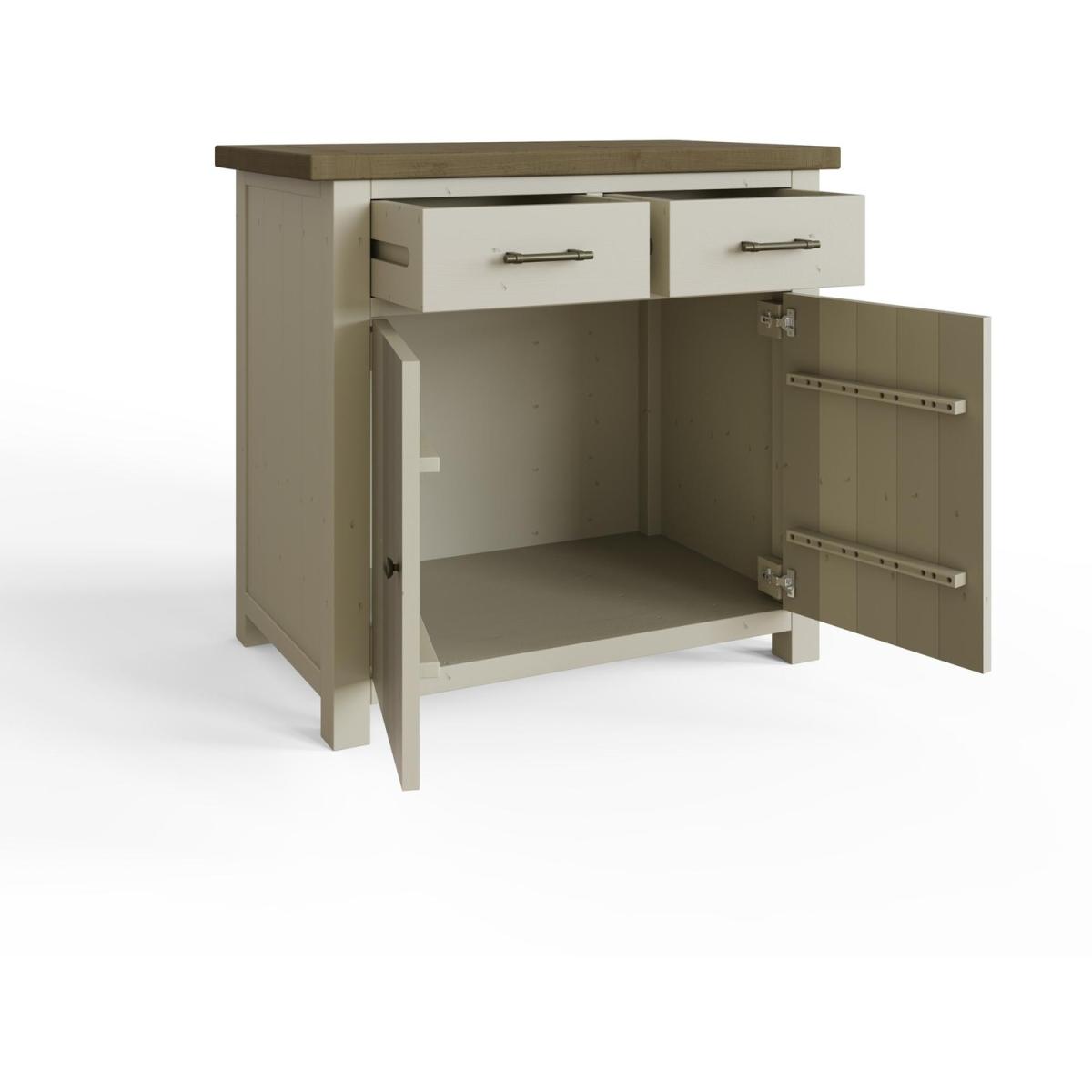 Introducing the epitome of rustic charm and practicality - our reclaimed pine sideboard with 2 doors and 2 drawers! Crafted with meticulous attention to detail, this stunning piece offers both style and functionality to elevate your living space. Made from reclaimed pine, each sideboard boasts a unique story and character that adds warmth and depth to any room. The panelled top features a beautiful driftwood color, while the rest of the sideboard is elegantly painted in a truffle hue, creating a harmonious blend that complements any decor. Equipped with two generous doors, two convenient drawers, and an internal shelf, this sideboard provides ample storage space to keep your essentials organised and within easy reach. From fine china to table linens, it effortlessly accommodates your belongings while maintaining an air of effortless sophistication.