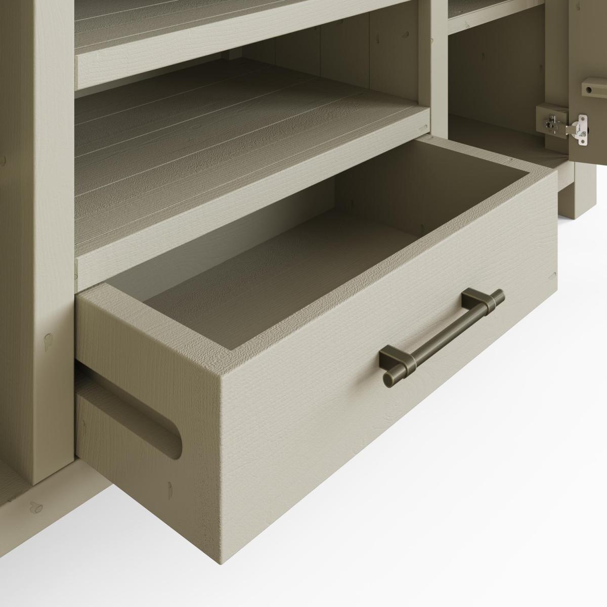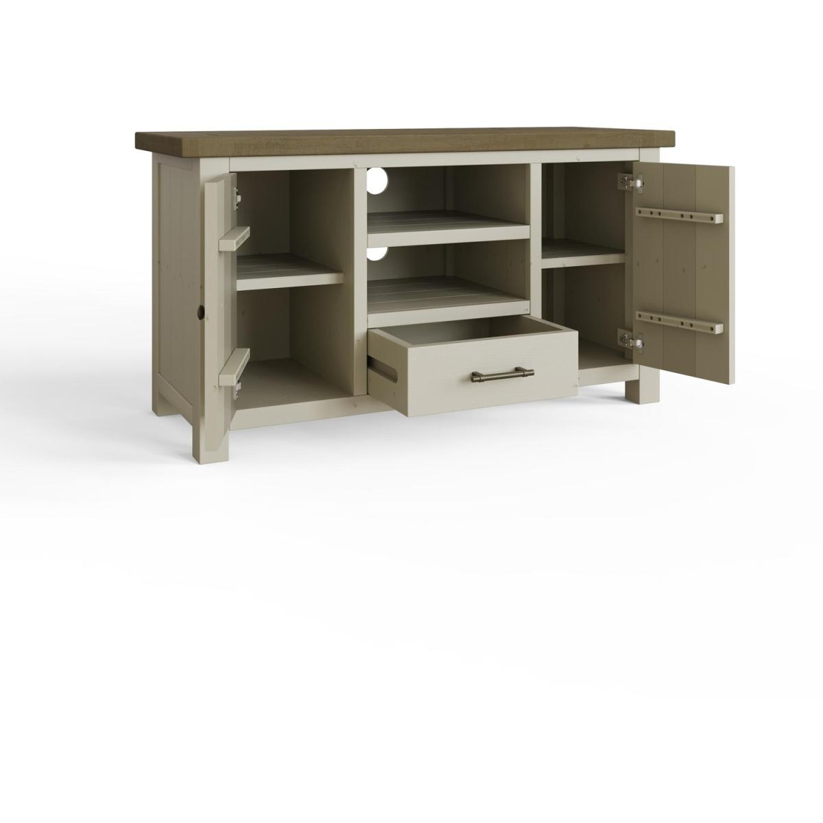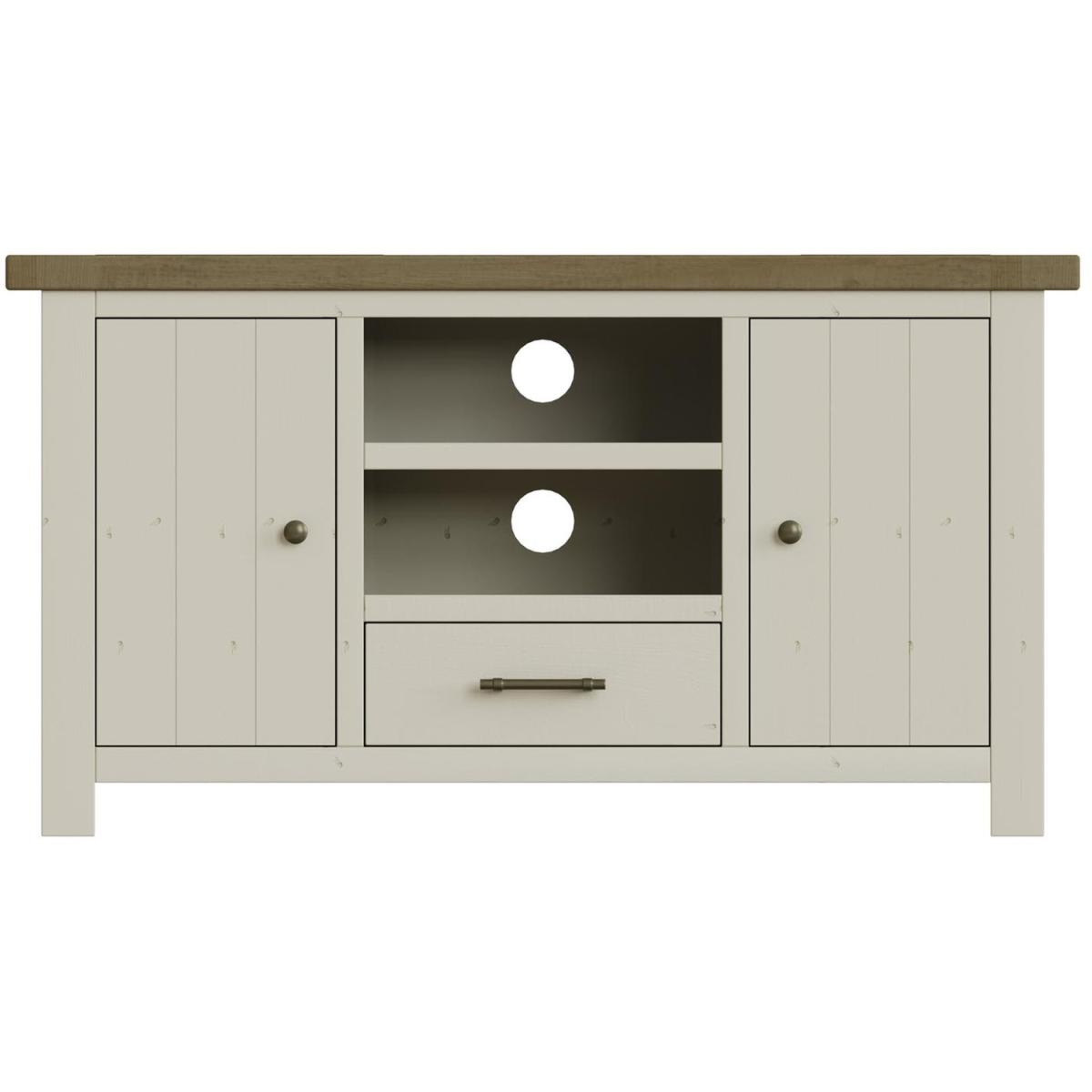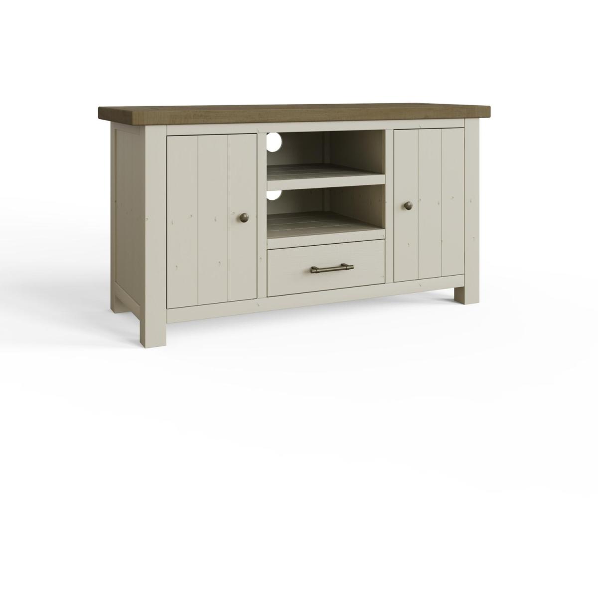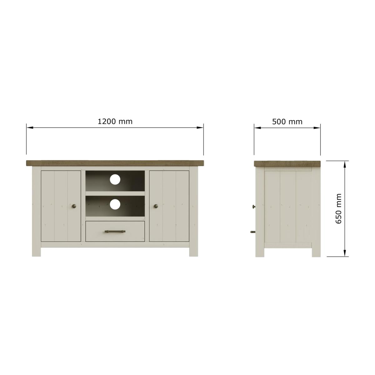 Introducing our remarkable reclaimed pine TV unit, designed to seamlessly blend style and functionality in your entertainment space. Crafted with care and attention to detail, this unit is a perfect match for those seeking both aesthetic appeal and practical storage solutions. Constructed with reclaimed pine, this TV unit showcases the natural beauty of the wood, giving it a unique character that sets it apart. With a captivating driftwood colour on the top surface and a tasteful truffle finish on the rest, it exudes a captivating charm that complements any interior decor. Featuring two side doors, this unit offers ample storage space for your DVDs, gaming consoles, and other media essentials. Keep your entertainment area tidy, organised, and clutter-free while retaining easy access to your favourite movies and games. Additionally, two central open shelves are thoughtfully positioned to accommodate your AV equipment, providing a stylish and dedicated spot for your media devices. From Blu-ray players to sound systems, this TV unit ensures your entertainment setup remains neatly arranged while enhancing the overall visual appeal of your living space.