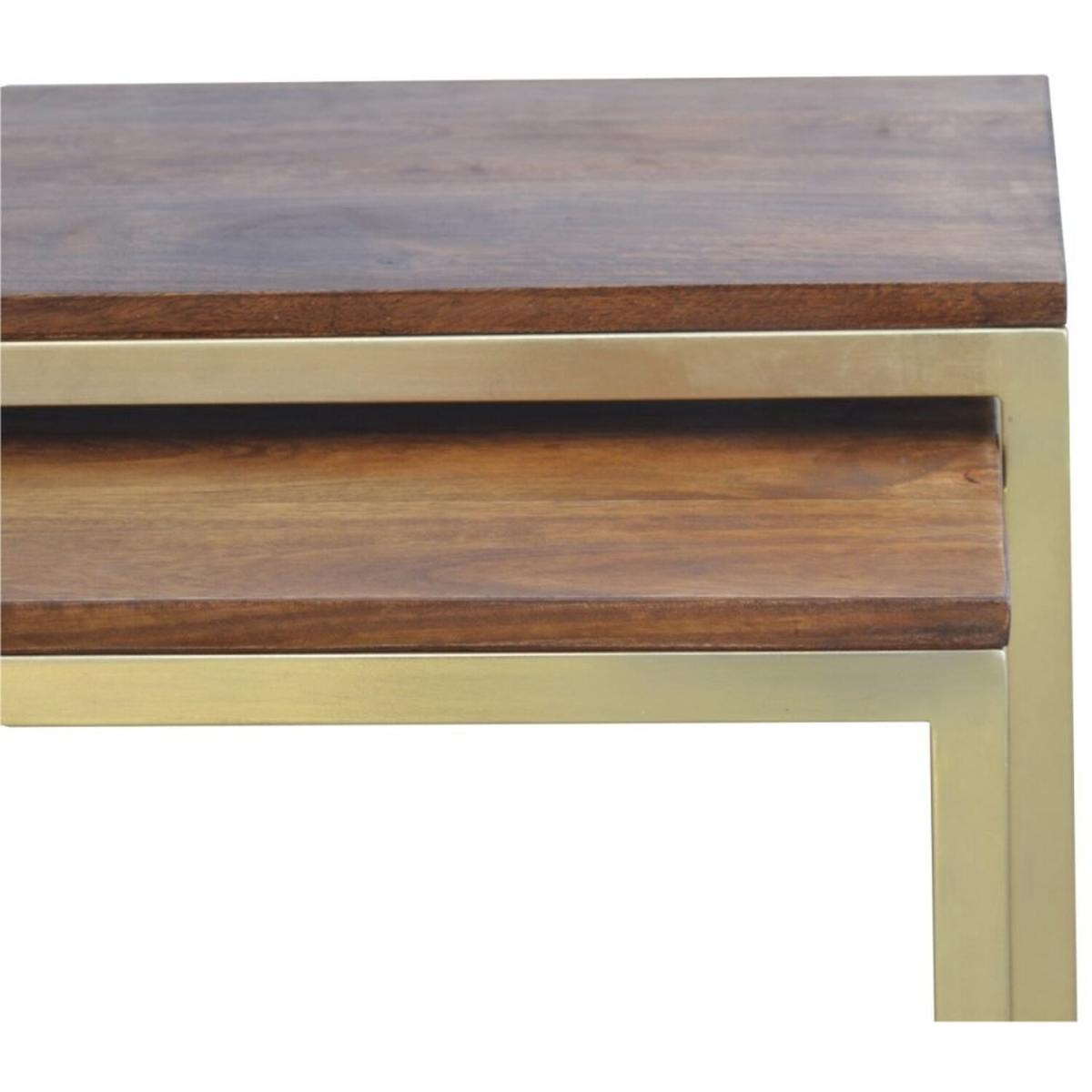 This on-trend table set of 3 has been constructed from 100% solid mango wood and features a fine, smooth Chestnut finish top and a beautiful gold touch finish on the Iron base. A very practical piece of furniture that will sit perfectly in the centre of your living room.
