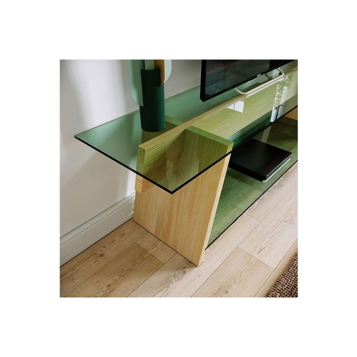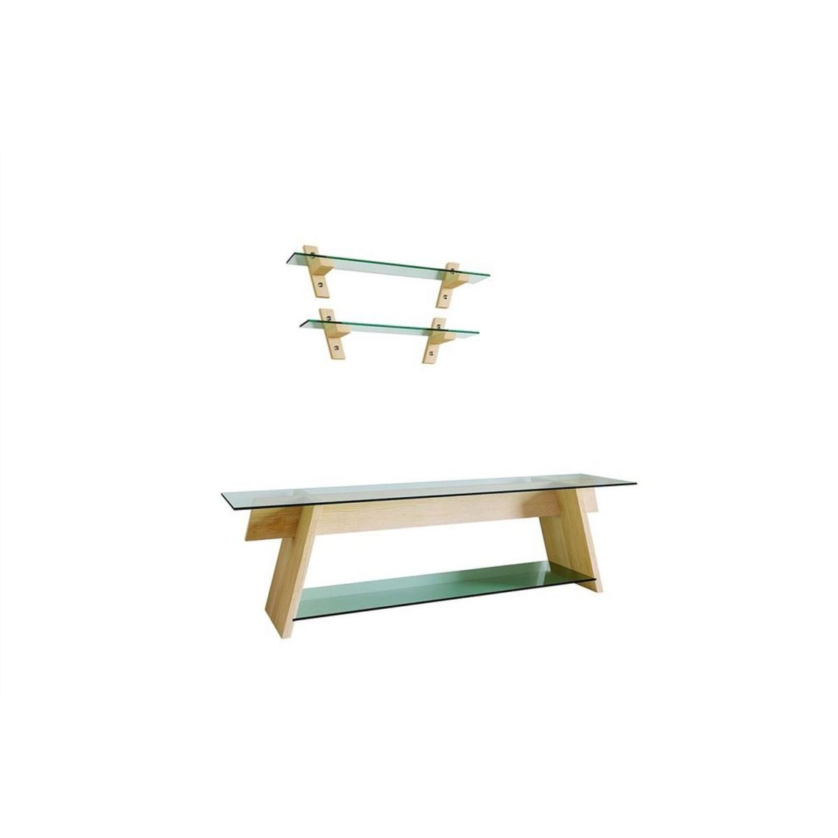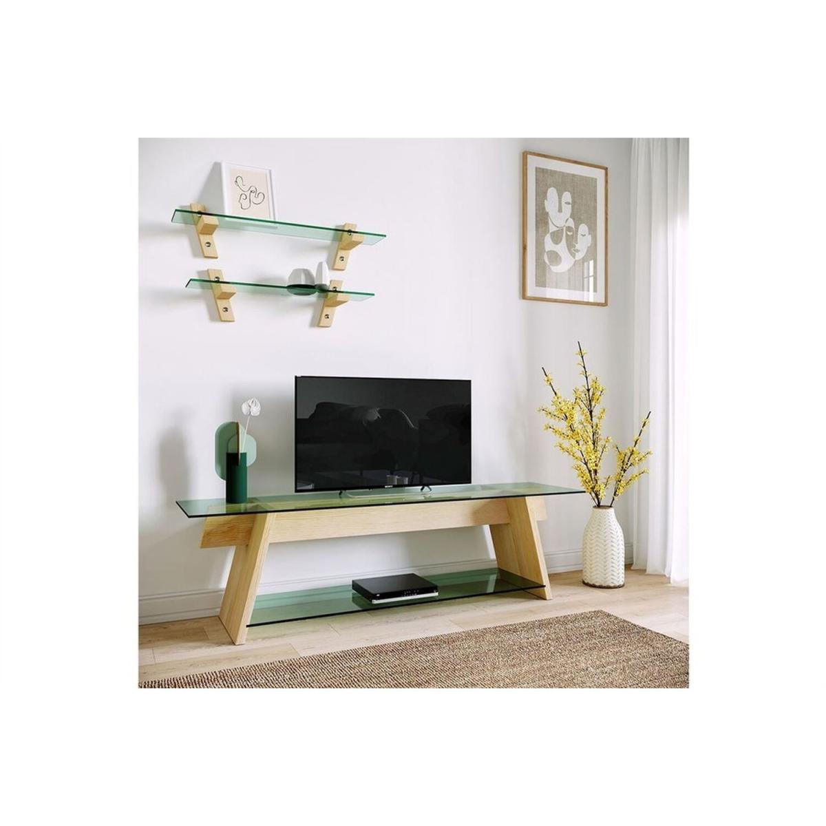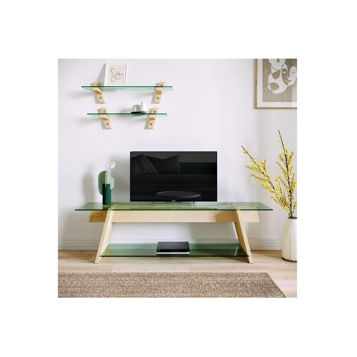 Ideal for a breezy modern look, this piece is crafted from safety tempered glass and sturdy massive wood. The TV stand is made of high-quality solid wood and tempered glass. It is coloured by hand using water-based certified wood preservatives. Perfect for hosting your consoles and other media clutter, this stand features easy wire management thanks to its minimalist silhouette. Safety feature The product is made of tempered glass material. Thanks to its material, in the event of an accident, the product will be divided into harmless granular pieces instead of large shards, which will prevent serious injuries to people.