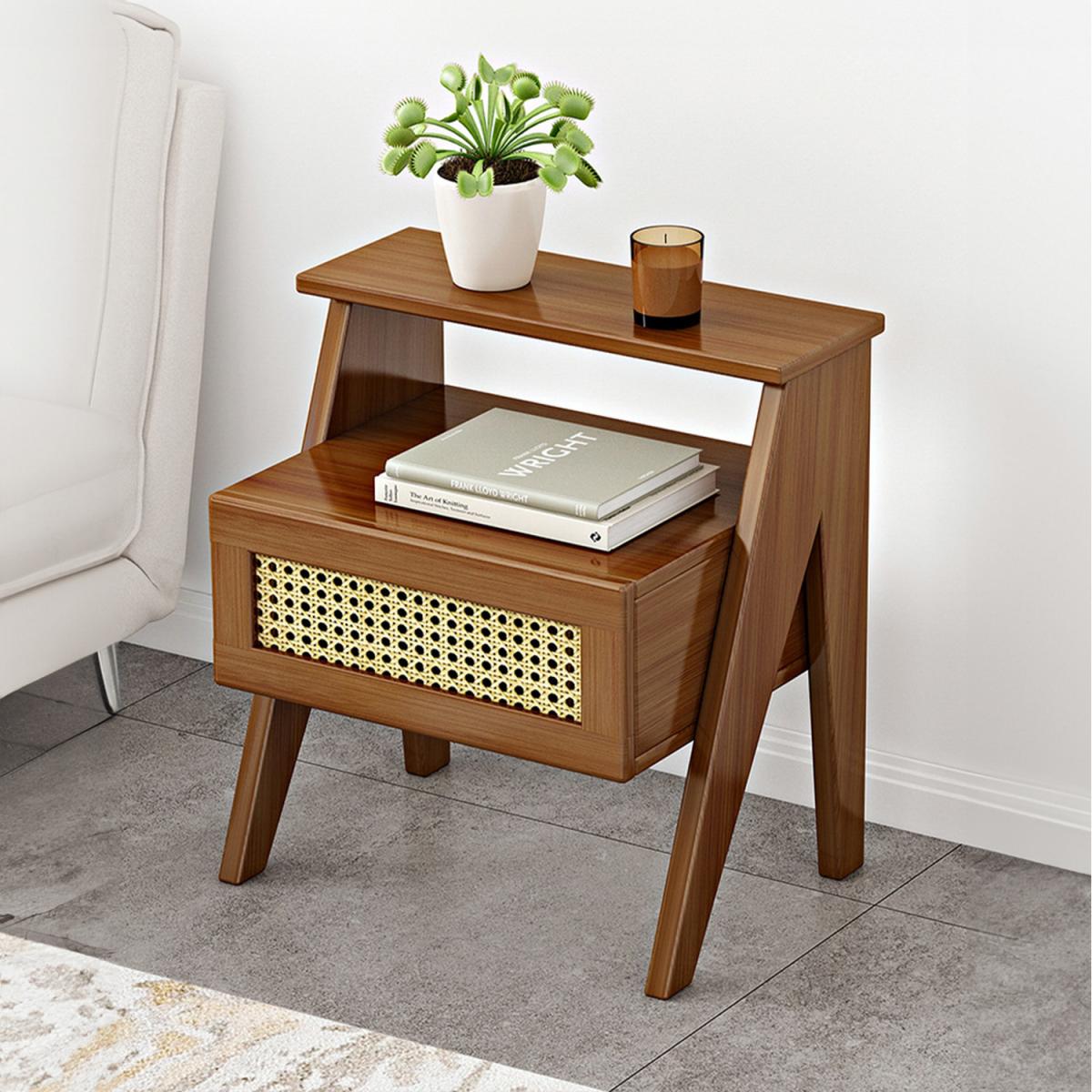 Crafted from high-quality natural wood, this modern bedside table combines durability with a simple, elegant design. Its warm tones and minimalist frame are complemented by a drawer featuring a plastic rattan front, offering convenient storage for personal items like books and glasses. The open top shelf provides space for displaying decor, alarm clocks, or other nighttime essentials. With its practical storage and stylish design, this bedside table is a perfect addition to your bedroom or living room, adding both functionality and warmth to your space.