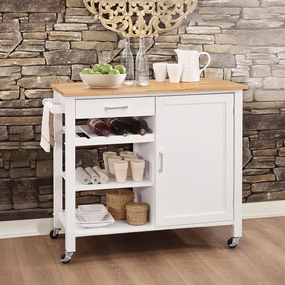 The fashionable design of this rolling kitchen trolley builds attractive and contemporary appearance, making it super suitable for any interior decoration to be widely used in the kitchen, living room, bedroom, or a mobile preparation station. A large rubber wood top, a spacious cabinet, 1 drawer and 3 storage racks can provide you with a lot of space to keep your items in the order. This wheeled bar cart is made of high-quality materials and has an exquisite wooden appearance, which will add a new level of sophistication to your next social event.