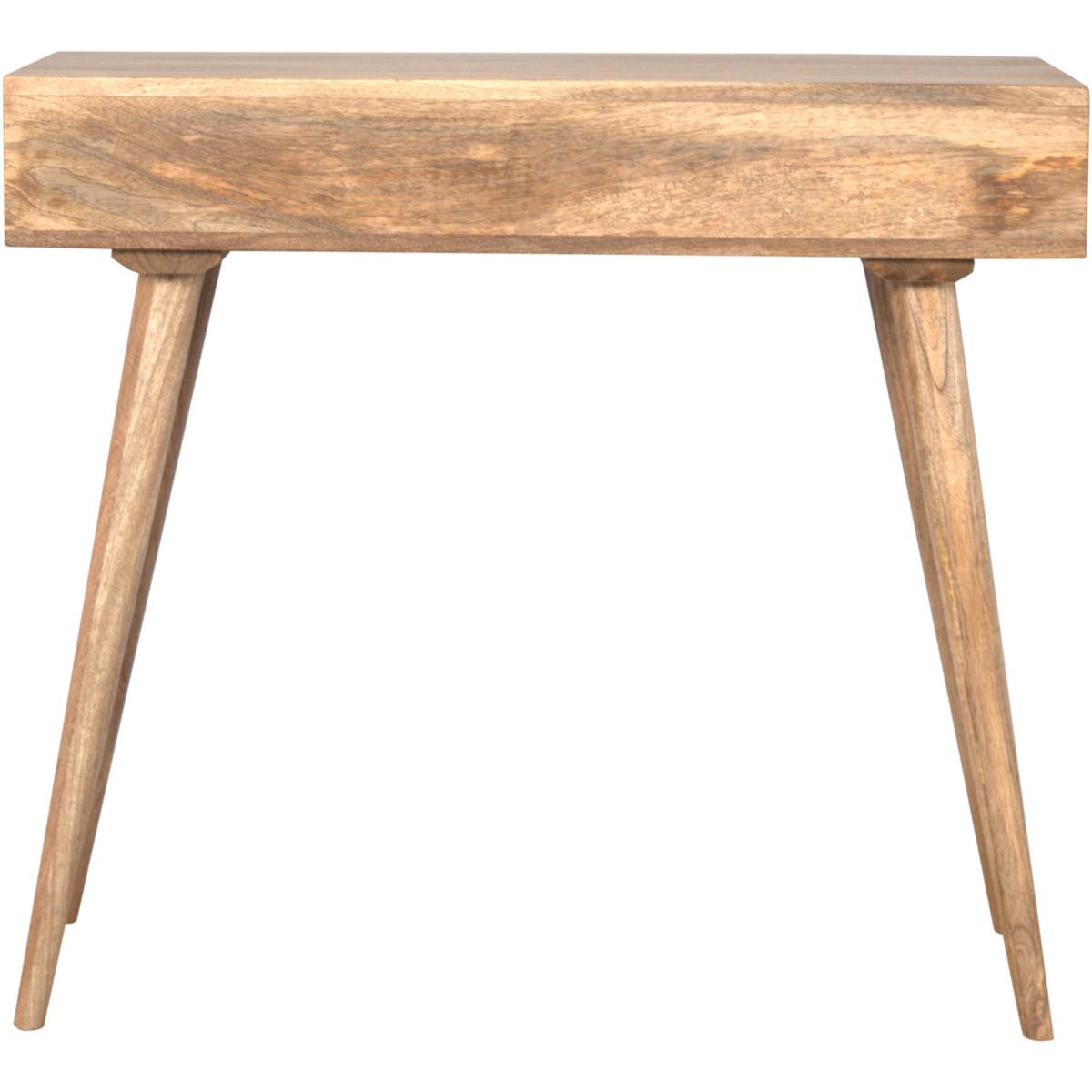 This timeless and understated solid wood desk is set on 4 Nordic style legs and has all the essential storage you will need, including a decent-sized tabletop, 1 drawer that comes with a shell handle, and an open shelf to place magazines and papers. It is constructed from 100% solid mango wood and has a fine oak-ish finish.