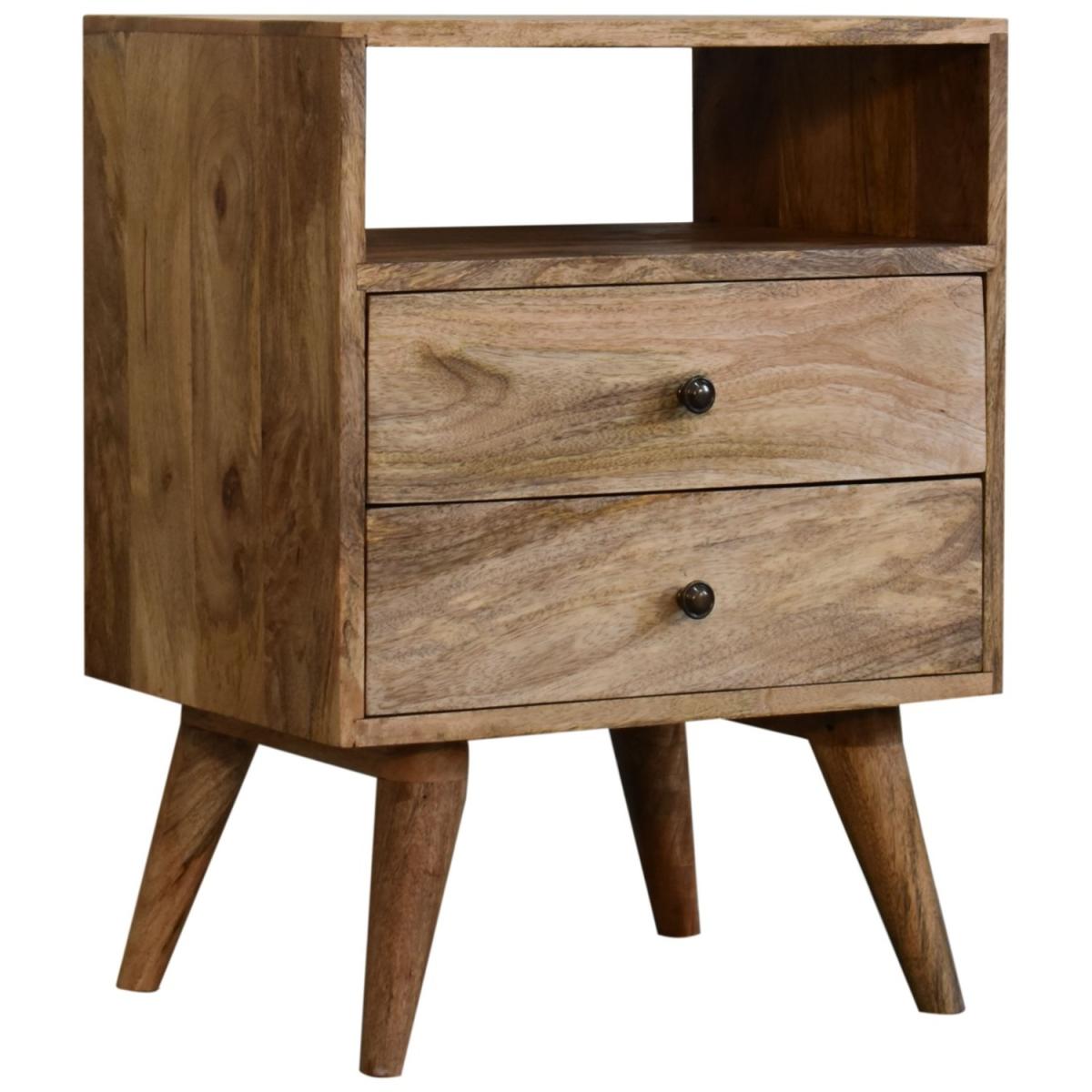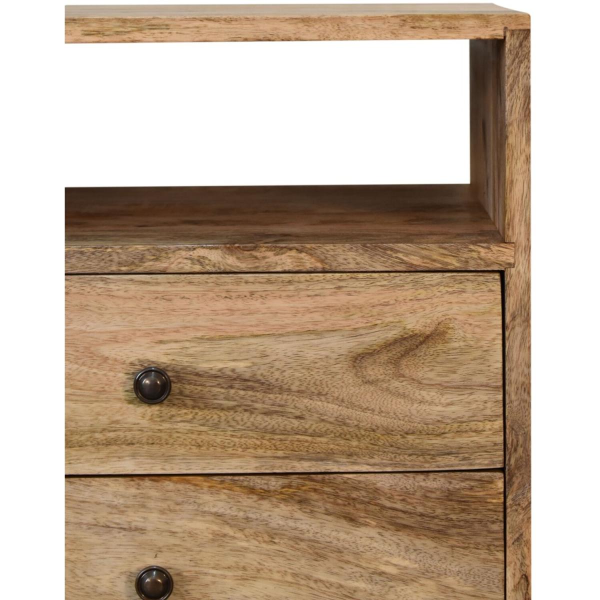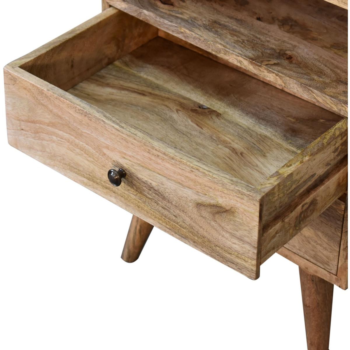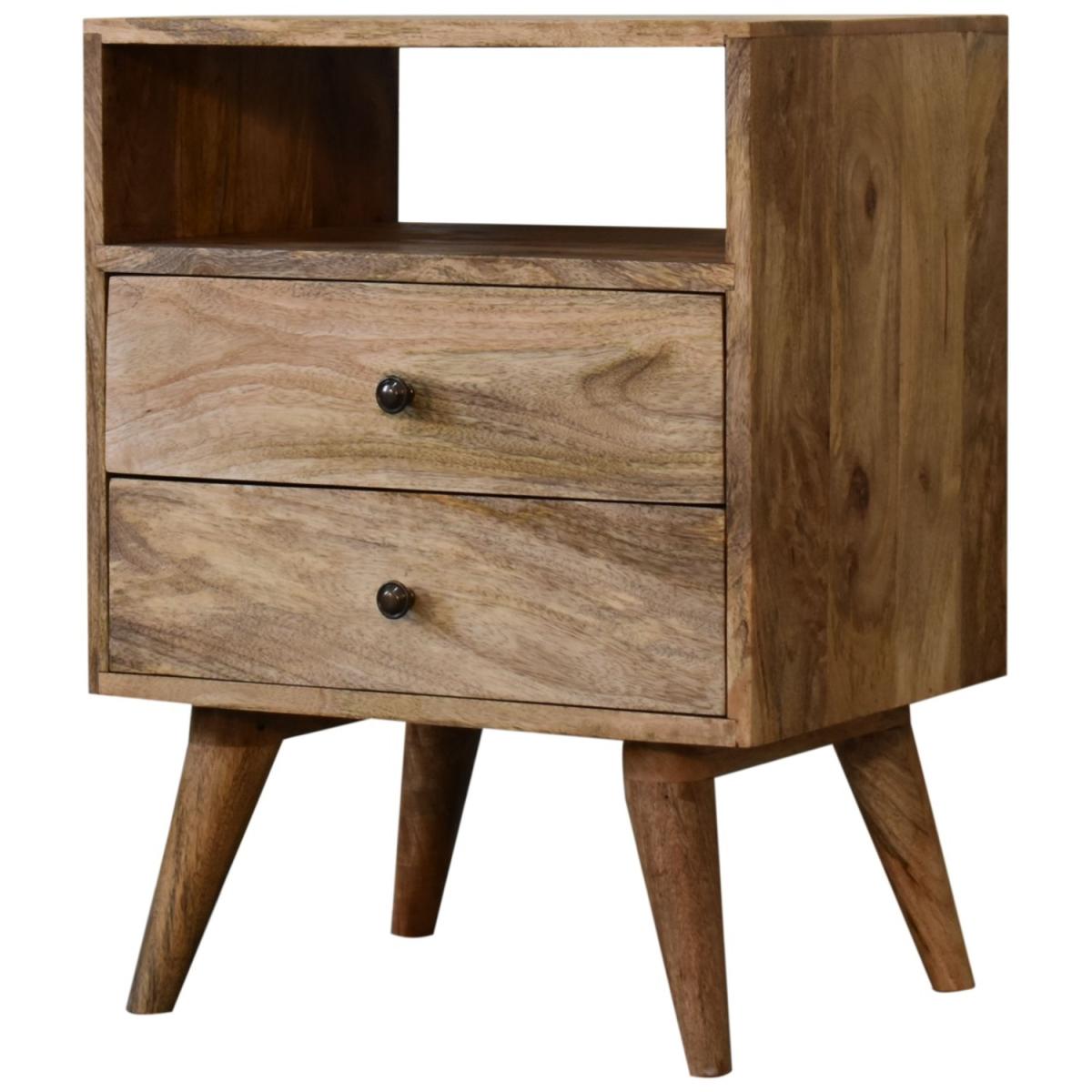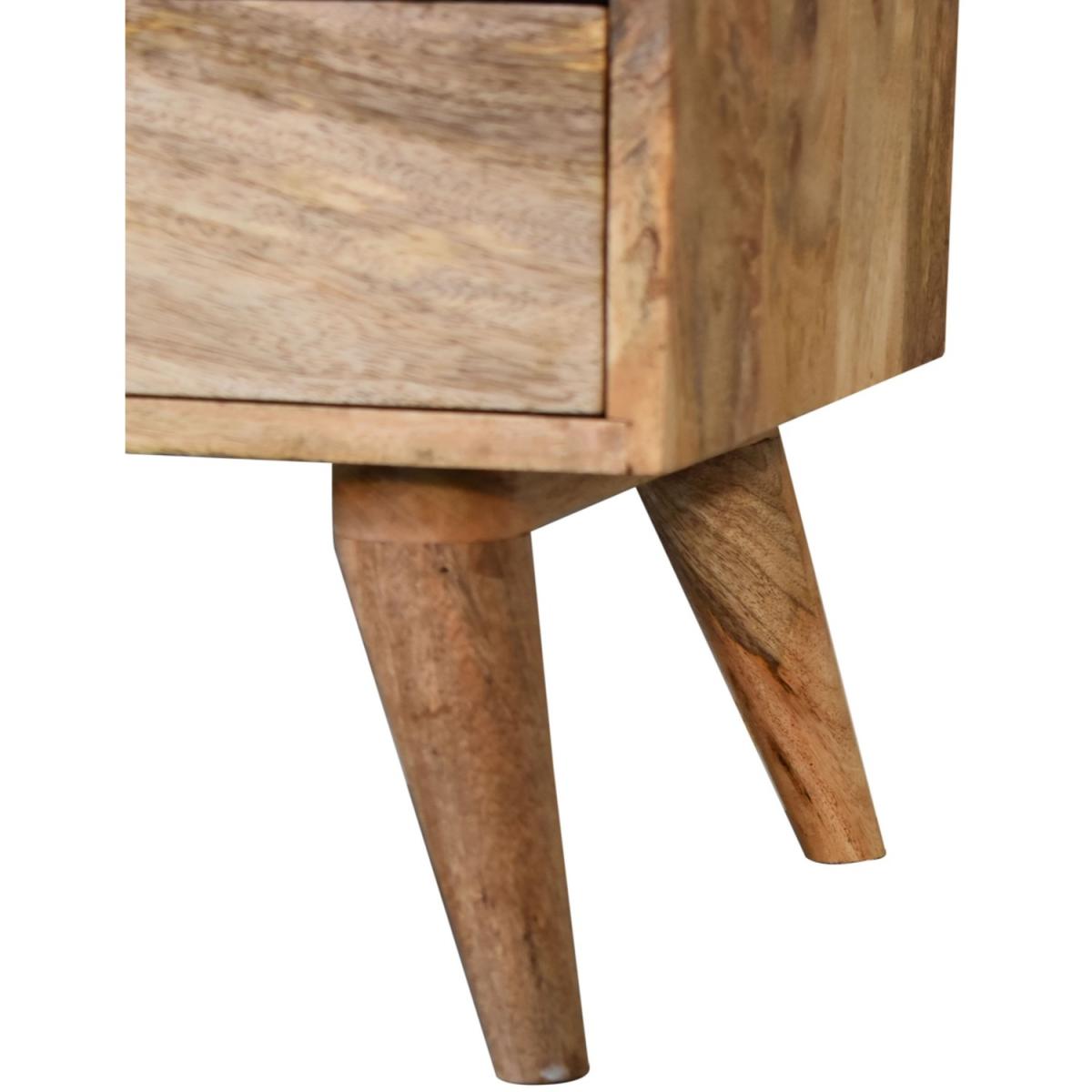 Obtain an effortless fusion of Mid-Century and Deco styles with our Classic Oak-ish Bedside. It is constructed from 100% solid mango wood and the sleek design is complemented with shiny brass knobs and nordic style legs. The perfect piece to use alone or pair with different styles and finishes of furniture.