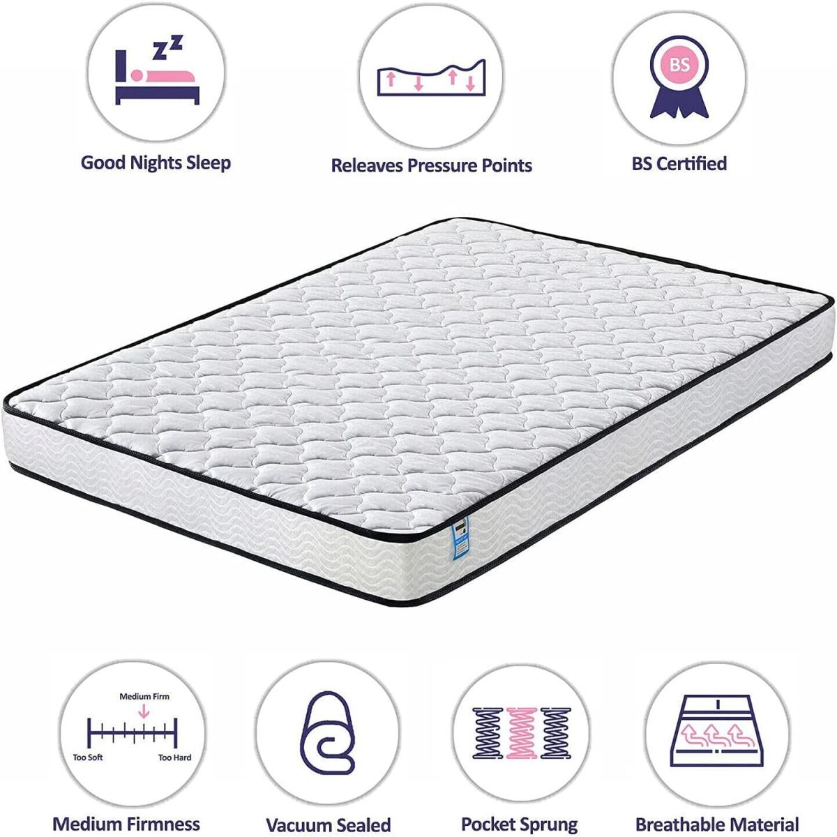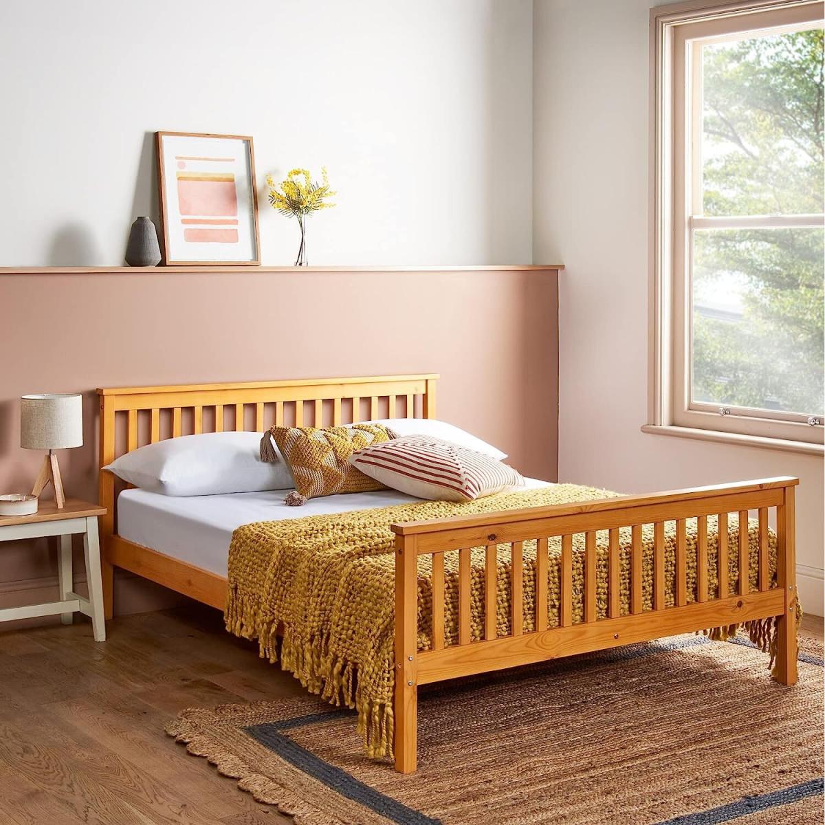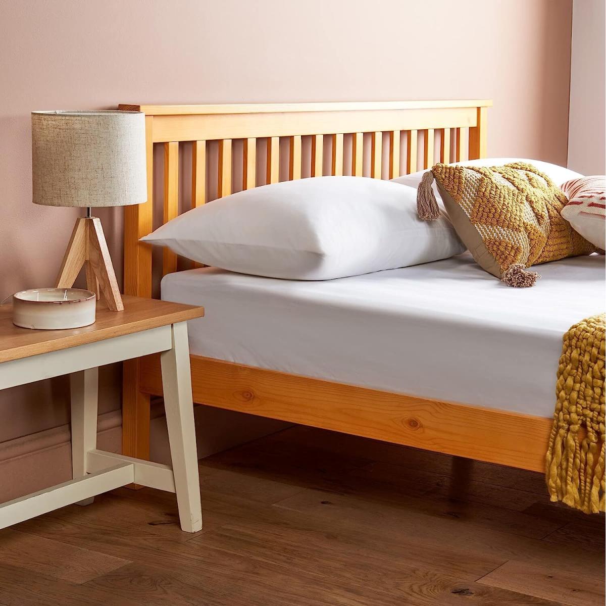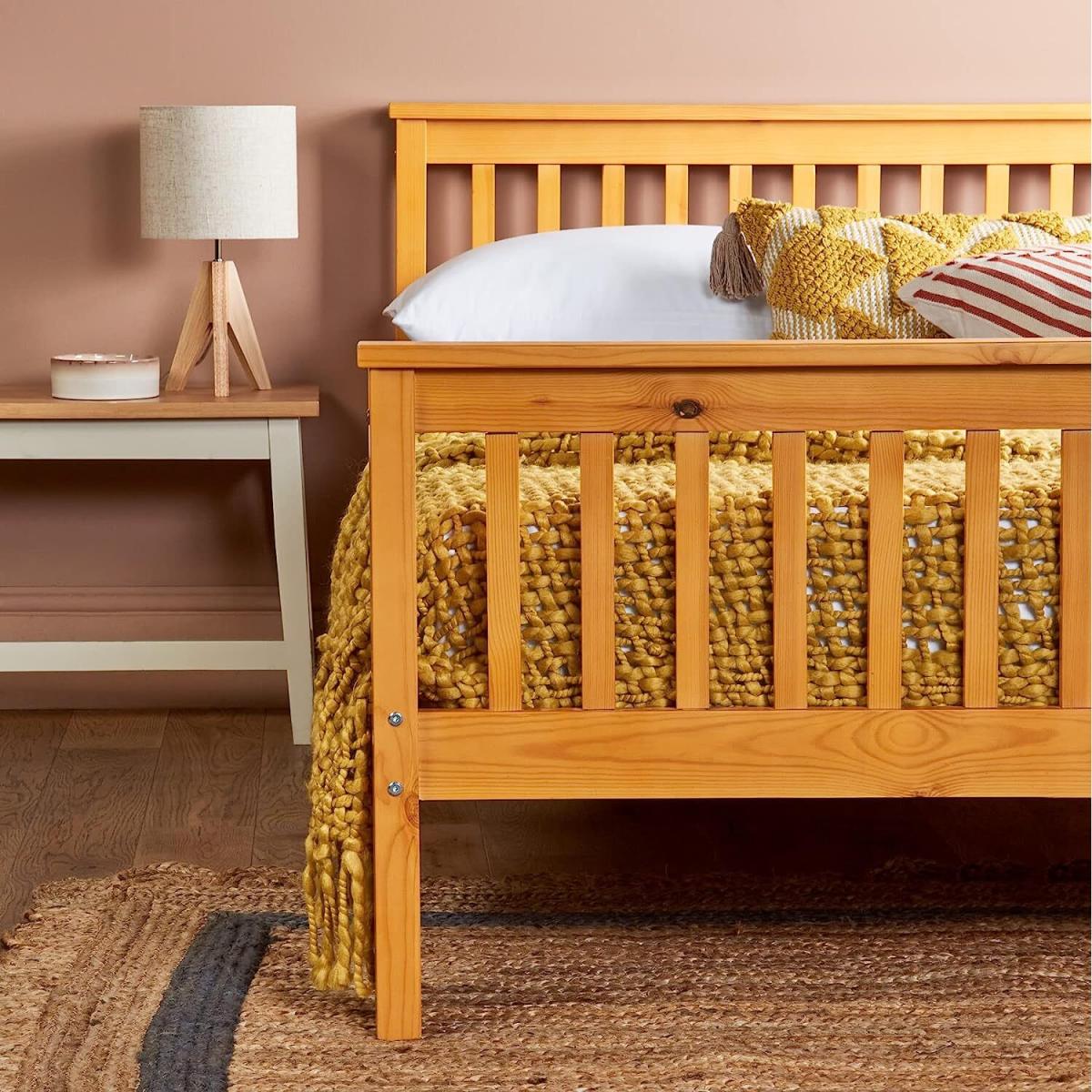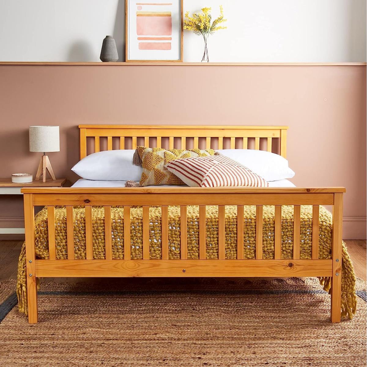 Solid double wooden bed frame with beautiful pine finish. Sleep in style the contemporary design will blend effortlessly into any bedroom interior. Featuring extra centre support legs for added strength and strength. Robust bed slats to support the mattress. Made from high grade wood, durable construction with a feature headboard and footboard included. Purchase with or without mattress. Mattress option a thick 16cm luxury pocket sprung mattress with independent pocket springs to adapt to weight. Breathable cool touch hypoallergenic cover, anti dust and anti mite. High density 400gsm foam top sleeping layer medium firm rating.