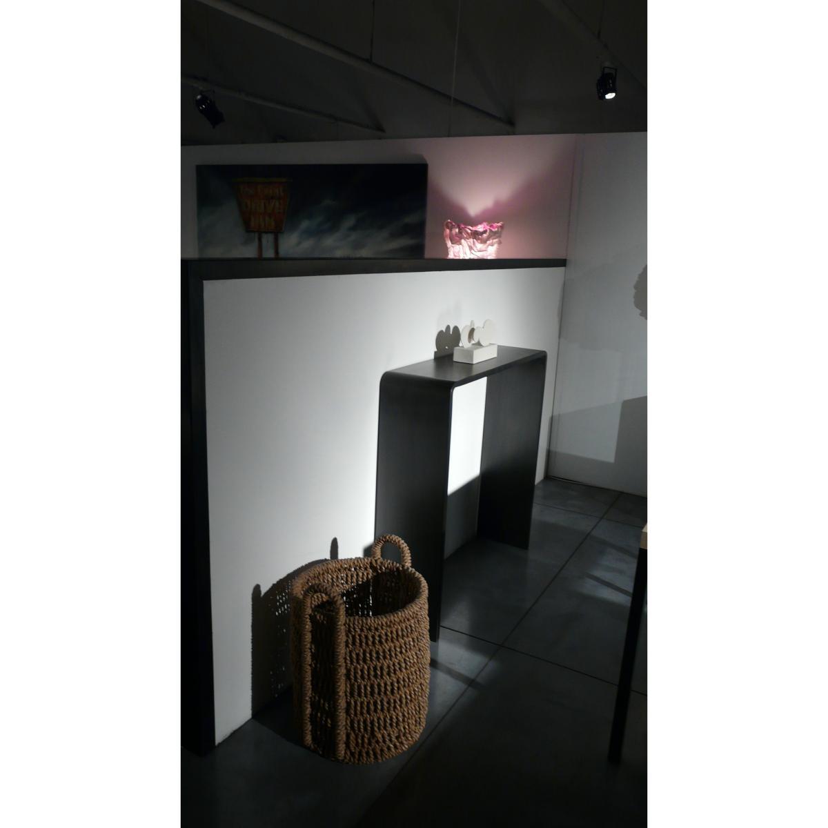 The Solitaire collection by Maurizio Peregalli becomes bigger with this console in black phosphatized stainless steel sheet (H 100 cm). Simple shape and rounded corners. Final fixing with bees' wax.