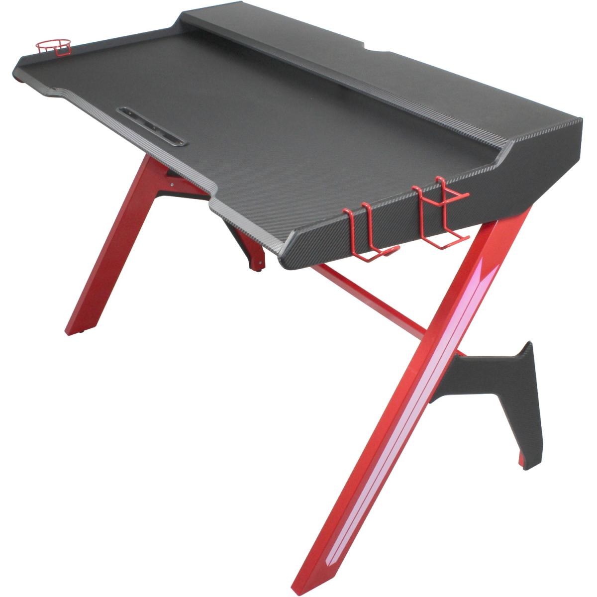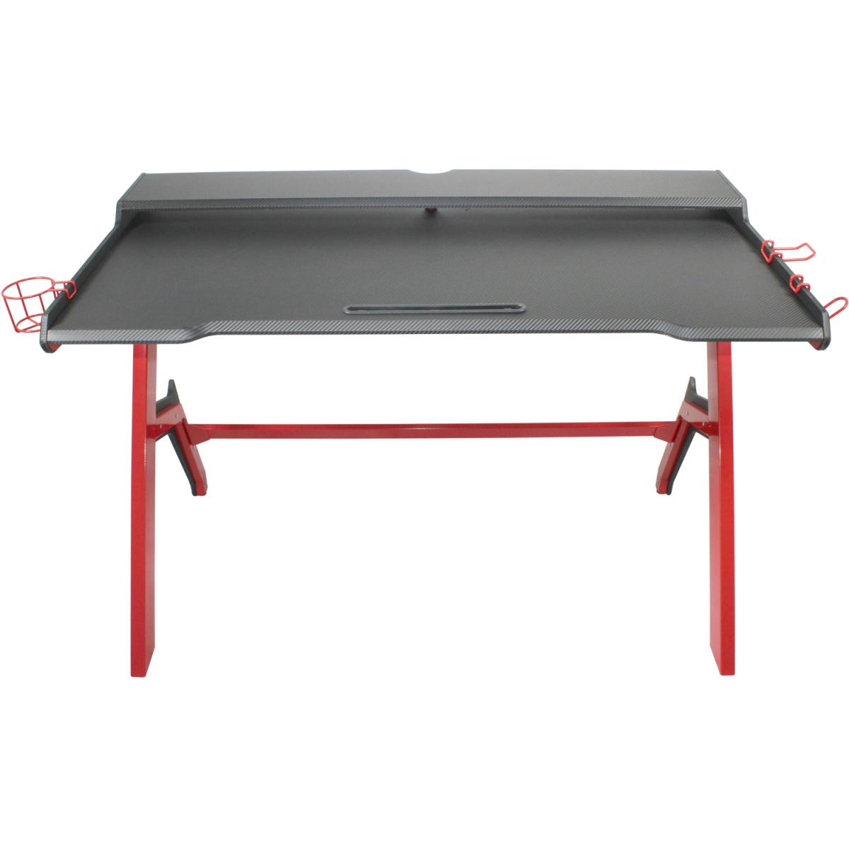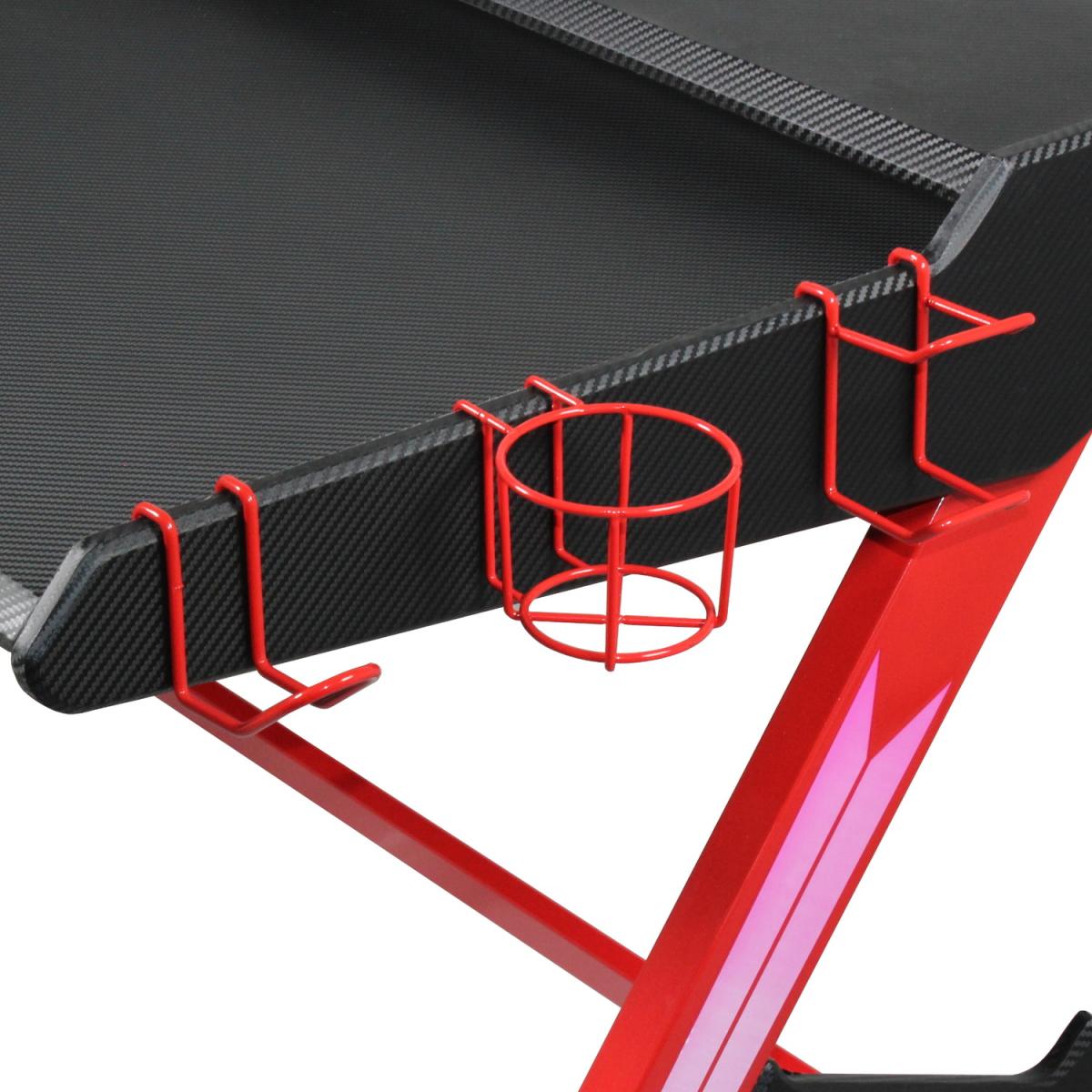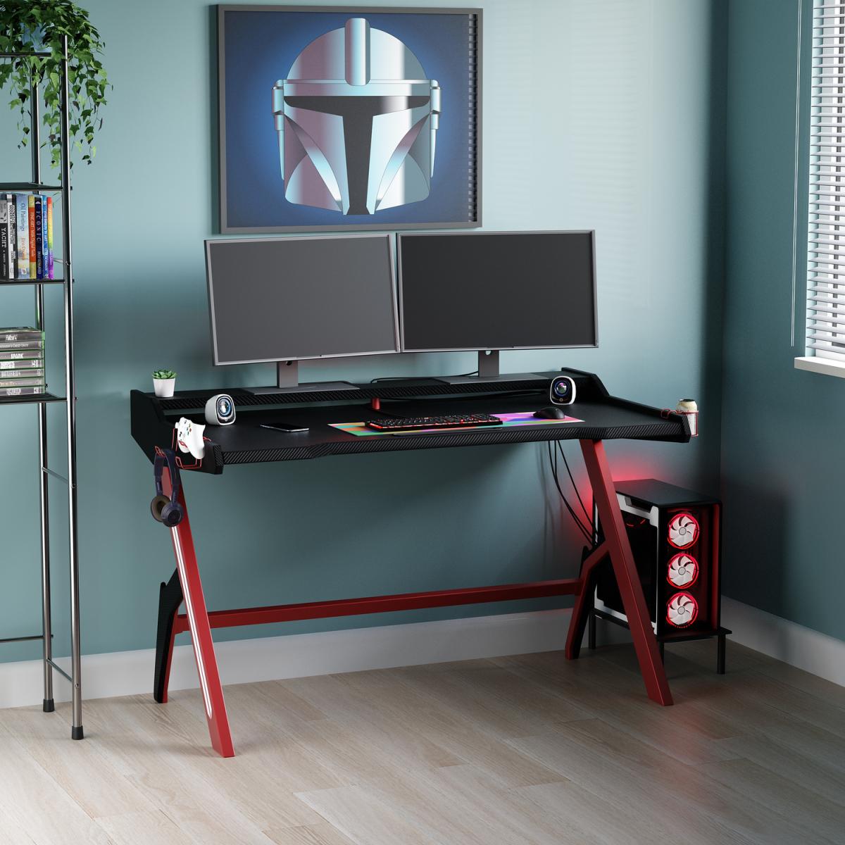 The gaming computer desk takes gaming to a whole new level. Its sleek, stylish looks combined with practical features, premium build quality and innovative design, ideal for gamers of all ages. Ergonomically designed to deliver the ultimate pro gaming experience in optimal comfort. The easy to assemble desk incorporates a sleek looking Carbon Fibre style moulded top and plenty of space for your giant screen or dual screen monitors. Customise your preferences with one movable headphone hook, one movable games controller holder and one movable cup holder, so you can stay refreshed whilst playing your favourite game. When you finish your gaming, there is plenty of space for your chair to tuck neatly under the desk. Combined with sturdy and durable powder-coated steel legs, strikingly finished in red, the gaming computer desk is the perfect choice for today's gamers.