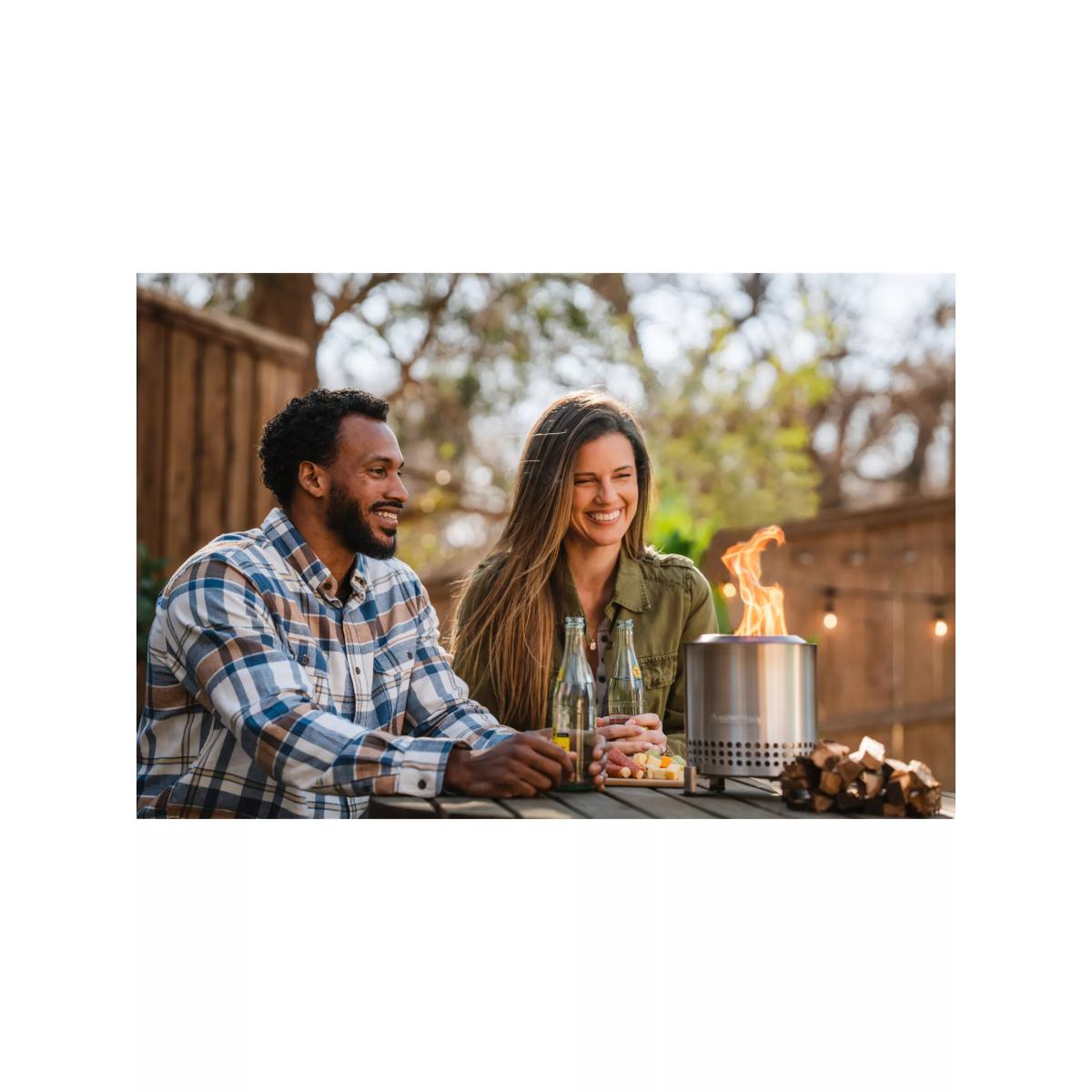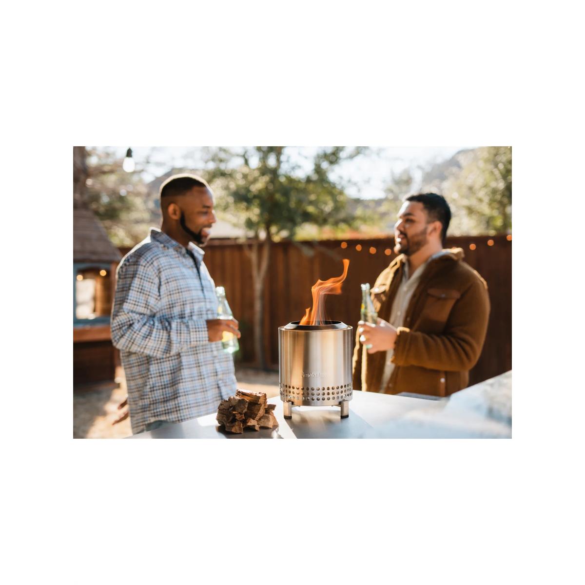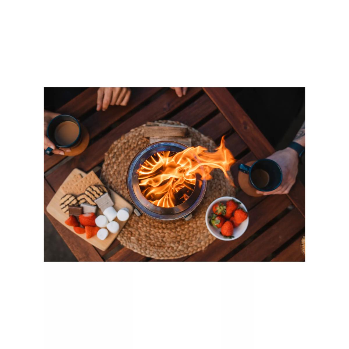 Mesa XL from Solo Stove is a tabletop firepit with dual fuel capability and a smokeless design. Mesa XL nests inside its included stainless steel stand and comes with a stainless steel flame ring and a portable nylon carry bag. Unique to this firepit, Mesa comes with a pellet adapter allowing you to burn pellets, Solo Stove Mini Oak Firewood, Solo Stove Mini Beech Wood or traditional hardwood. Smokeless The brand's Signature 360° Airflow super-heats air to burn off smoke before it can get to your clothes and hair. And without that pesky 'post-fire' smell, teary eyes or a game of musical chairs to dodge smoke, you can enjoy ultimate warmth without sacrificing comfort. Portable tabletop design Weighing in at just over 1kg, this tabletop firepit is easy to take with you where it's permitted. Spark up smokeless adventures everywhere you go, whether you're camping, tailgating, partying at the beach or just enjoying your outdoor oasis, pack up your firepit in the included carry case and get moving. Outdoor use only Mesa is for outdoor use only. It's made as a tabletop firepit, sized perfectly for outdoor dining tables and should always be used with its included stand on a stable surface. Even while using the stand, the firepit burns extremely hot, and hot air may gather underneath. Do not use on heat-sensitive materials. Do not ever leave Mesa unattended on or near a combustible surface, even when it's cooling down. Long-lasting 304-grade stainless steel is highly durable, surprisingly lightweight and won't cave under the pressure of an ultra-hot flame. Count on your firepit to hold up to all of your experiences, wherever you take it. It'll last a lifetime and has the warranty to prove it. Care and maintenance Your Solo Stove firepit needs very little maintenance. But if you want to ensure season after season of relaxing evenings around the fire, we suggest you follow these basic care tips. Choose the right wood — Hardwoods, such as oak, pecan, or hickory, and harder softwoods, such as juniper and cedar, are the best fuel for your firepit. These varieties are seasoned, meaning all the moisture has been evaporated. Wet or damp wood will create a smoky flame, as well as make your firepit harder to clean. Be careful when using wood pellets in your firepit, as the pellets can fall into the ash pan and block the airflow to the fire. After use — After your fire has gone out, check to make sure your firepit is cool to the touch. If so, tip the firepit upside down to empty the ashes. If you're unable to tip over your firepit, you can also use a shop vacuum to remove the ash. Then, we recommend you store your firepit in a cool, dry location. Gold and blue 'patina' — It's completely normal for gold and blue hues to emerge on your firepit after a handful of burns. This 'patina' is a badge of honour to how many fires you've enjoyed. The patina is caused by the firepit's 304-grade stainless steel reacting to the intense heat generated inside your firepit, but it doesn't affect its performance. However, if you like to keep your firepit or camp stove as shiny as the first time you took it out of the box, you can polish it up with Bar Keepers Friend cleaning product. Using a damp rag, rub a small amount of Bar Keepers Friend along the outside of your firepit in the direction of the stainless steel's grain.