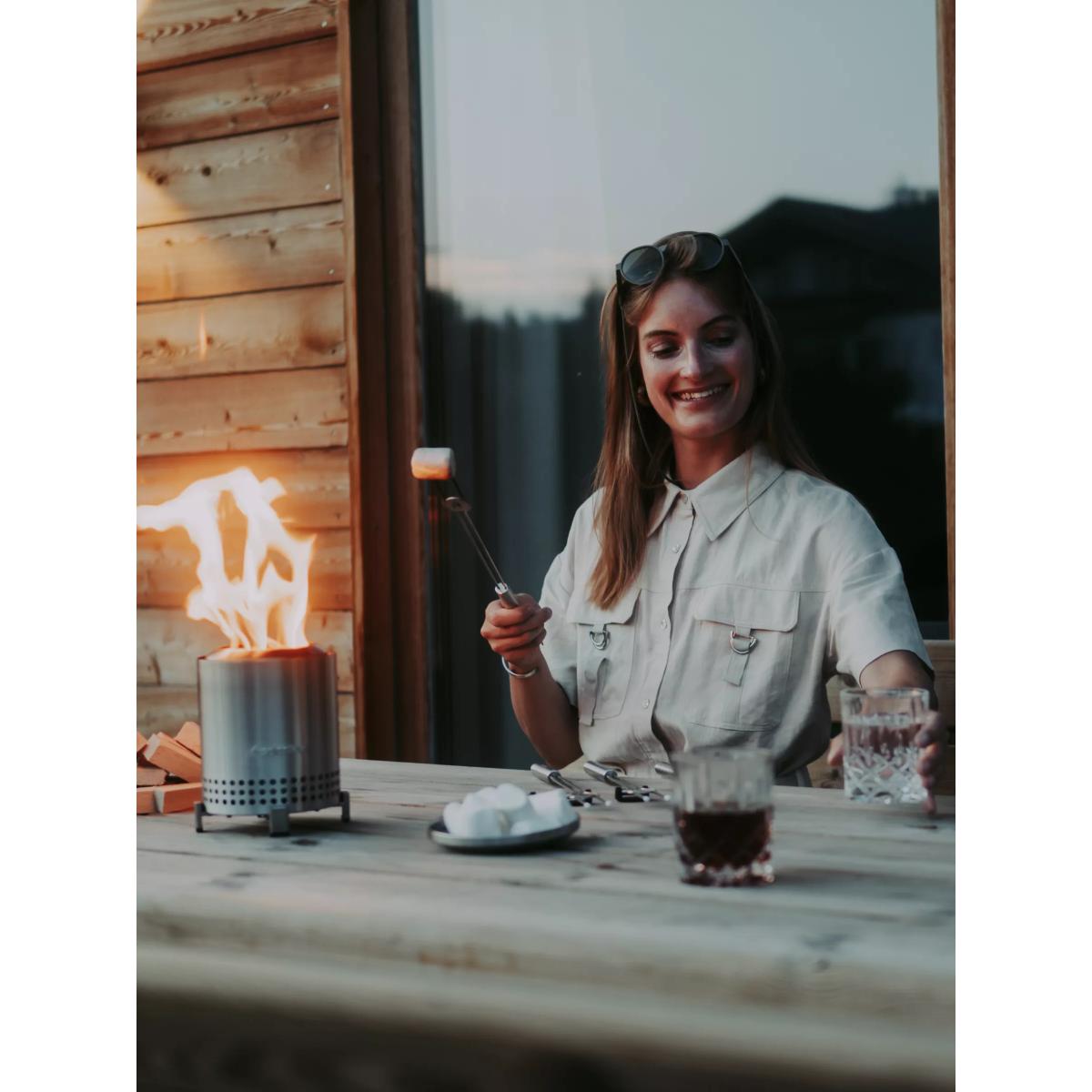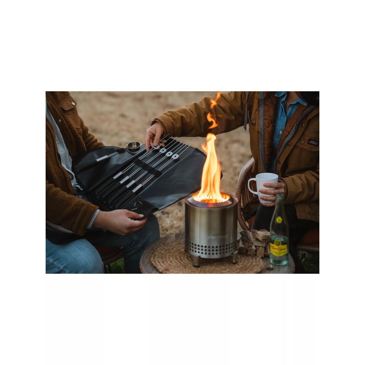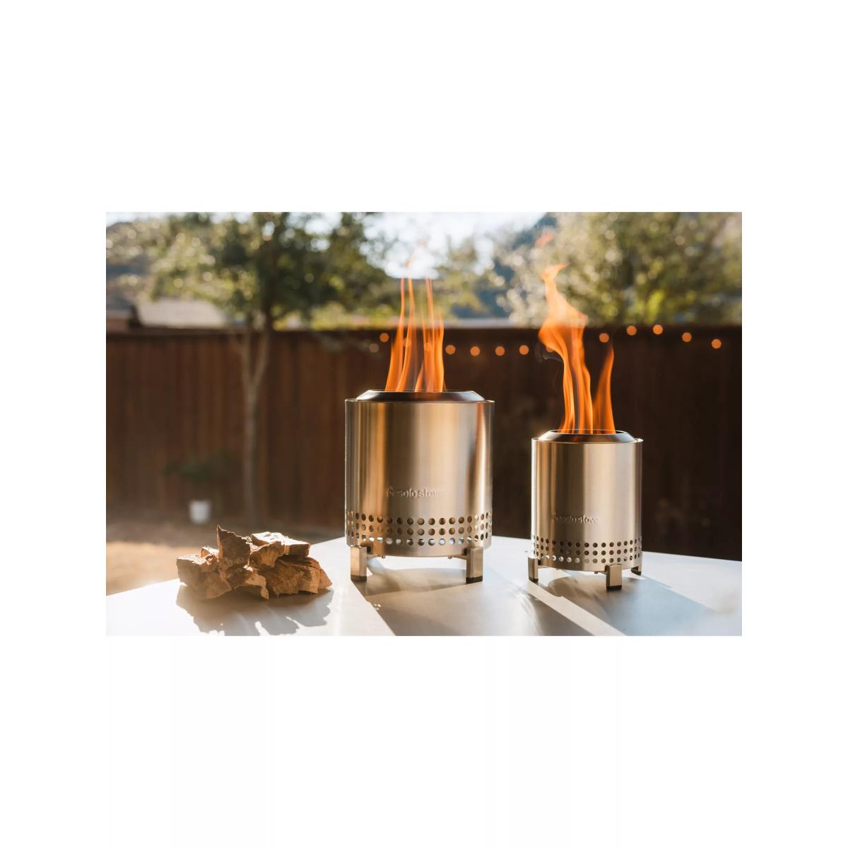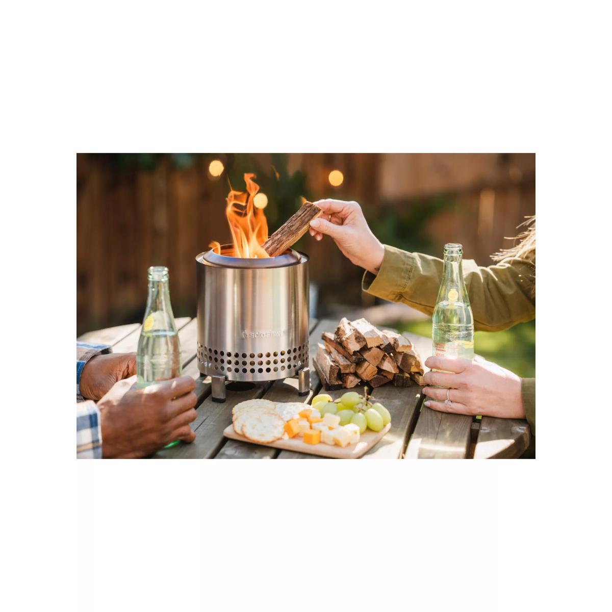 Mesa XL from Solo Stove is a tabletop firepit with dual fuel capability and a smokeless design. Mesa XL nests inside its included stainless steel stand and comes with a stainless steel flame ring and a portable nylon carry bag. Unique to this firepit, Mesa comes with a pellet adapter allowing you to burn pellets, Solo Stove Mini Oak Firewood, Solo Stove Mini Beech Wood or traditional hardwood. Smokeless The brand's Signature 360° Airflow super-heats air to burn off smoke before it can get to your clothes and hair. And without that pesky 'post-fire' smell, teary eyes or a game of musical chairs to dodge smoke, you can enjoy ultimate warmth without sacrificing comfort. Portable tabletop design Weighing in at just over 1kg, this tabletop firepit is easy to take with you where it's permitted. Spark up smokeless adventures everywhere you go, whether you're camping, tailgating, partying at the beach or just enjoying your outdoor oasis, pack up your firepit in the included carry case and get moving. Outdoor use only Mesa is for outdoor use only. It's made as a tabletop firepit, sized perfectly for outdoor dining tables and should always be used with its included stand on a stable surface. Even while using the stand, the firepit burns extremely hot, and hot air may gather underneath. Do not use on heat-sensitive materials. Do not ever leave Mesa unattended on or near a combustible surface, even when it's cooling down. Long-lasting 304-grade stainless steel is highly durable, surprisingly lightweight and won't cave under the pressure of an ultra-hot flame. Count on your firepit to hold up to all of your experiences, wherever you take it. It'll last a lifetime and has the warranty to prove it. Care and maintenance Your Solo Stove firepit needs very little maintenance. But if you want to ensure season after season of relaxing evenings around the fire, we suggest you follow these basic care tips. Choose the right wood — Hardwoods, such as oak, pecan, or hickory, and harder softwoods, such as juniper and cedar, are the best fuel for your firepit. These varieties are seasoned, meaning all the moisture has been evaporated. Wet or damp wood will create a smoky flame, as well as make your firepit harder to clean. Be careful when using wood pellets in your firepit, as the pellets can fall into the ash pan and block the airflow to the fire. After use — After your fire has gone out, check to make sure your firepit is cool to the touch. If so, tip the firepit upside down to empty the ashes. If you're unable to tip over your firepit, you can also use a shop vacuum to remove the ash. Then, we recommend you store your firepit in a cool, dry location. Gold and blue 'patina' — It's completely normal for gold and blue hues to emerge on your firepit after a handful of burns. This 'patina' is a badge of honour to how many fires you've enjoyed. The patina is caused by the firepit's 304-grade stainless steel reacting to the intense heat generated inside your firepit, but it doesn't affect its performance. However, if you like to keep your firepit or camp stove as shiny as the first time you took it out of the box, you can polish it up with Bar Keepers Friend cleaning product. Using a damp rag, rub a small amount of Bar Keepers Friend along the outside of your firepit in the direction of the stainless steel's grain.
