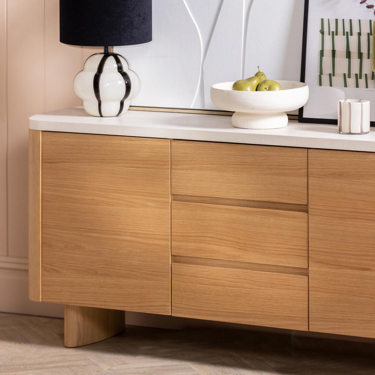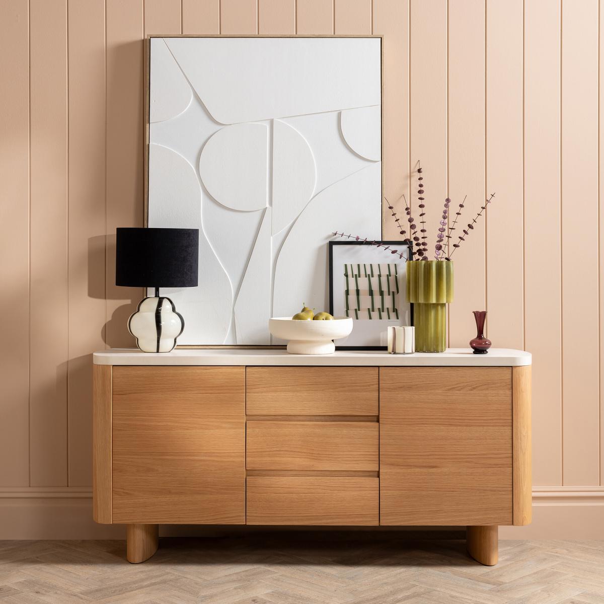 Brighten your space with this stylish sideboard, crafted from natural oak veneer and durable MDF melamine. Its gently curved sides add a modern, elegant touch, while the spacious interior offers plenty of room for storage and organisation. Perfect for living or dining areas, this piece combines practicality with timeless design, making it a standout addition to any home. Functional, chic, and effortlessly versatile, it’s the ideal blend of style and everyday convenience.