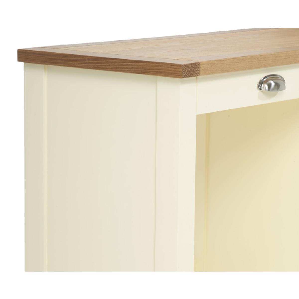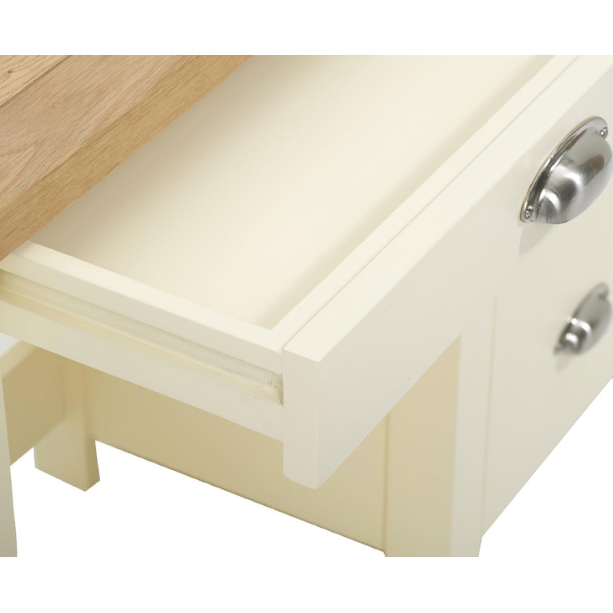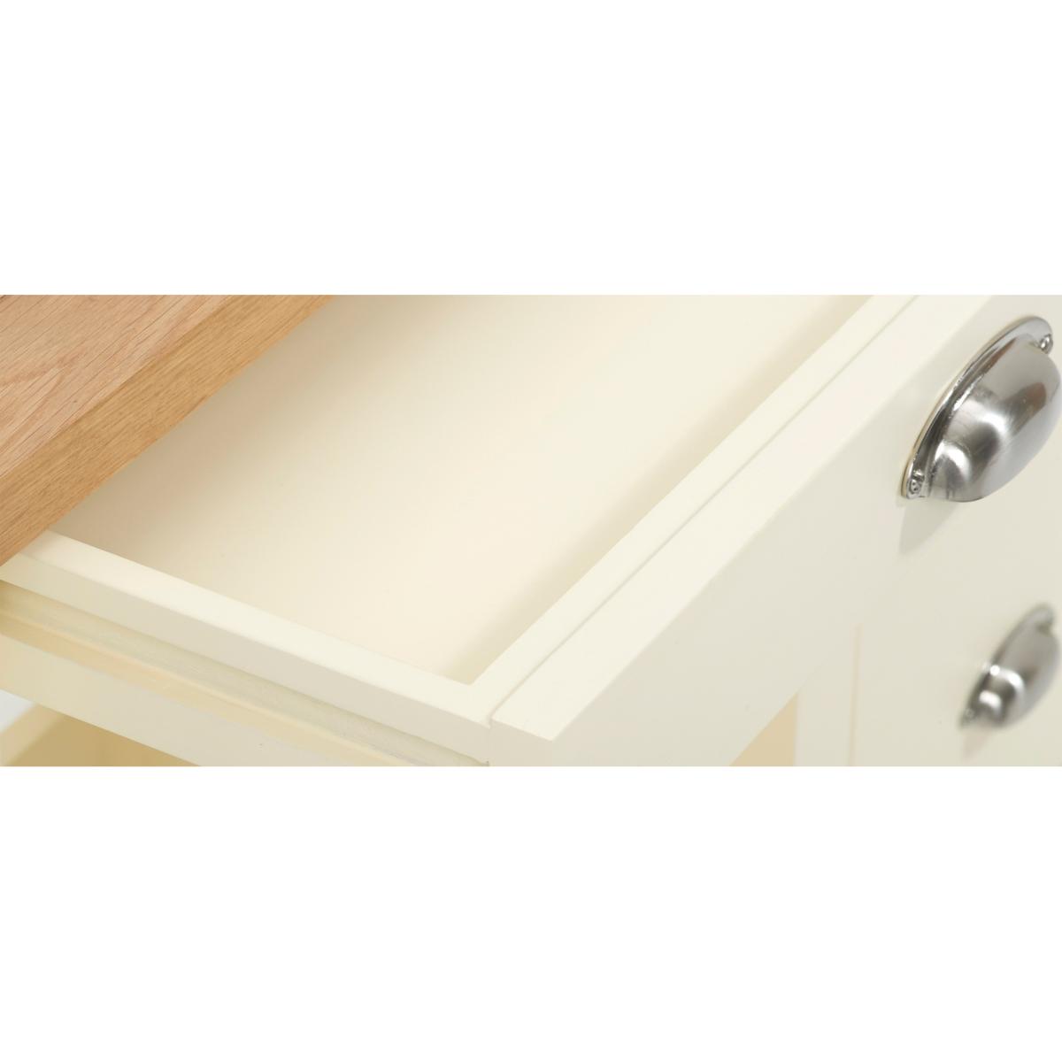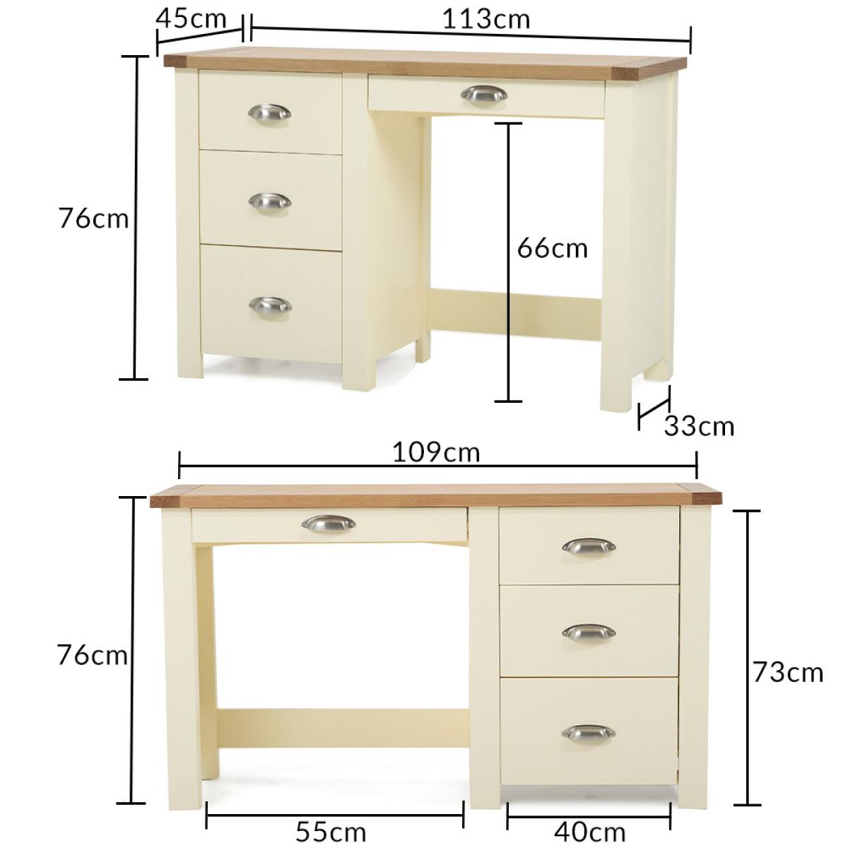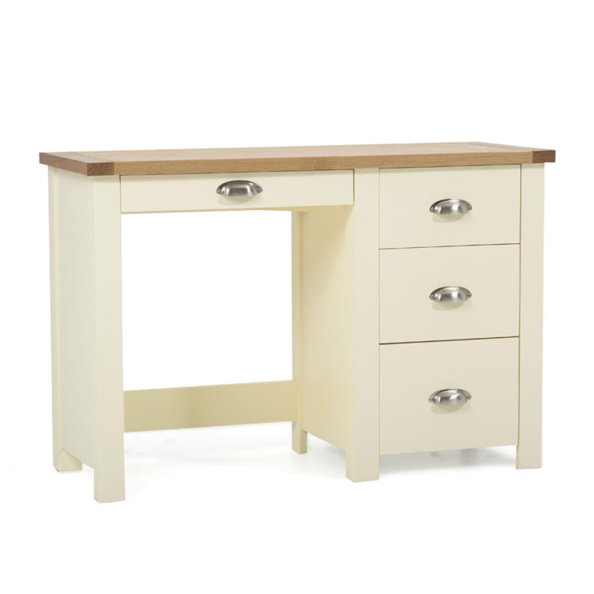 The Somerset Oak and Cream Single Pedestal Dressing Table features a stunning design to complement any bedroom setting. Perfect for displaying and storing your beauty products and jewellery, the Dressing Table is stylish and resilient. The Single Pedestal Dressing Table is crafted from solid hardwood and features a cream painted finish. Topped with veneer with solid oak edges and a clear protective lacquered finish, the Dressing Table features a wide shallow drawer and three drawers on the pedestal. The drawers are complete with sleek metal handles. The Mirror and Stool are available to purchase separately.