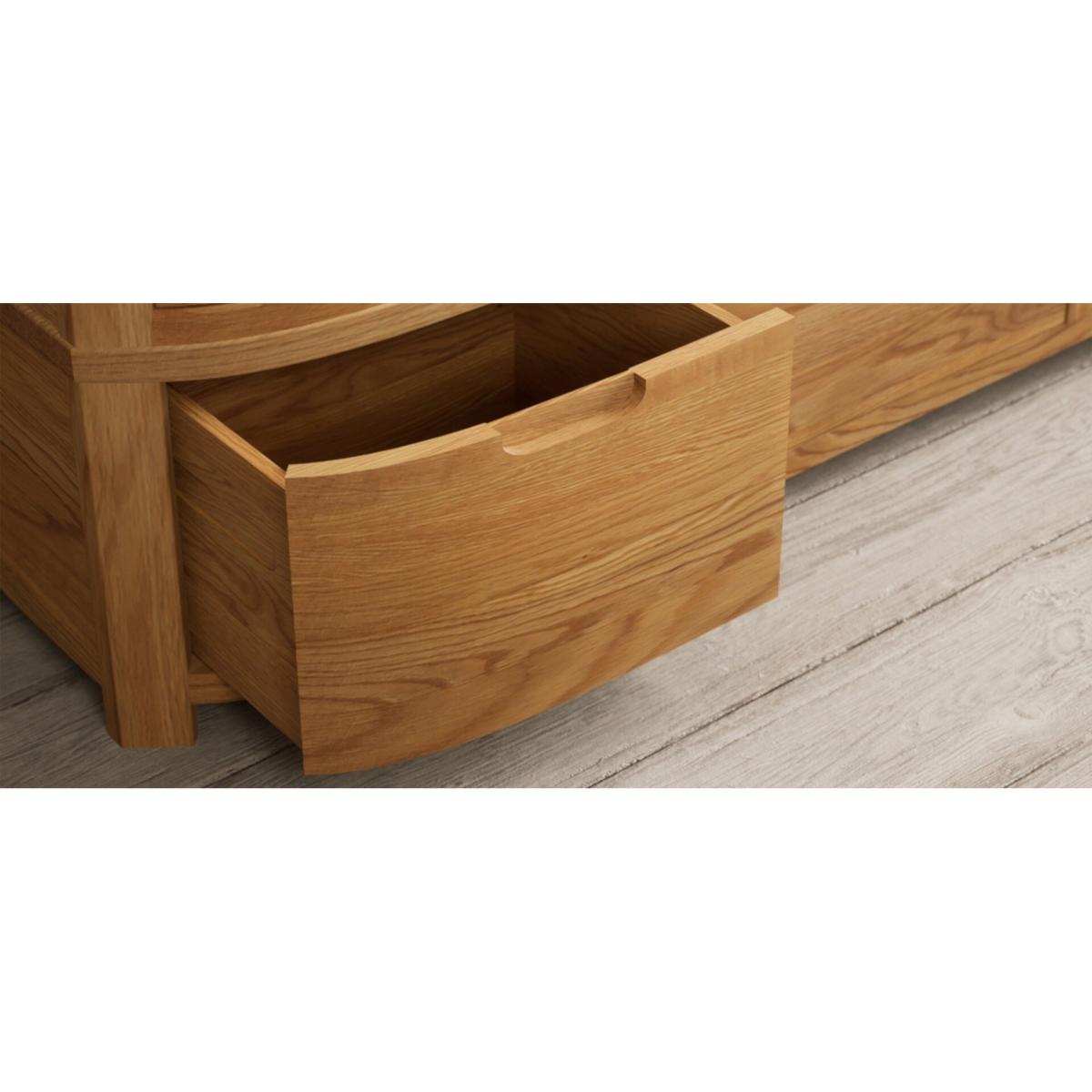 I’m a fan of this curved oak triple wardrobe for its clean lines, solid build and integrated drawers - it feels both substantial and refined without dominating the room. The gentle curve softens its profile, so it’s at home in Scandi-inspired spaces, contemporary schemes or even a modern farmhouse setting where you want a touch of natural warmth. Styling tips: balance its natural oak with off-white or muted grey walls, then add tactile accents like a woven rug or linen bed-cover to complement the grain. Inside, use matching wooden hangers and woven storage boxes in the lower drawers to keep everything organised and visually calm.