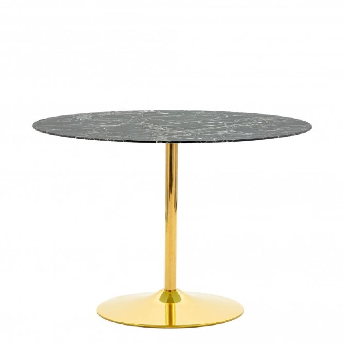 With a sophisticated round faux black marble glass top and smoothly curved gold base, this table is stunningly modern. Seating 4 people, it is great for a smaller space where style is still essential. Material:Iron / Glass. Colour/Finish: Black / Gold.