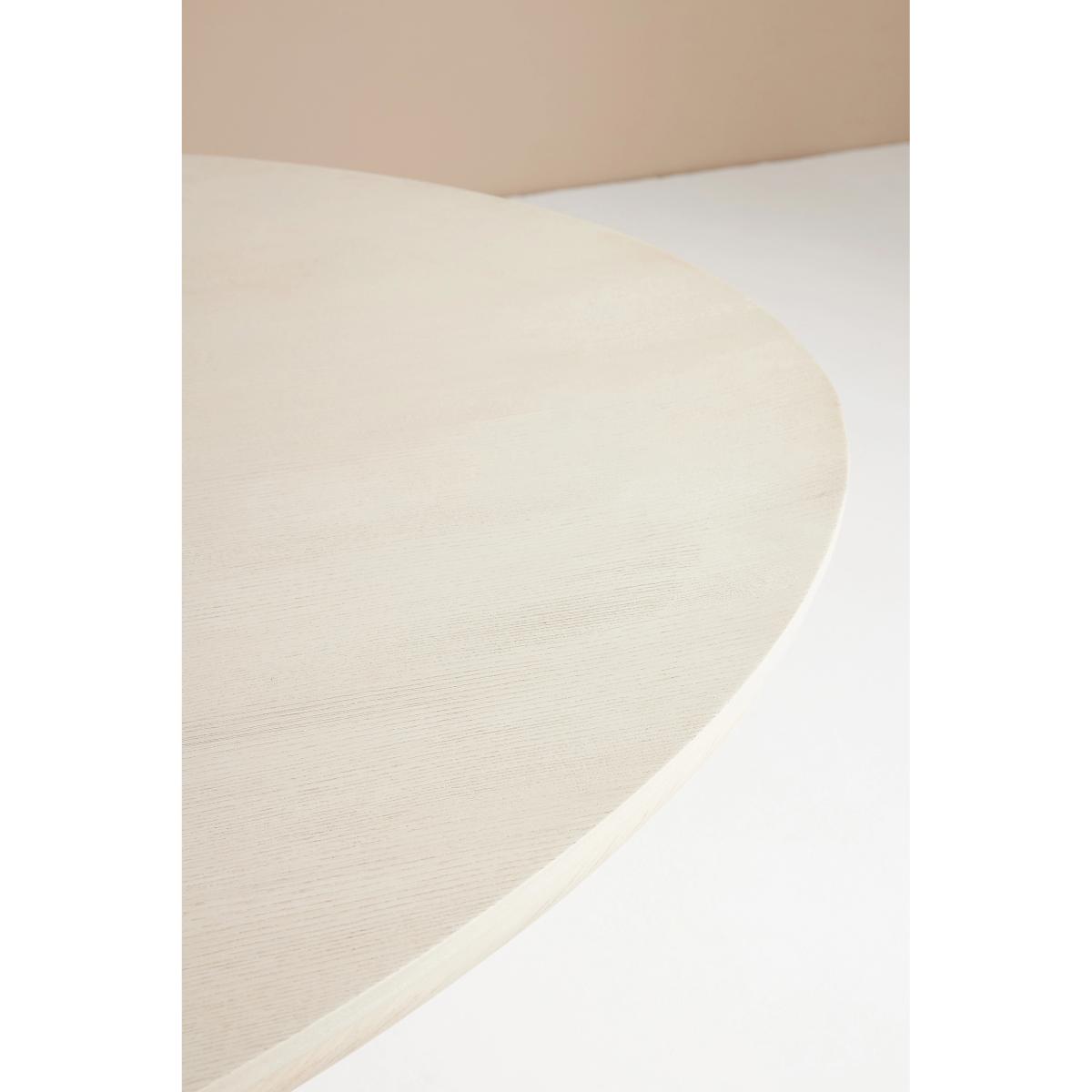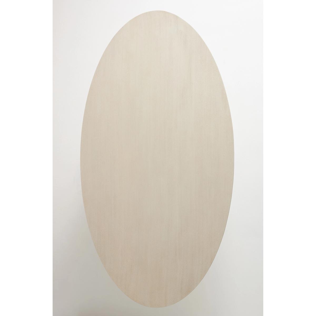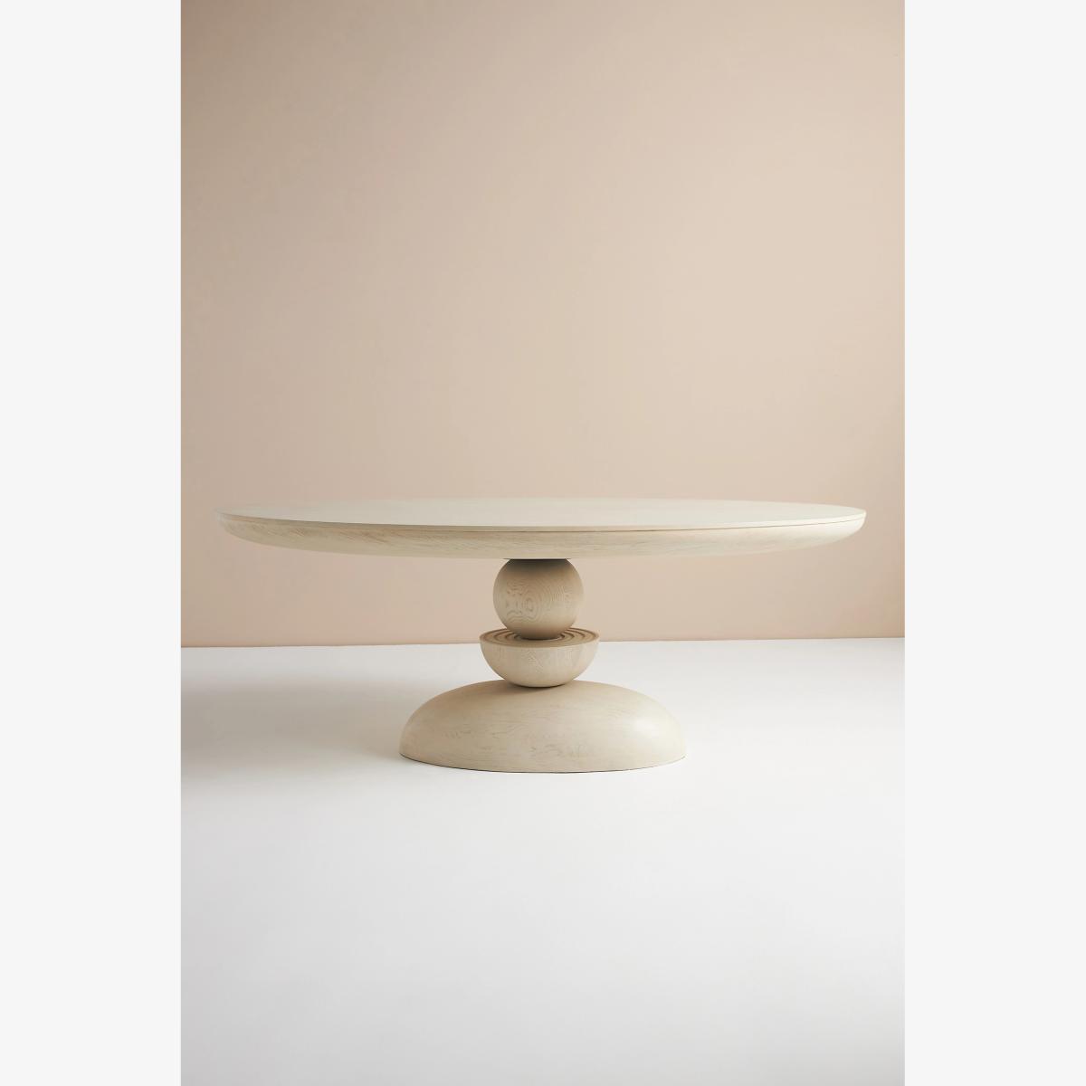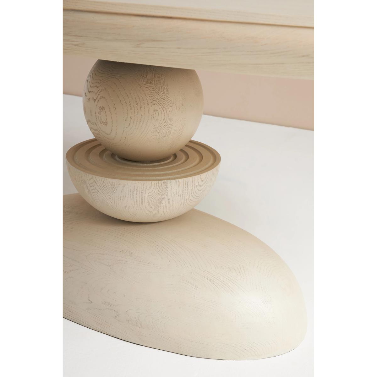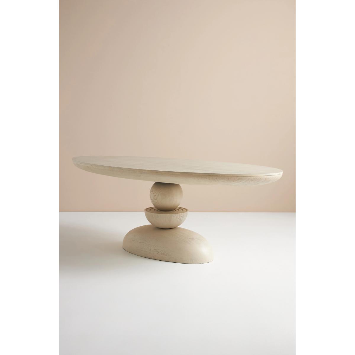 A sculptural, room-anchoring piece for an intimate or grand dining space, this striking table boasts meticulous craftsmanship and a clever design. With three rounded shapes appearing to be delicately balanced on top of each other, its base is artwork in itself, while a light blonde finish and ash wood veneer give it a contemporary flair worthy of display. * Blonde ash wood veneer dining table reinforced with engineered wood and resin post * Comfortably seats four to six people * Slight variation in natural wood texture will occur * Sealed with clear lacquer for protection * Wipe clean with damp cloth. Avoid using chemical cleaners * This piece is intended for indoor use * Imported
